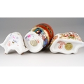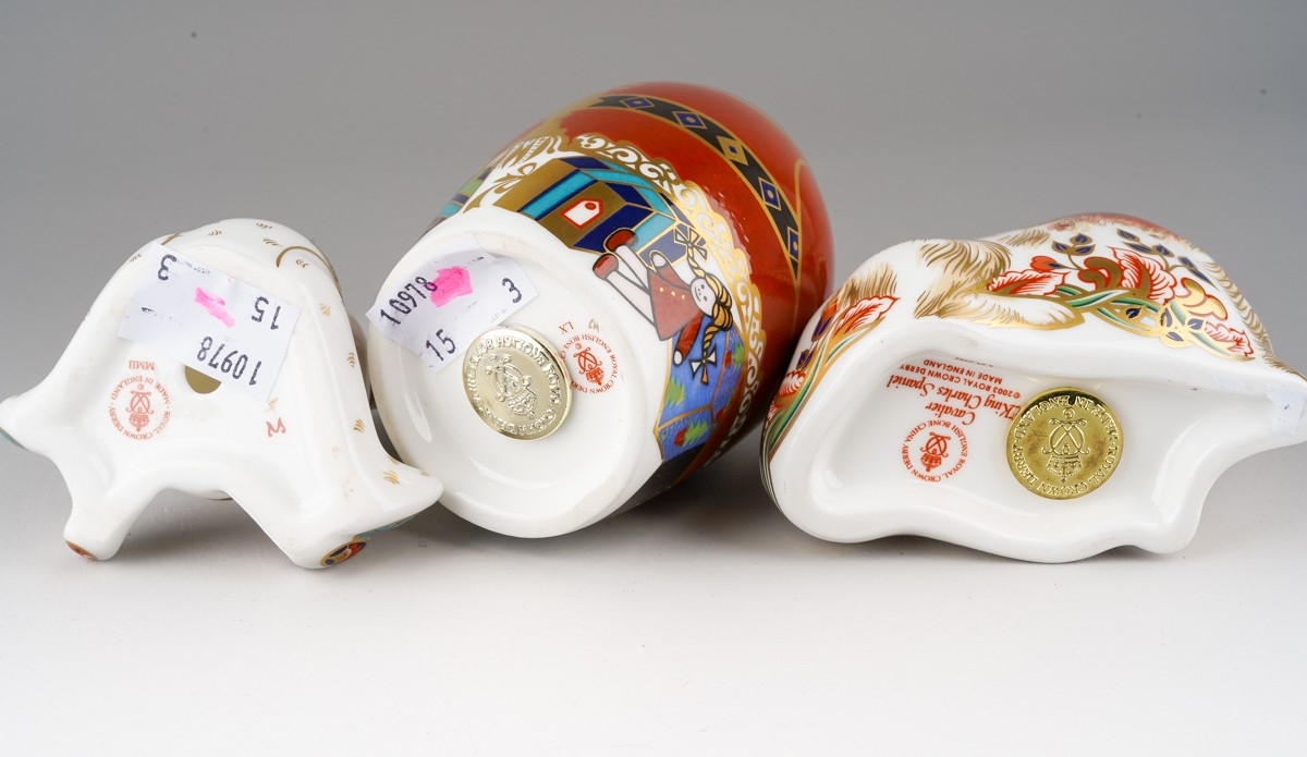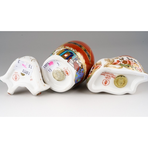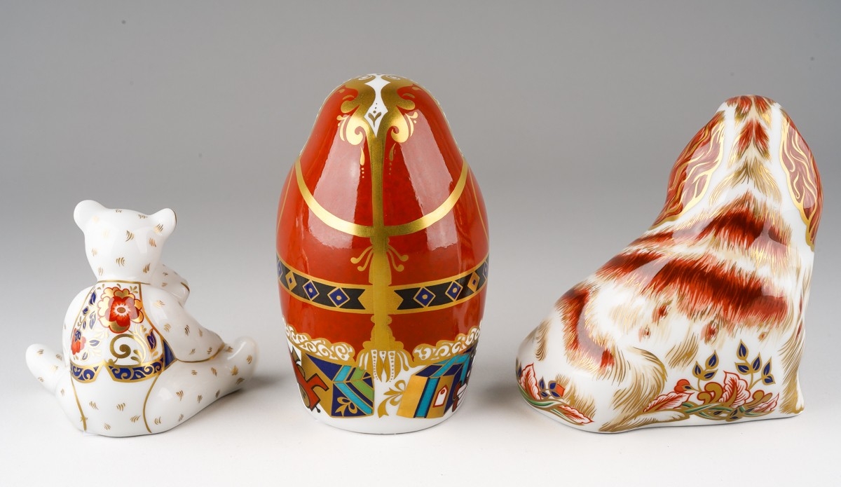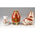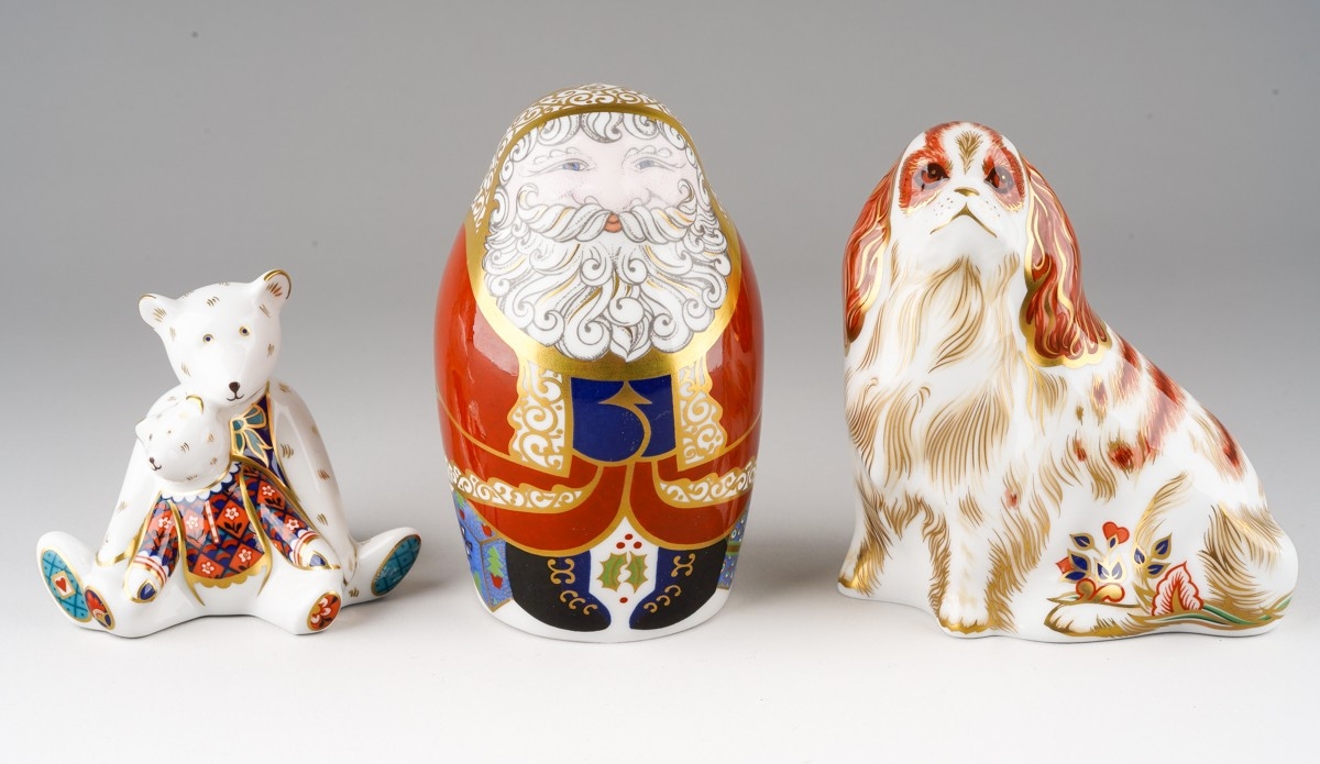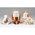 A Royal Crown Derby miniature two Teddy bears figure and two Royal Crown Derby paperweights, comprising Cavalier King Charles Spaniel and Father Christmas, both with gold stoppers, although the Father Christmas stopper is very pale, all three first quality and in good condition (3)