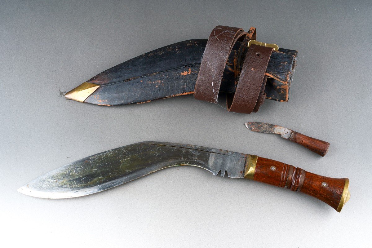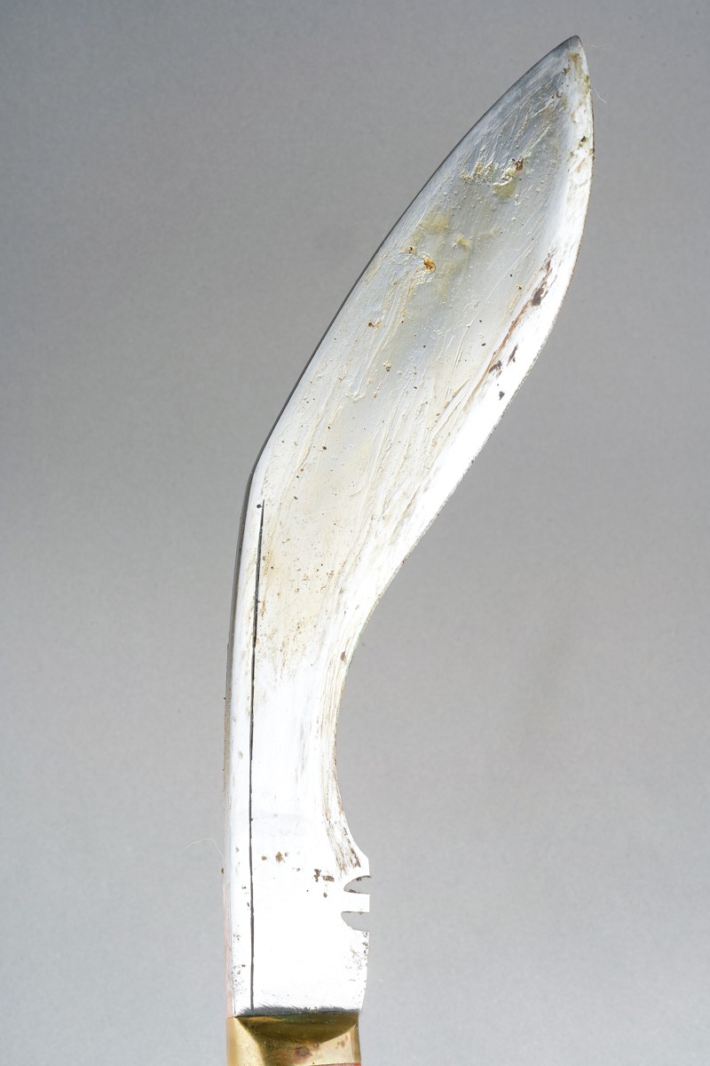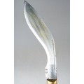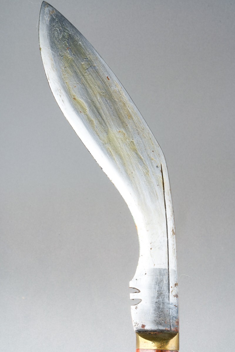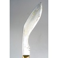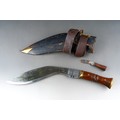 Gurhka Kukri Knife with single edged blade 290mm in length, no makers mark. Wooden grips with brass fittings. Overall length 415mm. Complete with black leather scabbard with one small knife.