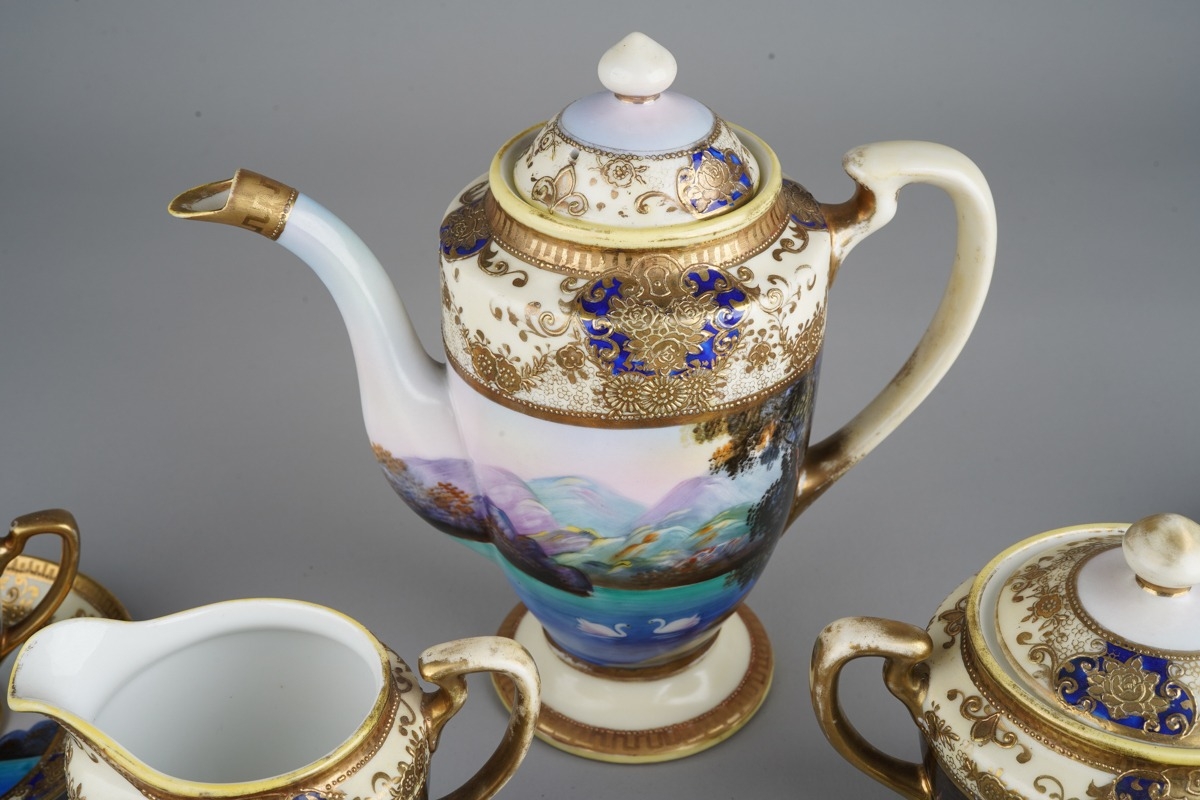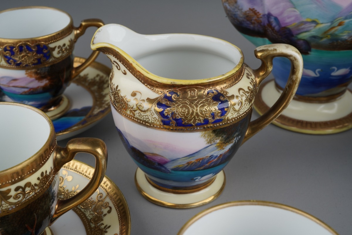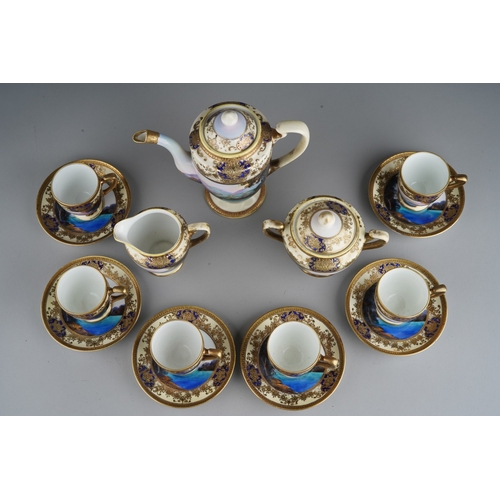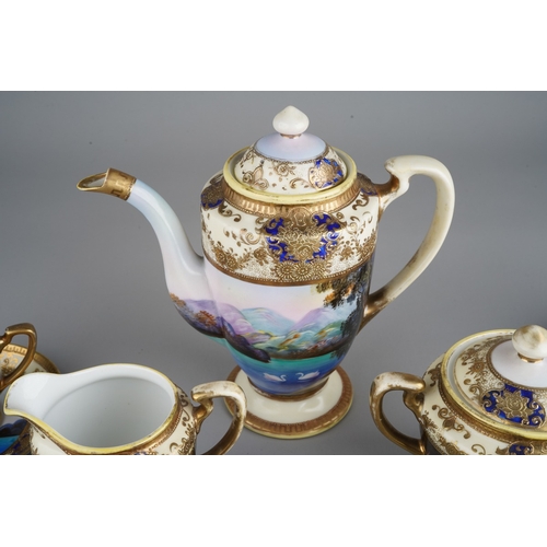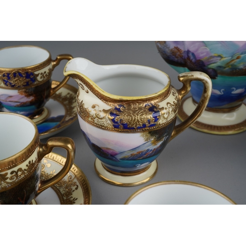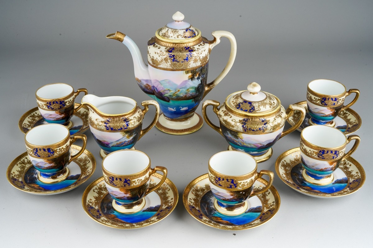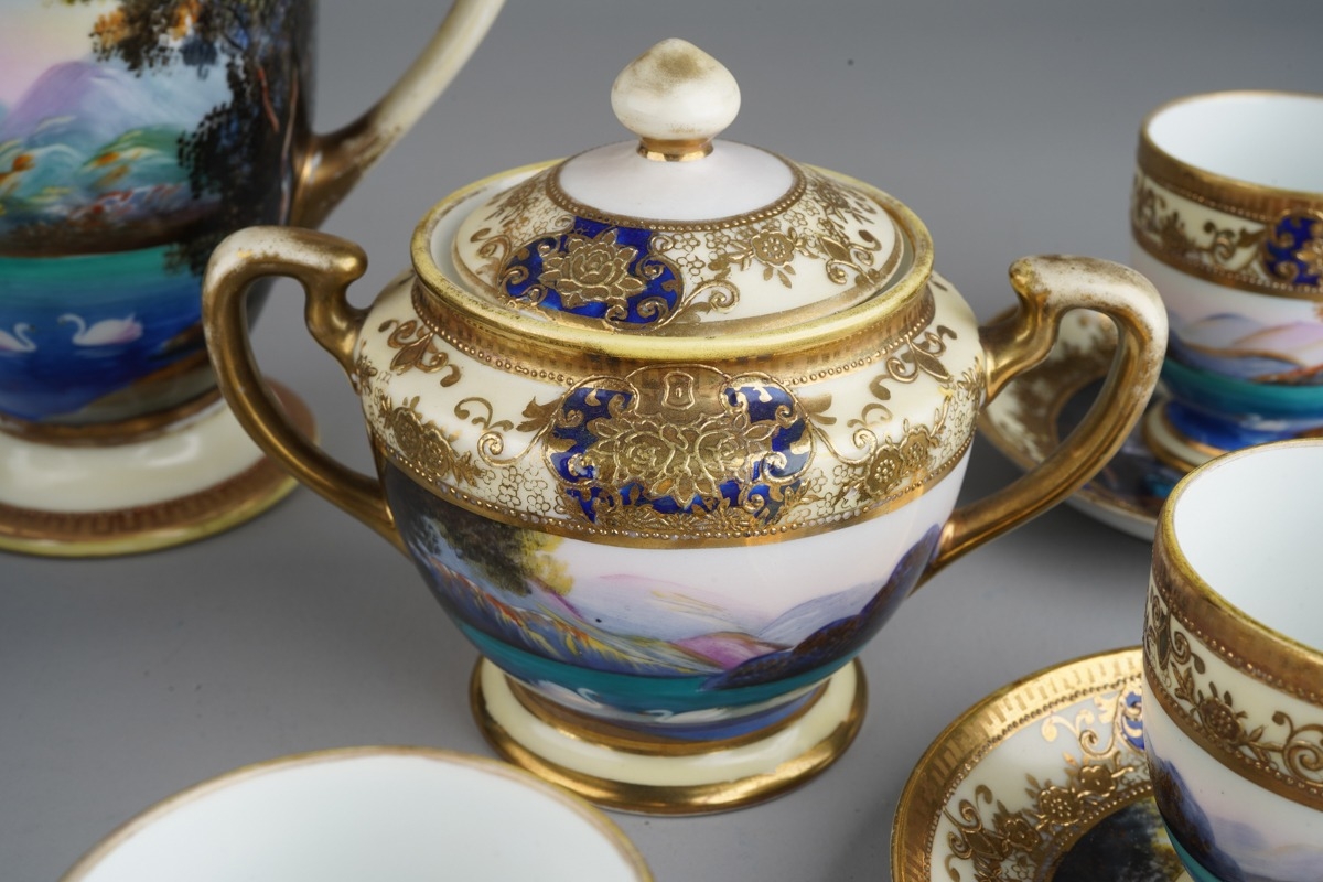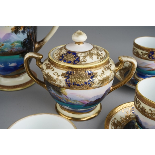 A Noritake fifteen piece coffee set, decorated with raised gilding and hand painted with lake scenes, the coffee pot, jug, sugar bowl and cups with the addition of swans, comprising coffee pt and cover, twin handled sucrier and cover, cream jug, six coffee cans and six saucers, all appear to be in good order but with some varying levels of wear to gilt handles and one cup doesn't ring when tapped, printed marks (15)