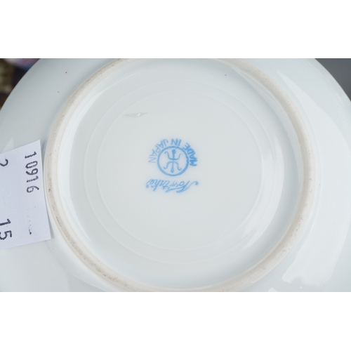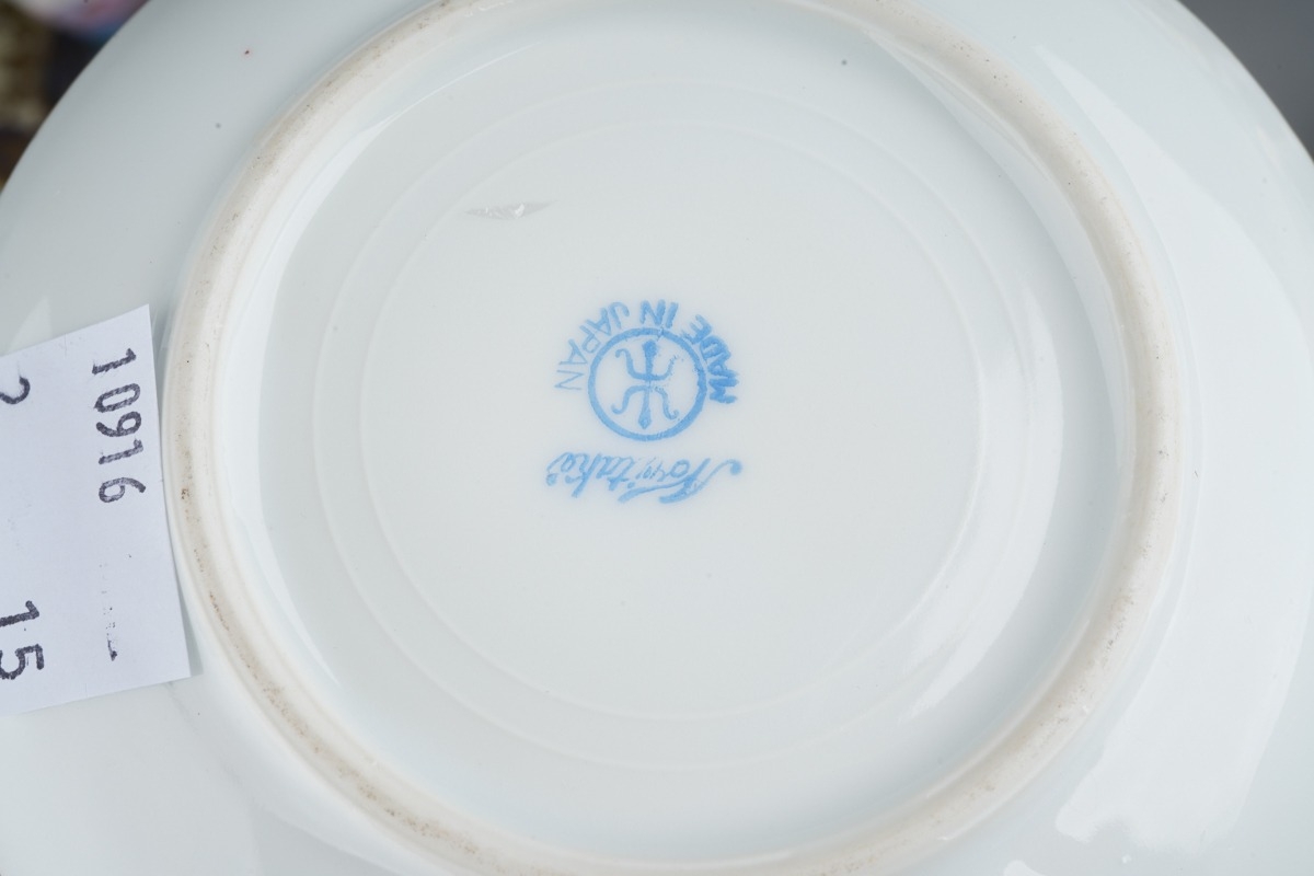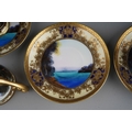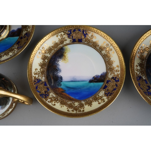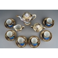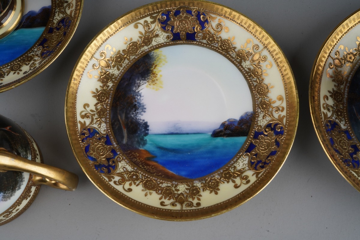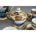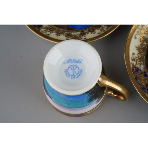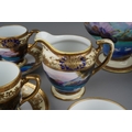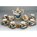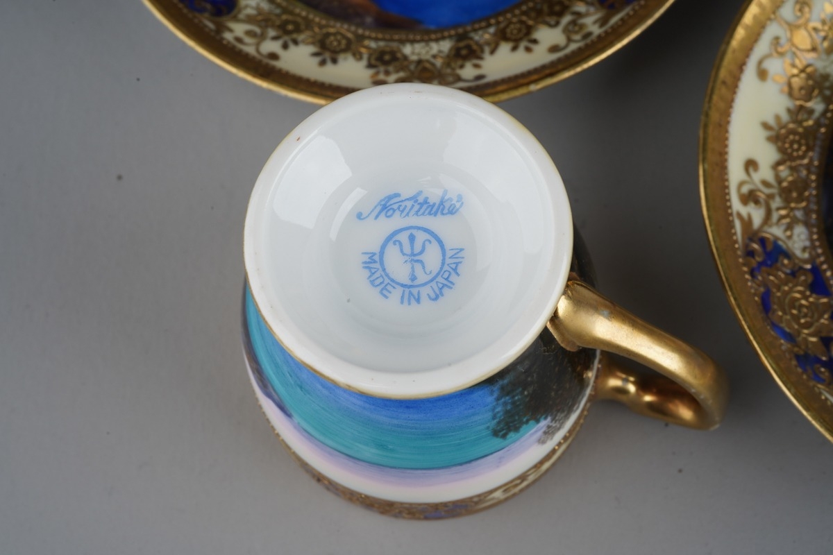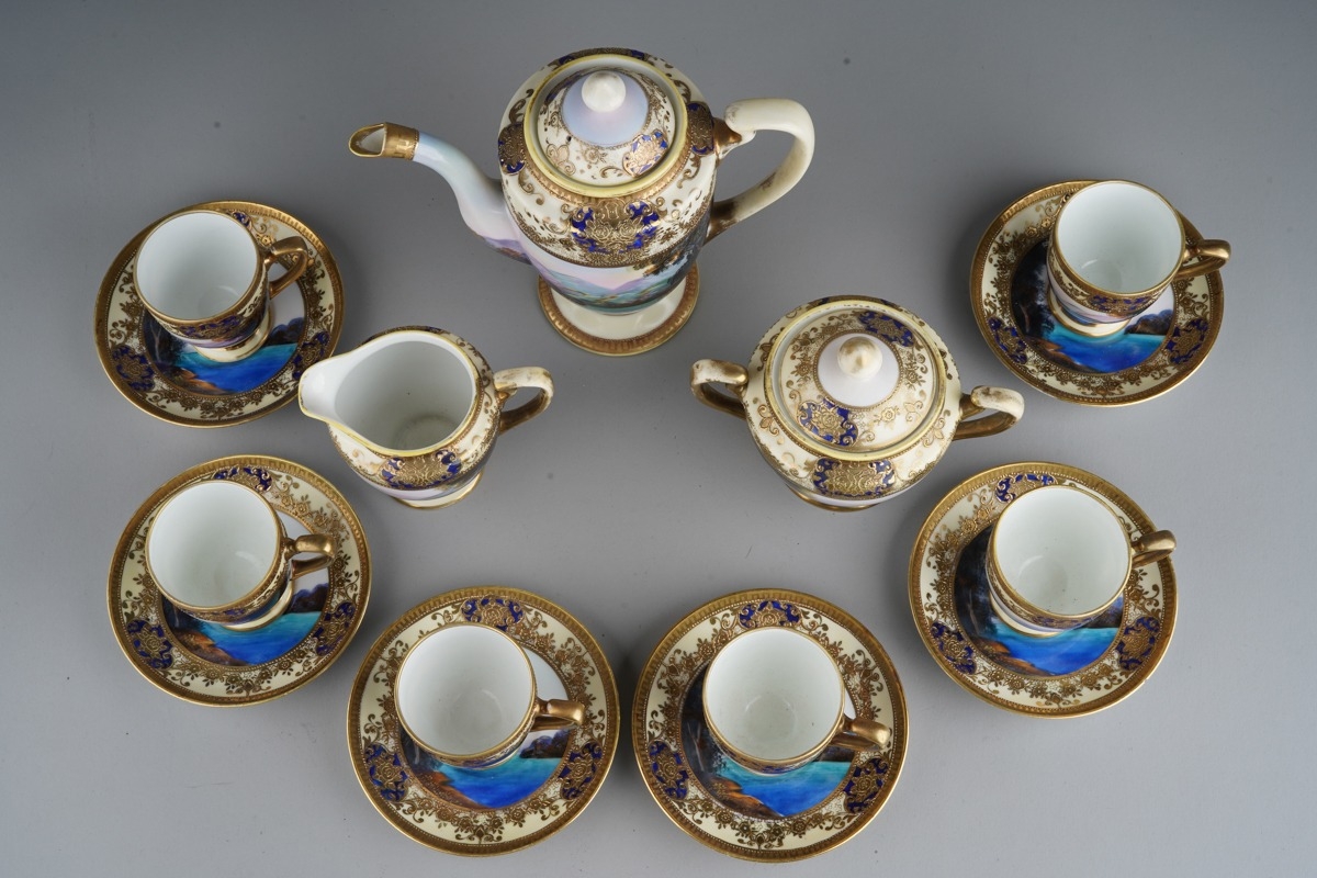 A Noritake fifteen piece coffee set, decorated with raised gilding and hand painted with lake scenes, the coffee pot, jug, sugar bowl and cups with the addition of swans, comprising coffee pt and cover, twin handled sucrier and cover, cream jug, six coffee cans and six saucers, all appear to be in good order but with some varying levels of wear to gilt handles and one cup doesn't ring when tapped, printed marks (15)