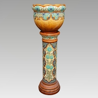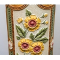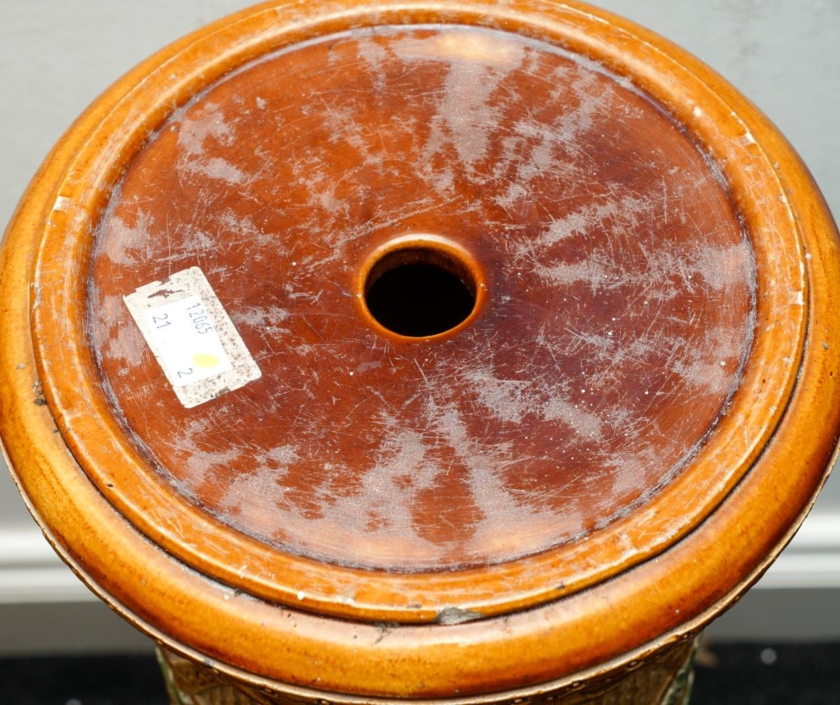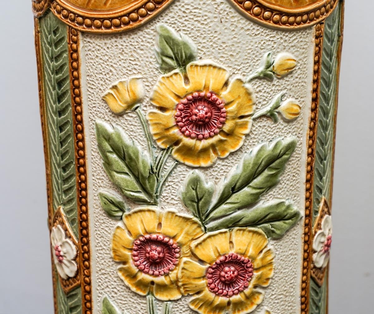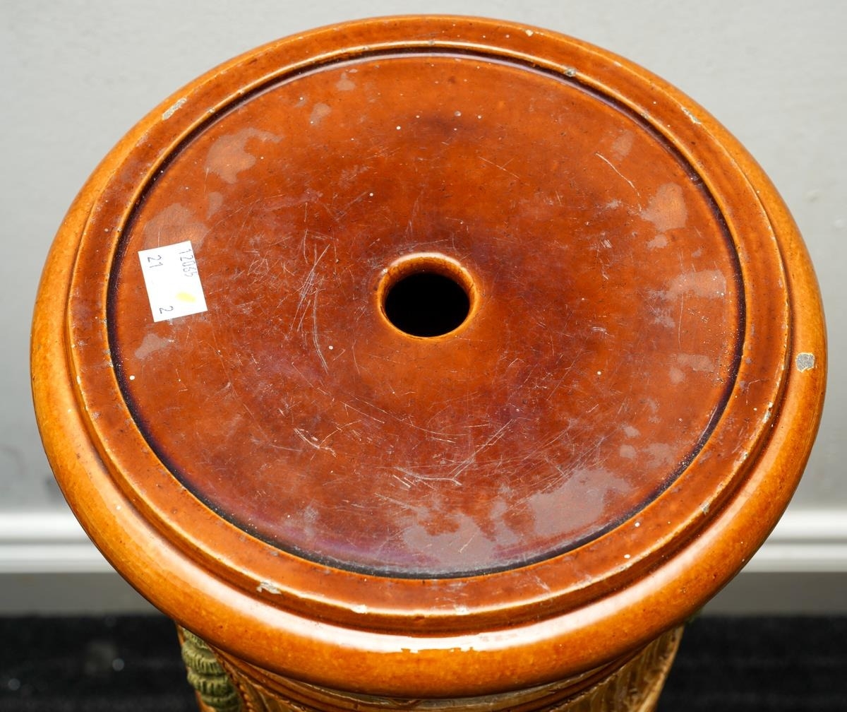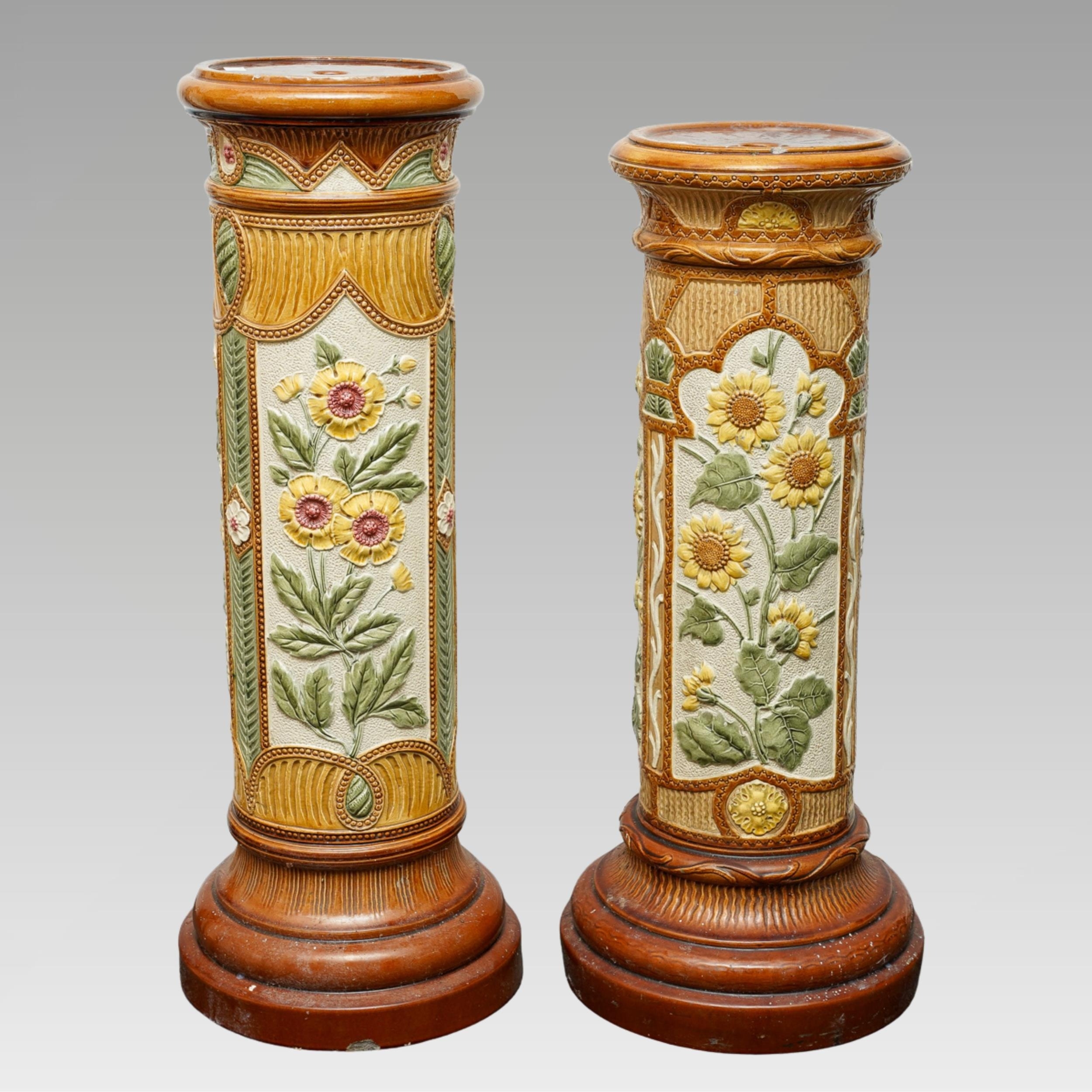 A Burmantofts Faience pedestal decorated with flowers and stylised shells within incised panels, impressed marks numbered 1984C, approx 79cm high together with a Victorian Faience pedestal, similar decoration with Sunflowers, impressed marks and numbered 1948, approx 74cm high [2]