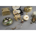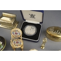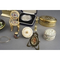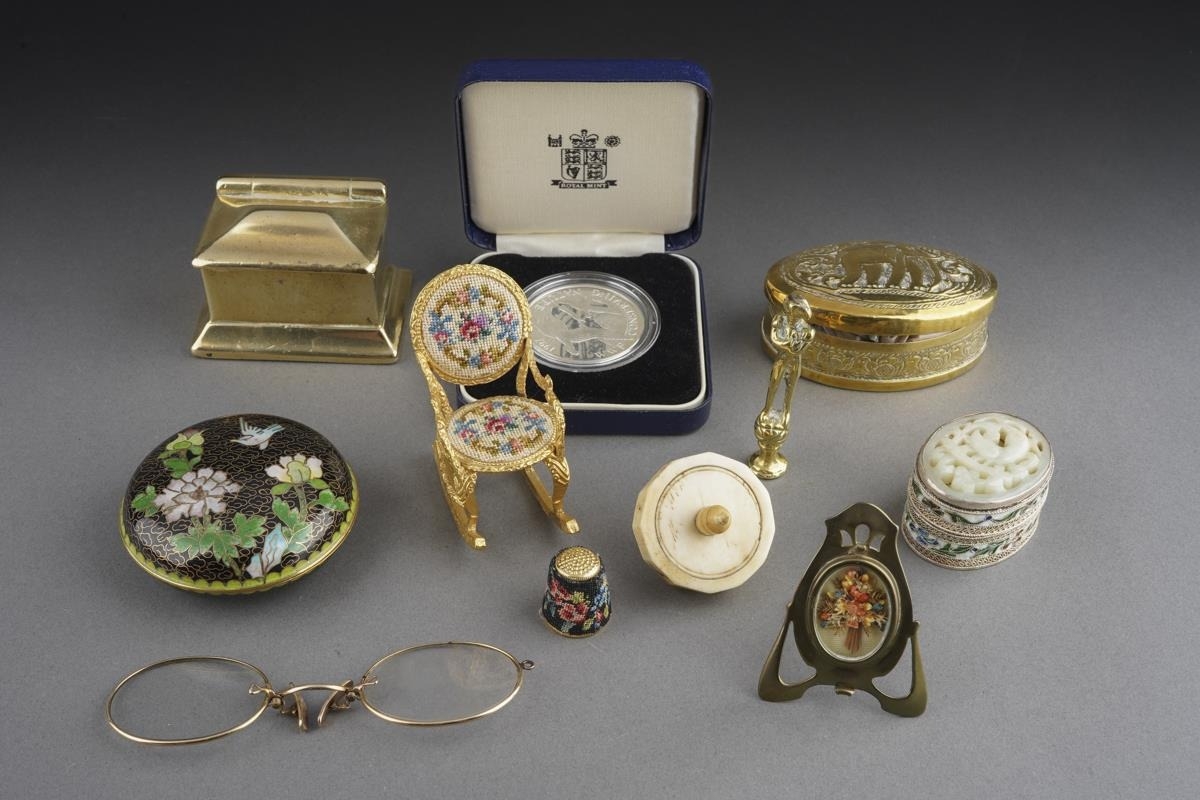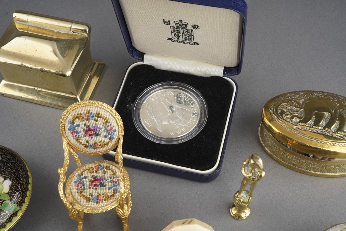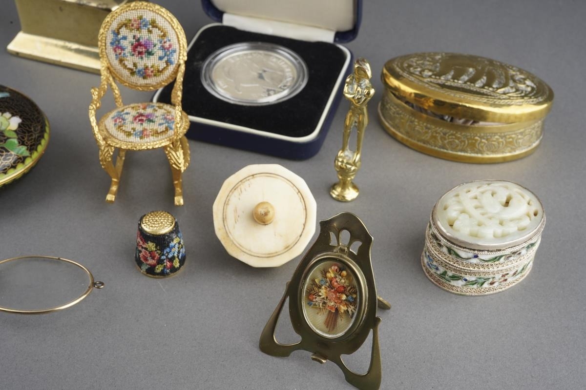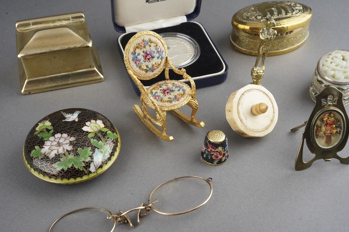 A parel of 19th and 20th century metal curios, etc, including a bone gaming spinner, a miniature bell metal desk casket containing brass hearts, an oval Indian brass spice tin and spices, a gilt metal petit point rocking chair, a miniature Art Nouveau brass frame, a hardstone and champleve oval pill box, petit point thimble, etc (1 box)