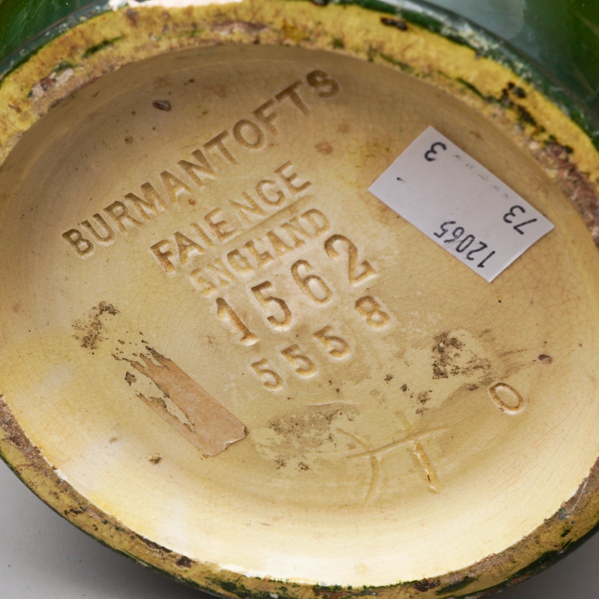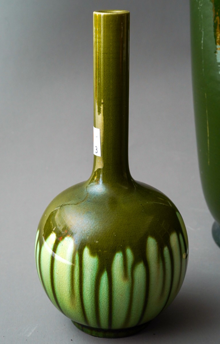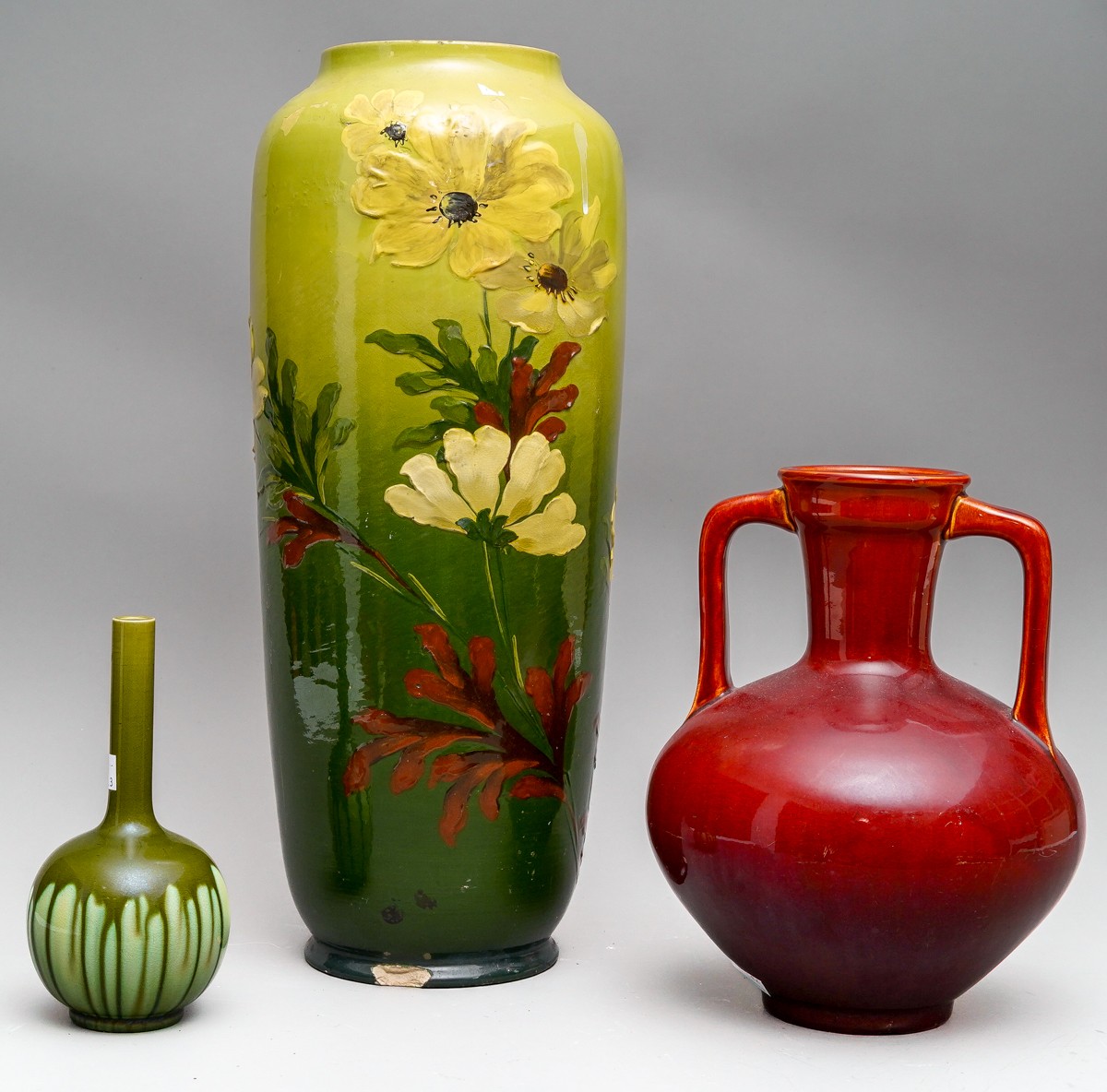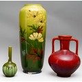 A Burmantofts red glazed twin handled vase and cover, pattern no.1819, impressed marks, height 26cm, together with a Burmantofts Faience baluster vase, numbered 1562 5558, impressed and incised marks, chipped and restored, height 45cm and a small Burmantofts onion shaped vase with streaked green glaze, number 531, impressed and painted marks, height 19cm (3)