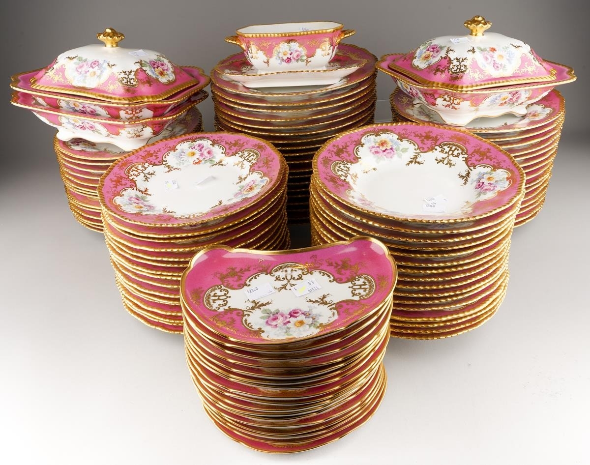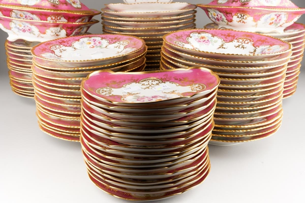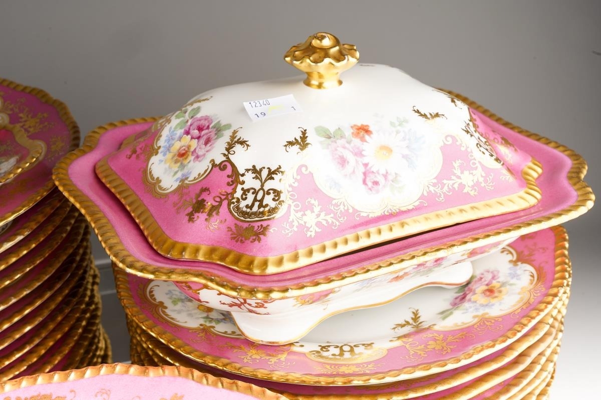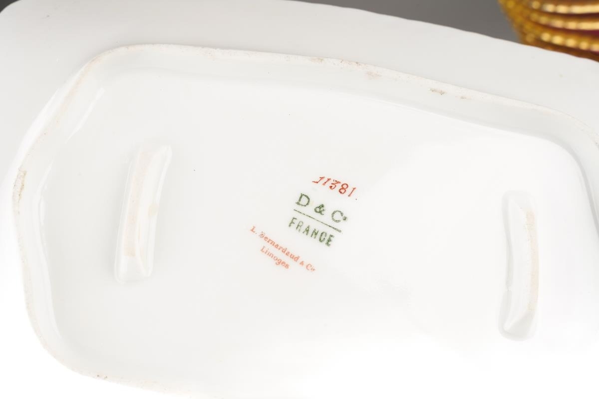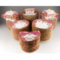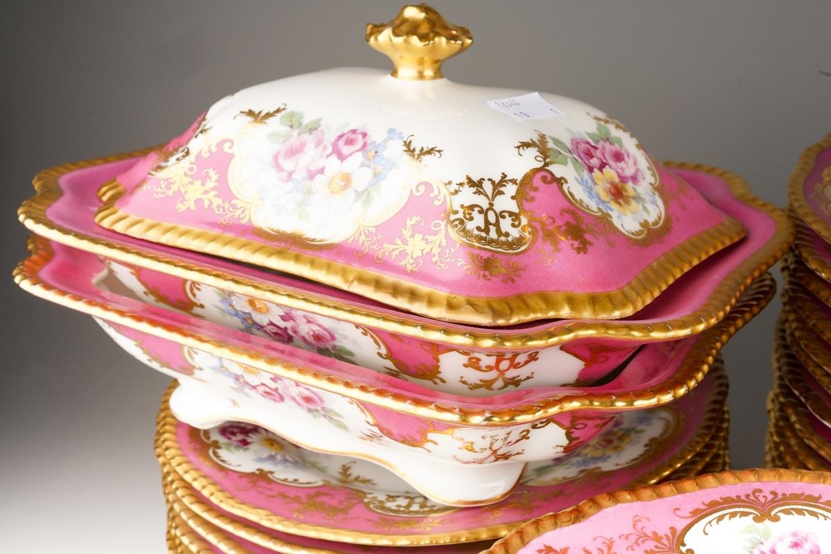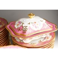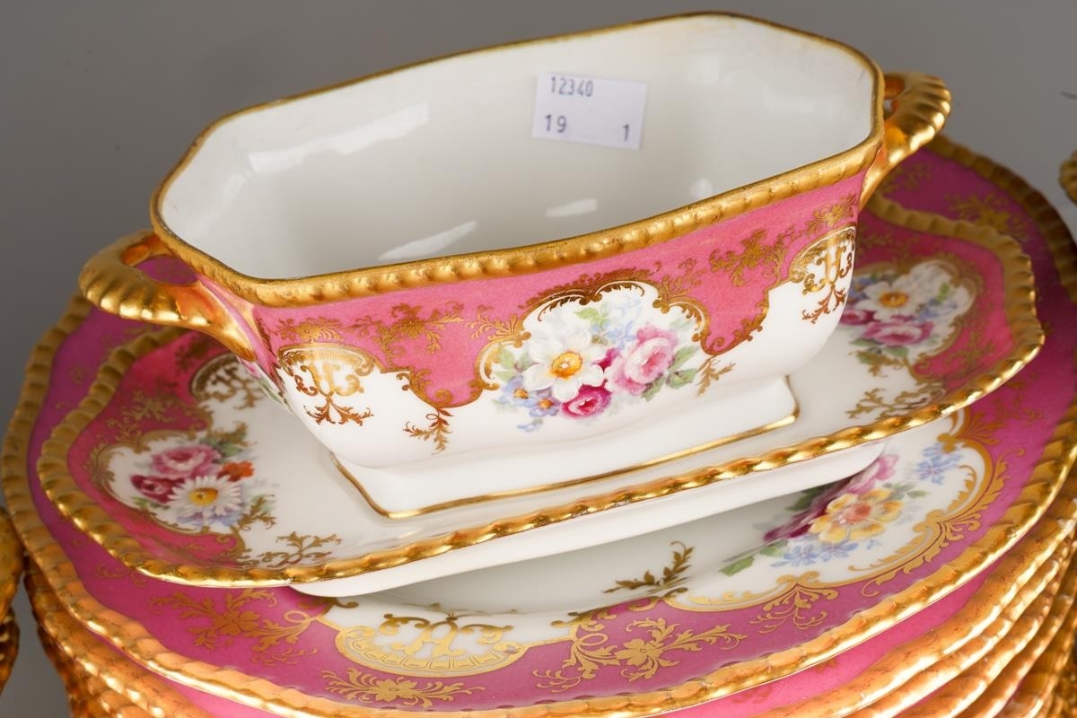 An extensive Limoges (D&C/L Bernaudaud & Co) part dinner service, scalloped gilt edges with Pompadour pink borders decorated with floral bouquets, gild scrolls and foliage, plain white reserves, all stamped to include: 34 dinner plates, 29 lunch/dessert plates, 16 soup bowls, 17 crescent shaped sides plates, two tureens and covers, one tureen base and a sauce tureen [Q]