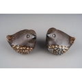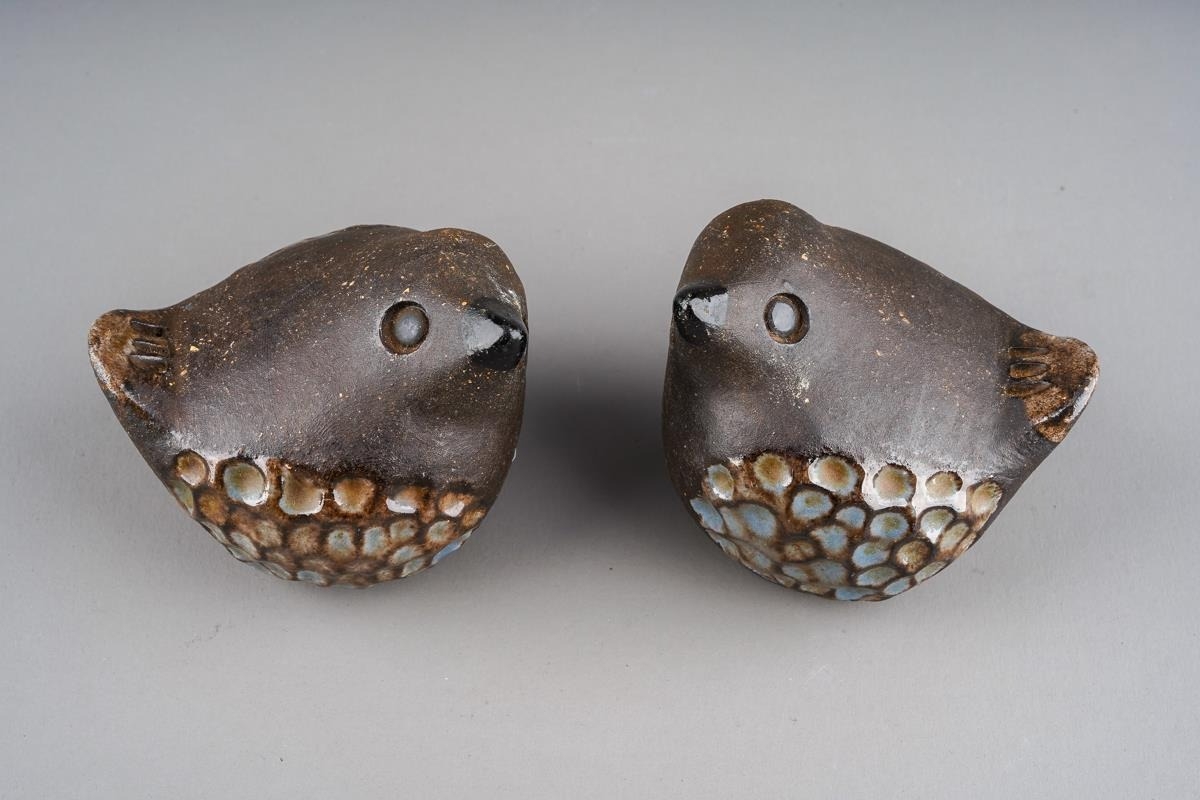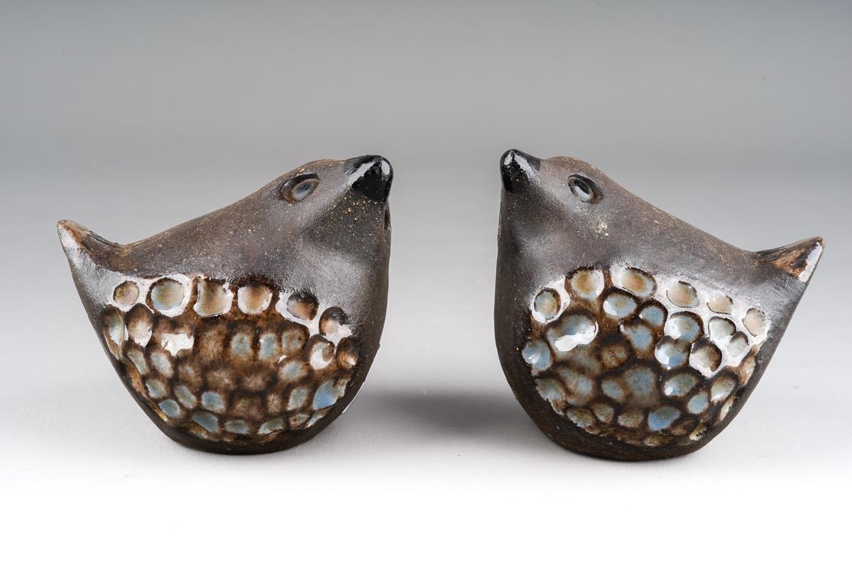 A pair of Mid-Century Swedish pottery birds in blue and brown with feather detailing designed by Bengt Wall for Wall Trosa Ceramics, both stamped to undersides [2]