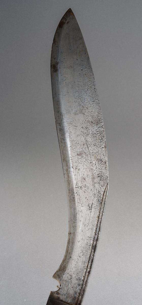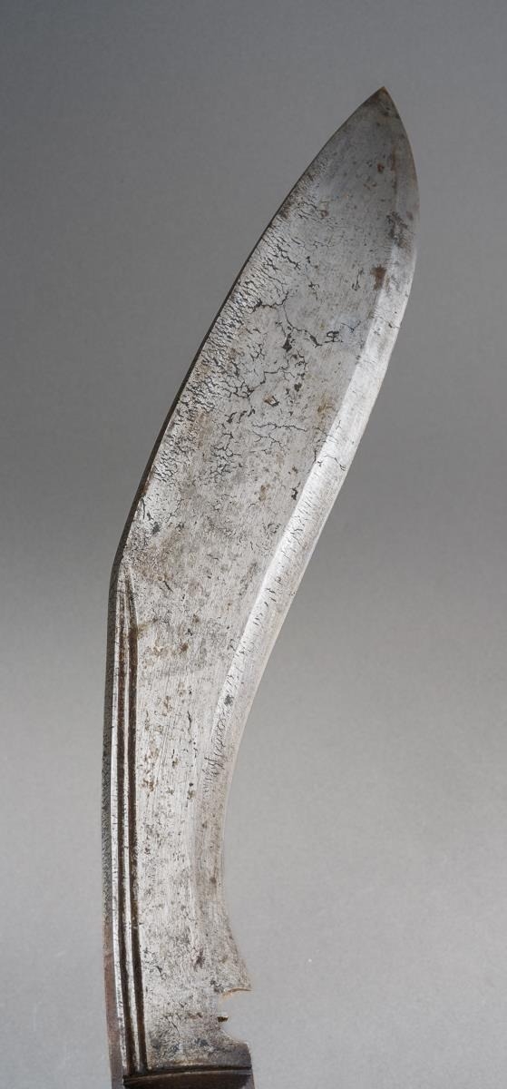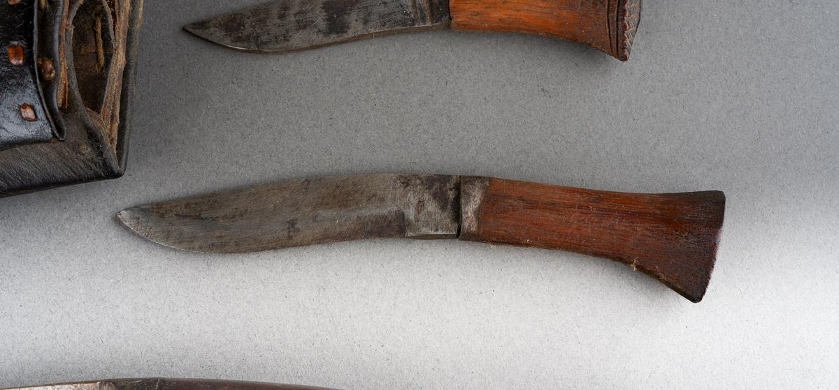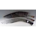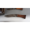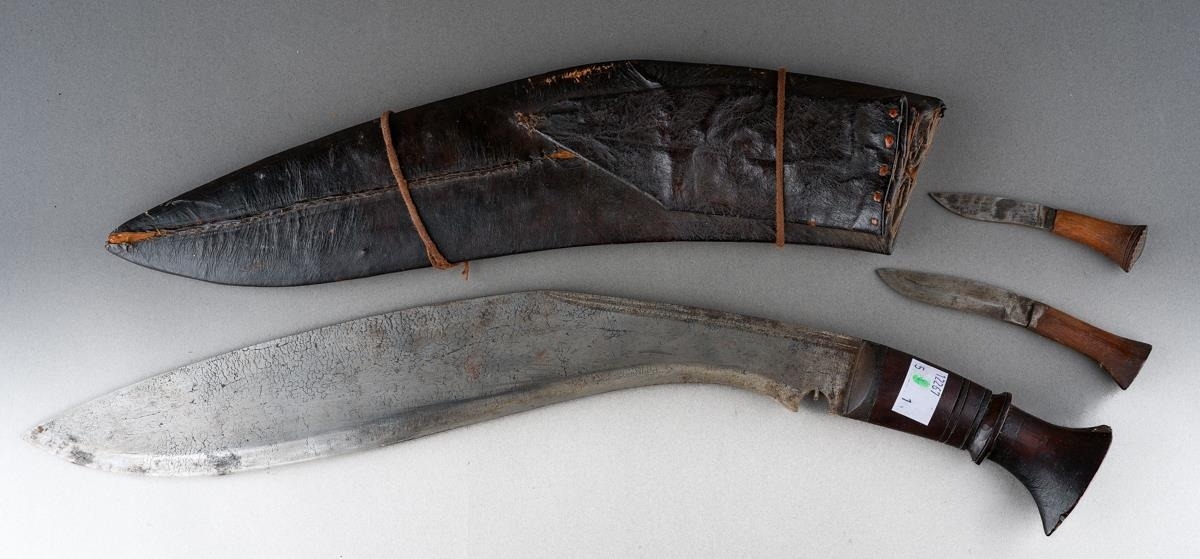 A Kukri with wooden grip and steel blade, in leather scabbard with two skinning knives [1]