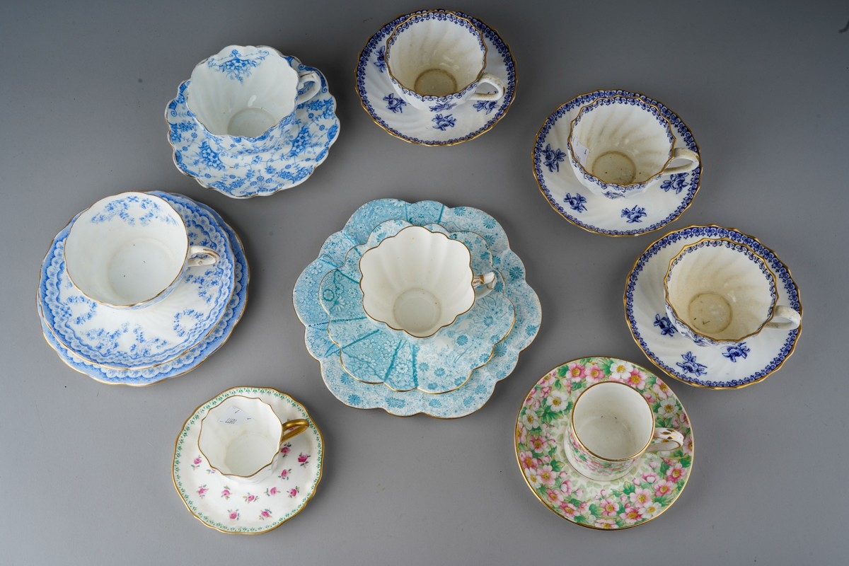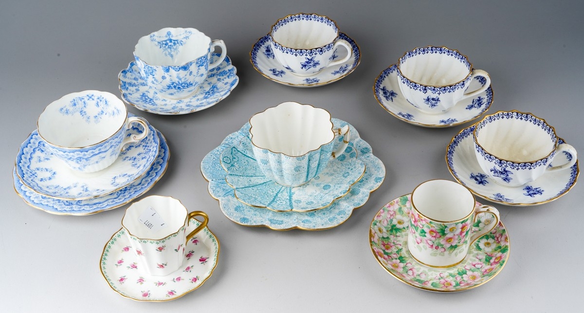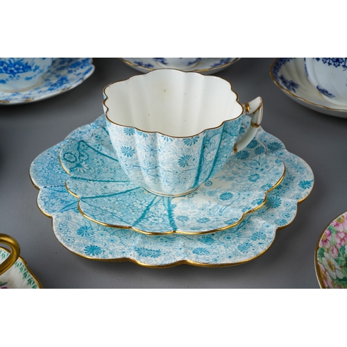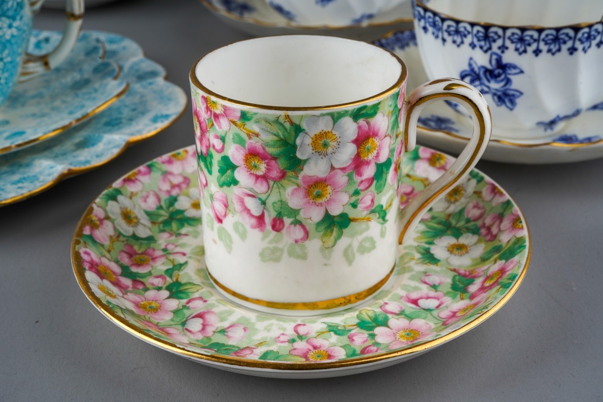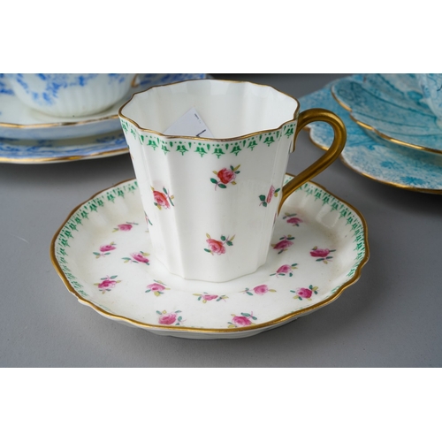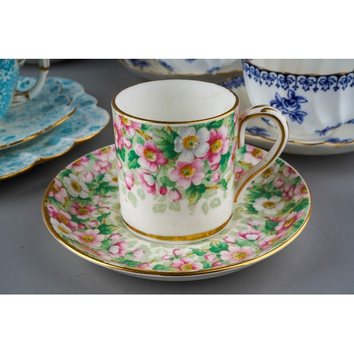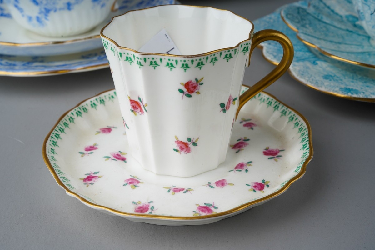 A collection of late Victorian and early 20th century tea cups, coffee cans and saucers, including a Wileman & Co trio in pale blue, a Copeland fluted rose bud coffee can and saucer, etc (20)