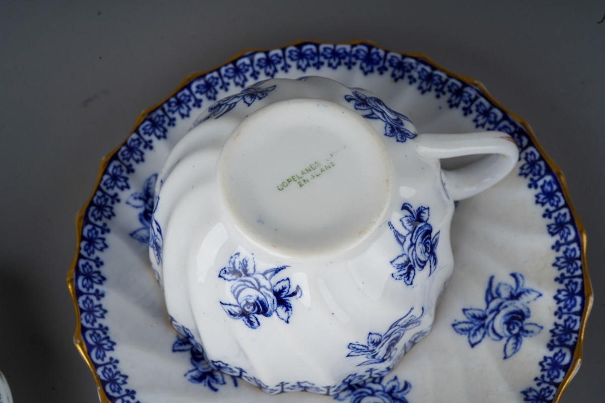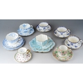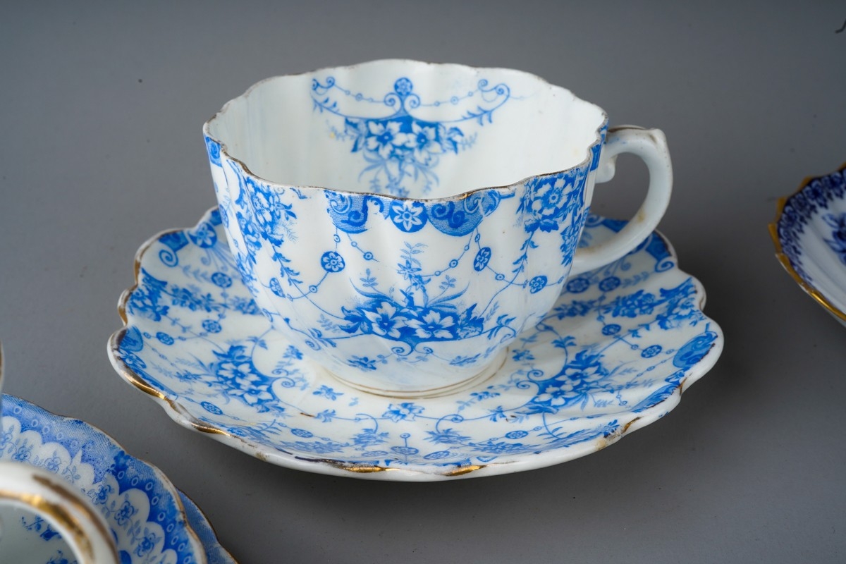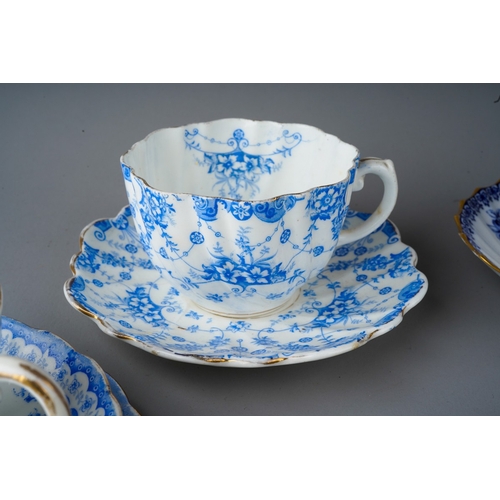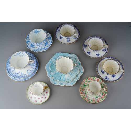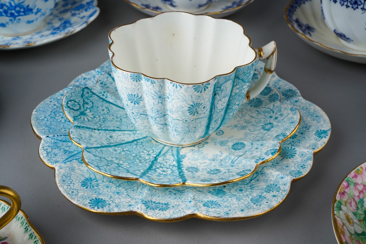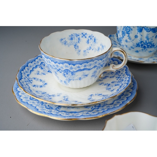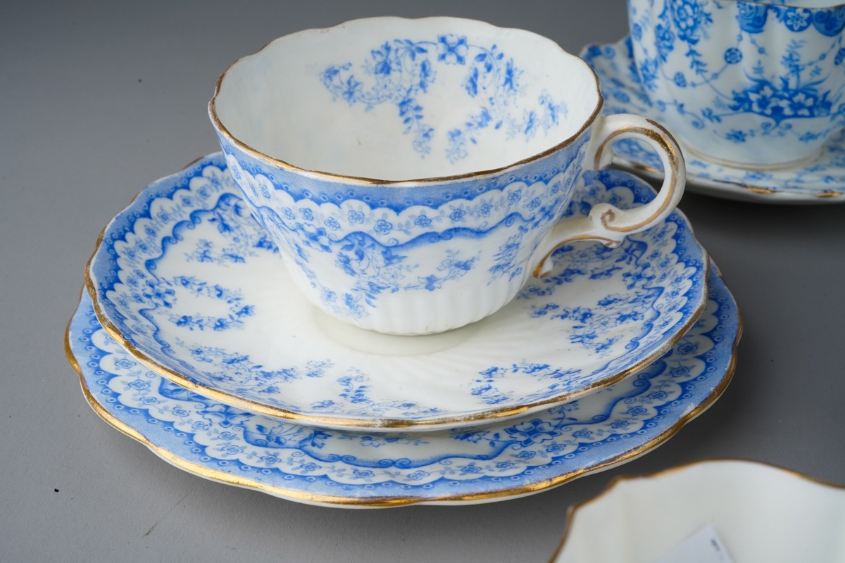 A collection of late Victorian and early 20th century tea cups, coffee cans and saucers, including a Wileman & Co trio in pale blue, a Copeland fluted rose bud coffee can and saucer, etc (20)