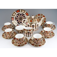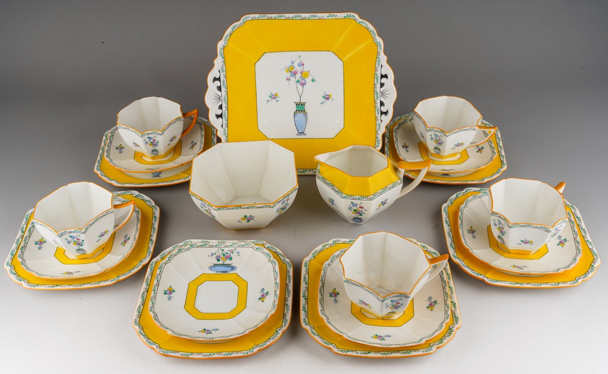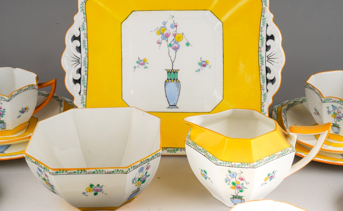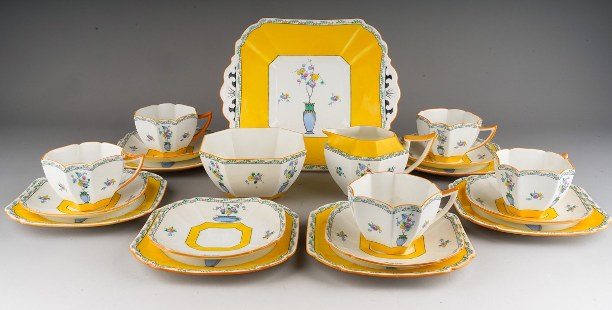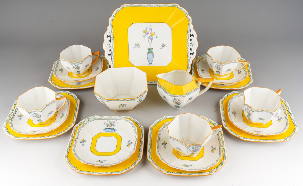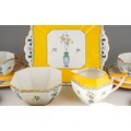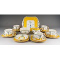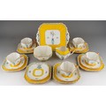 A Shelley Art Deco tea set in yellow, decorated with urns and flowers, RD number 723404 pattern 11609 comprising of 5 cups, 6 saucers, 6 side plates, milk, sugar and a cake plate