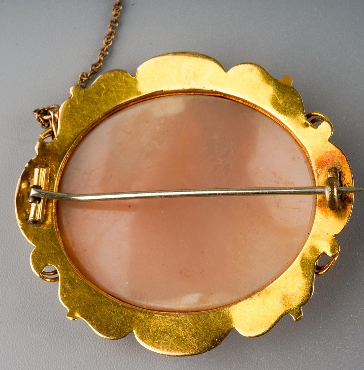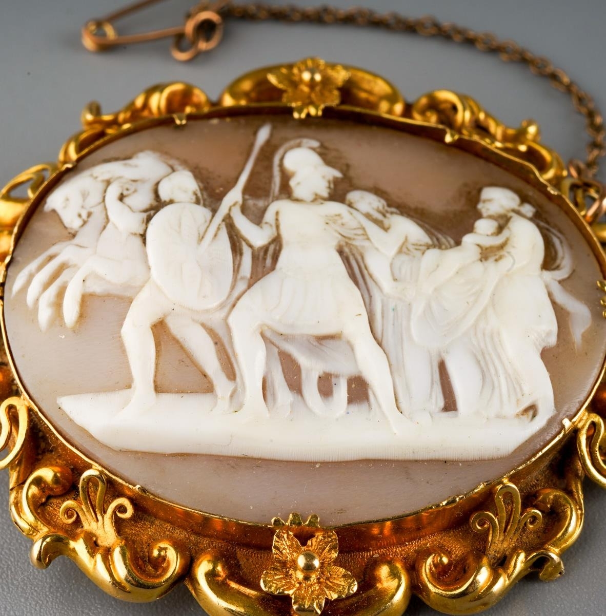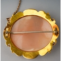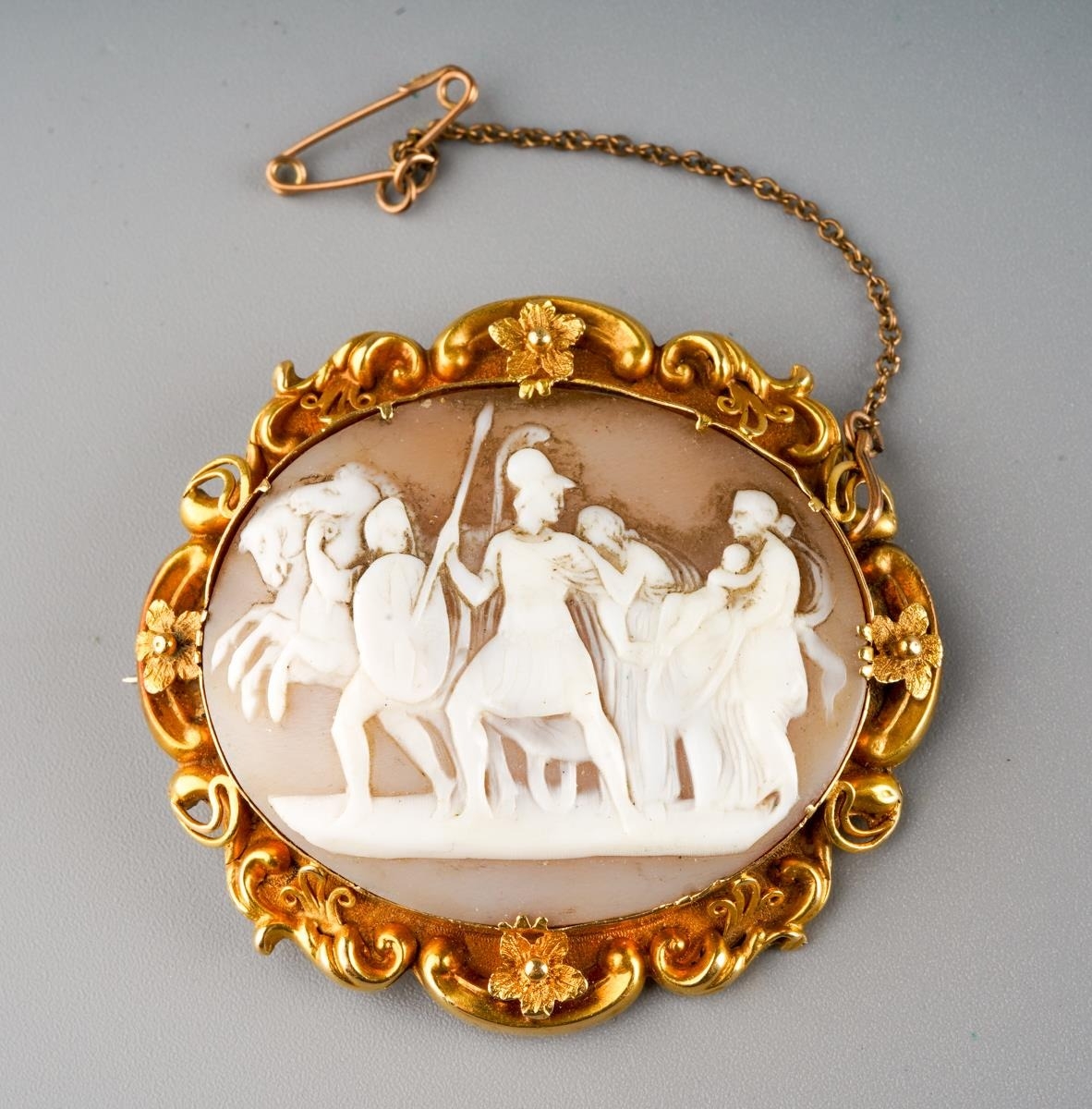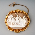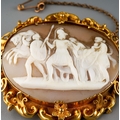 A late 19th century yellow metal mounted cameo brooch, the oval cameo with Classical chariot scene, the mount of foliate scrolls with floral detail, metal untested, 50mm x 45mm. Gross weight 14.4g