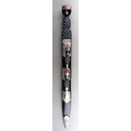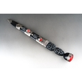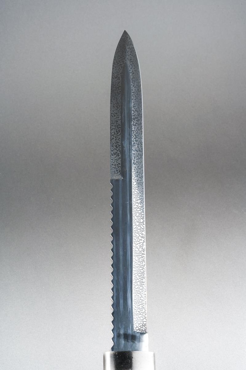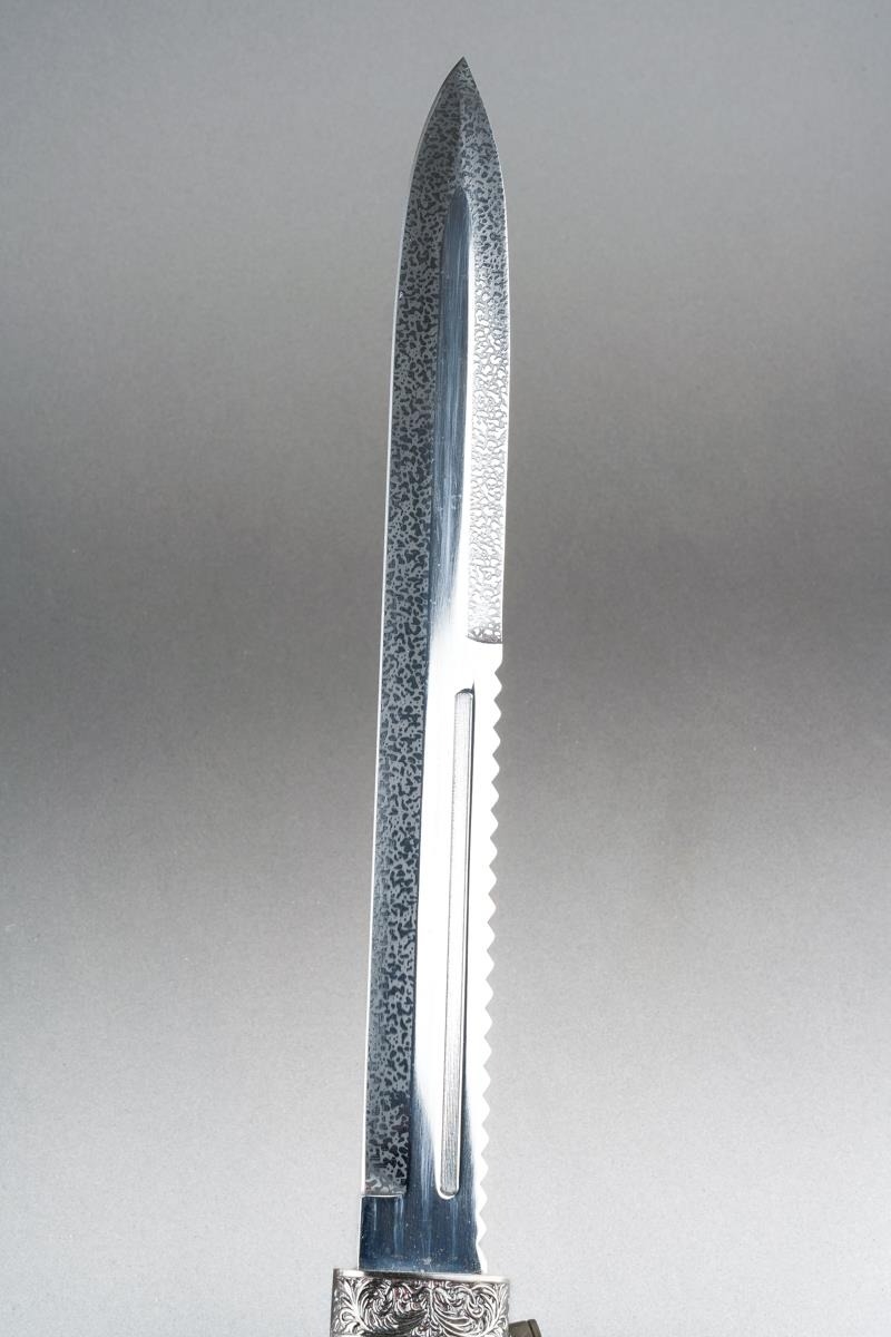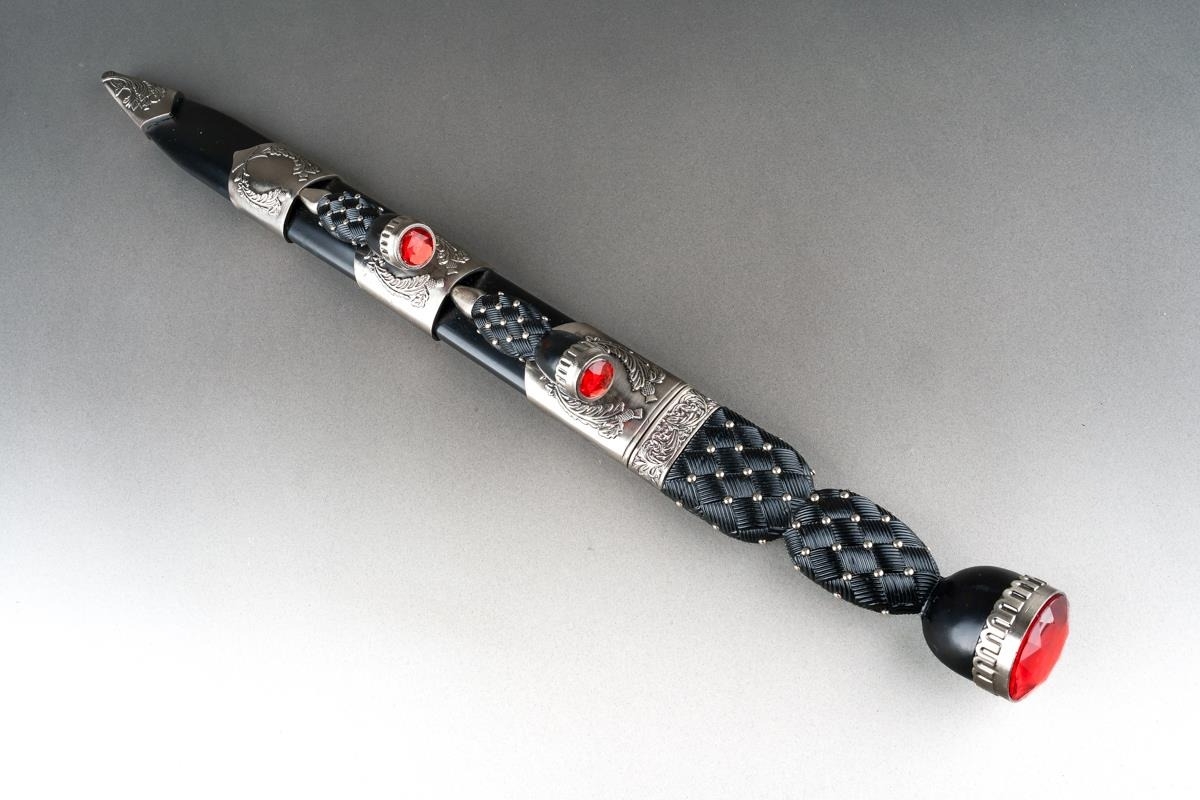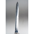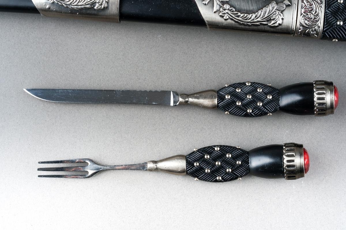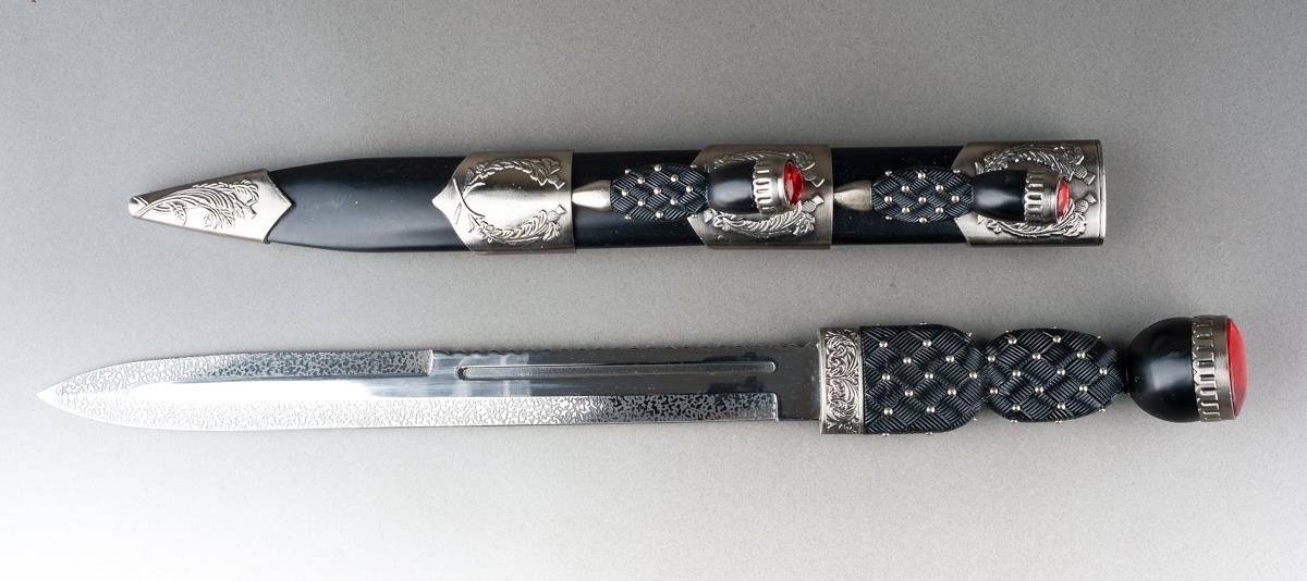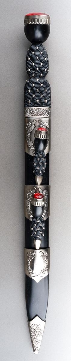 Scottish Dirk with fullered double edged blade 293mm in length, no makers mark. Black resin grip. Overall length 445mm. Complete with scabbard with knife and fork.