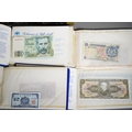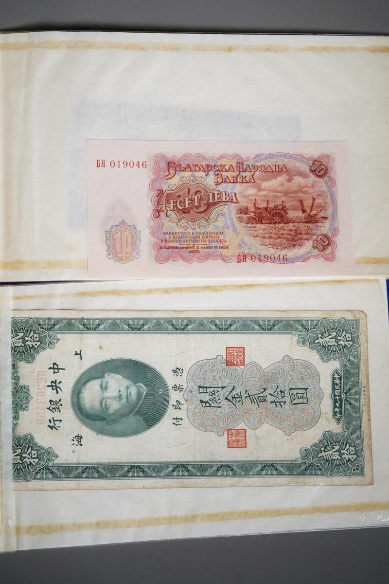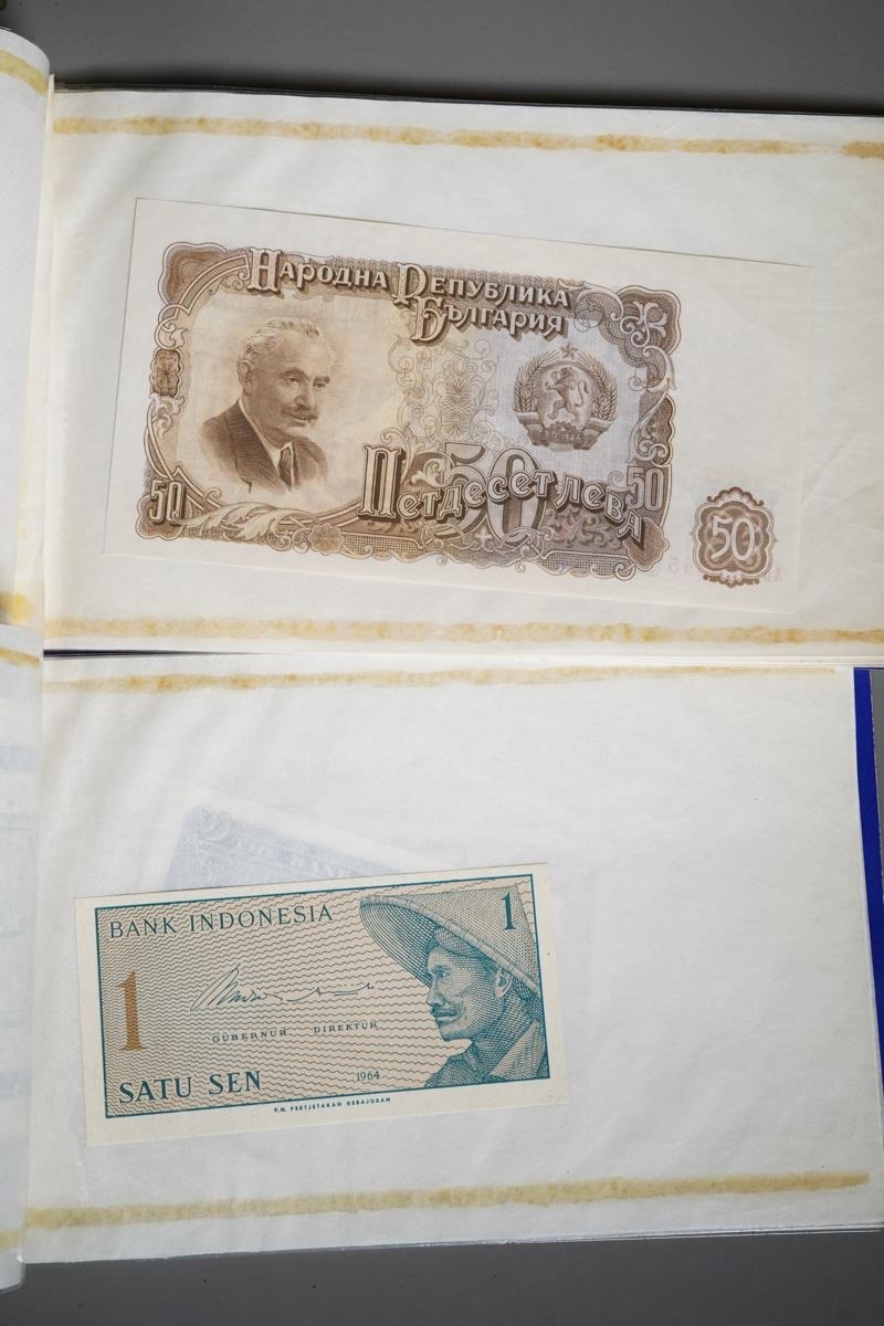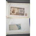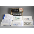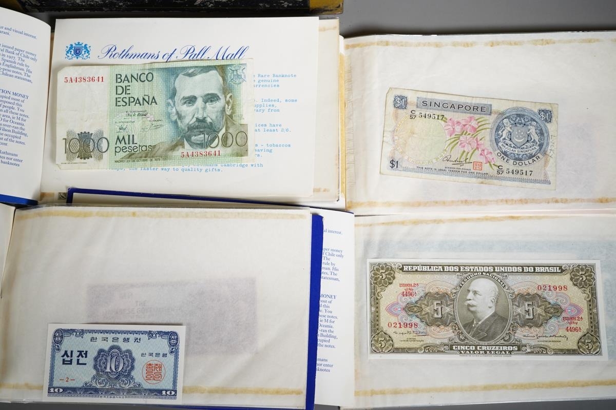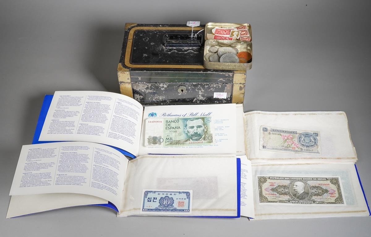 Four Rothmans of Pall Mall "Collections of Rare Banknotes" folders, containing 19 banknotes in sleeves and one loose, including Brazilian, Bulgarian, Japanese, Chinese, Indonesian and others, together with a vintage cash box and a small tin containing British and foreign coins, including 3d and three QEII commemorative crowns and small quantity of stamps (1 tin and contents)