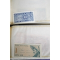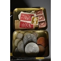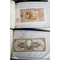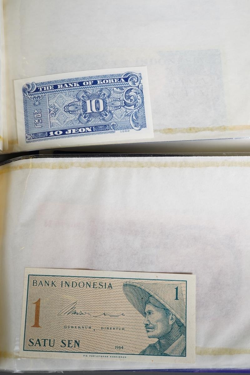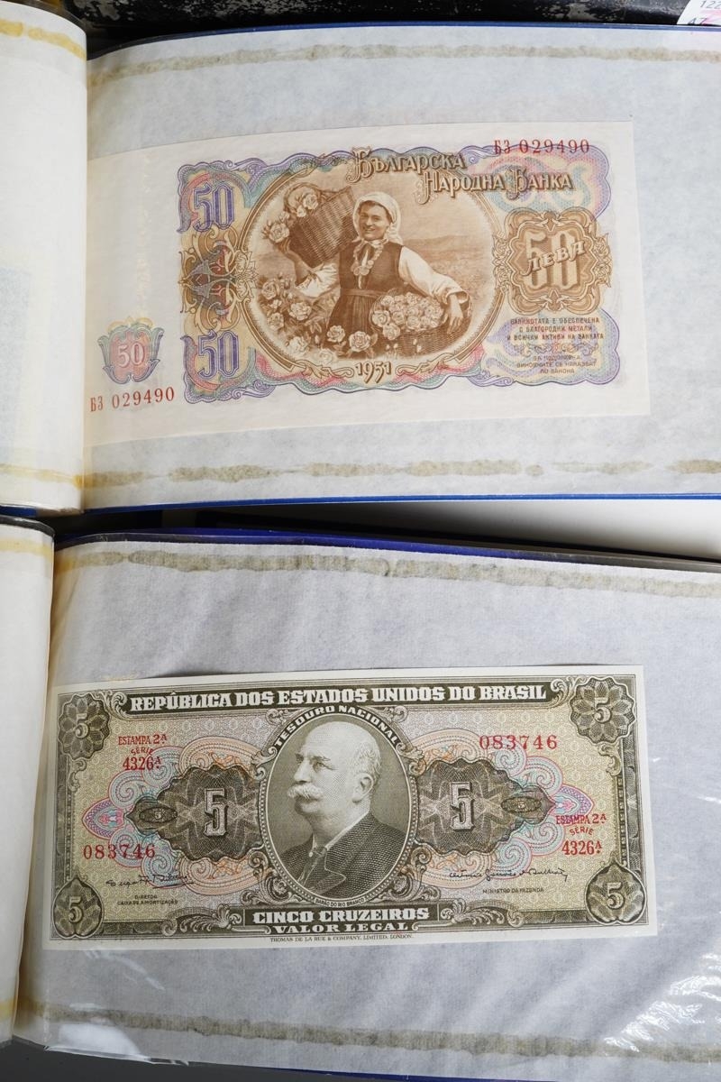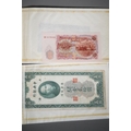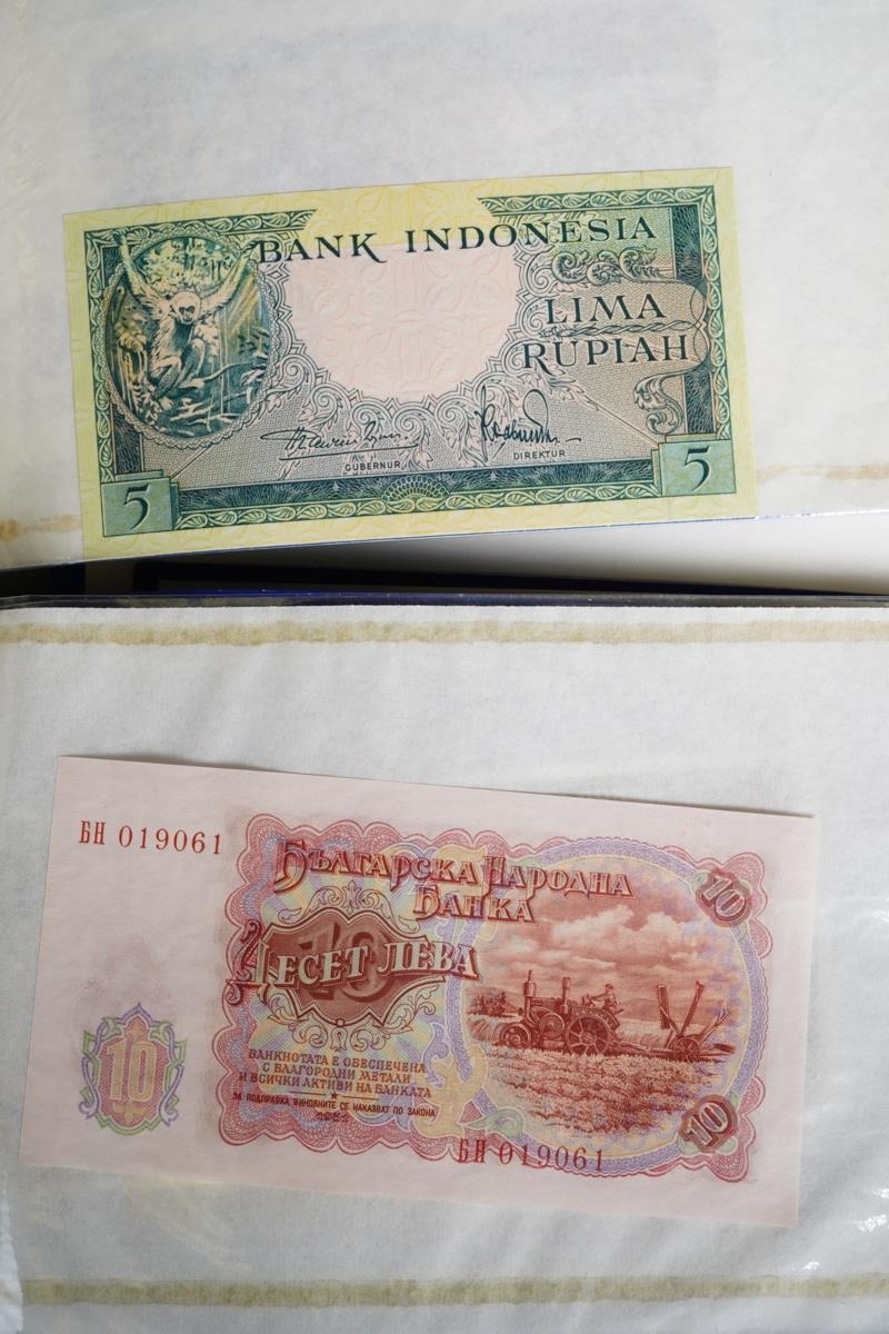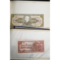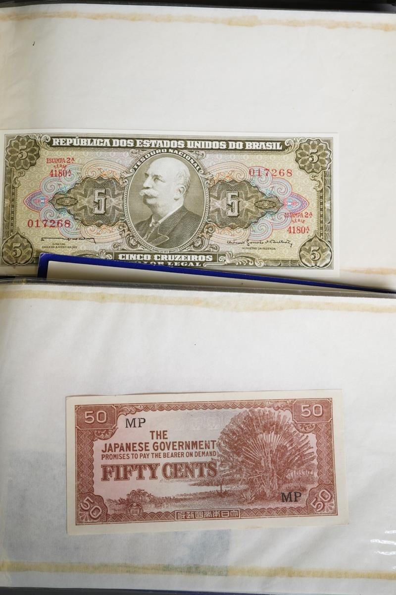 Four Rothmans of Pall Mall "Collections of Rare Banknotes" folders, containing 19 banknotes in sleeves and one loose, including Brazilian, Bulgarian, Japanese, Chinese, Indonesian and others, together with a vintage cash box and a small tin containing British and foreign coins, including 3d and three QEII commemorative crowns and small quantity of stamps (1 tin and contents)