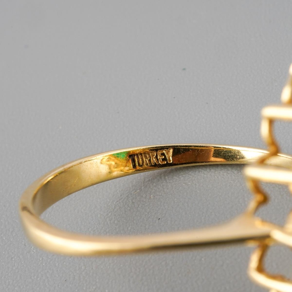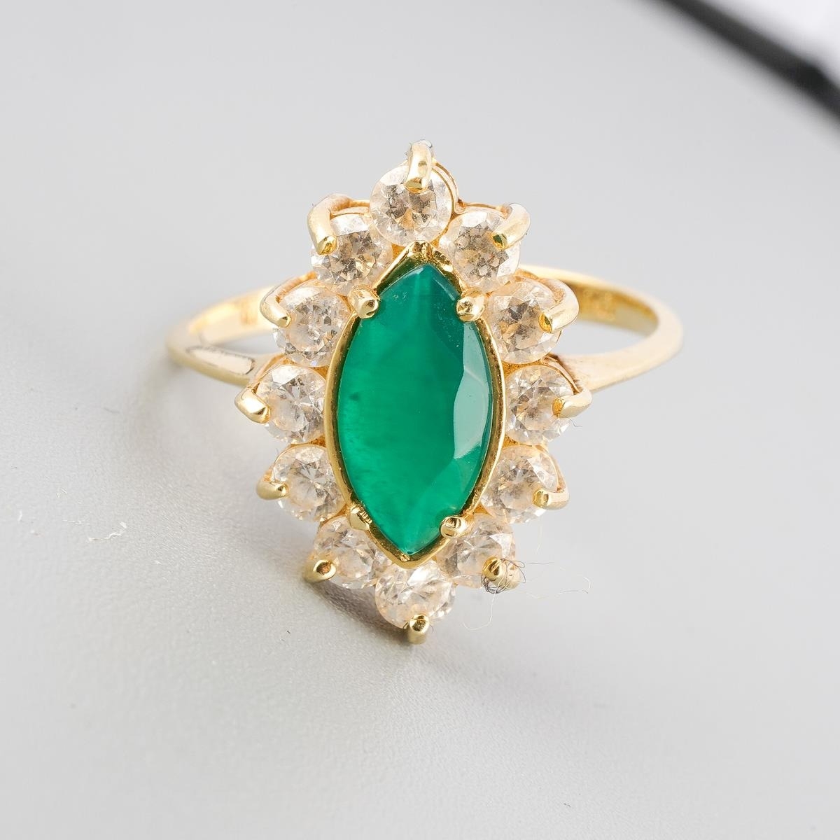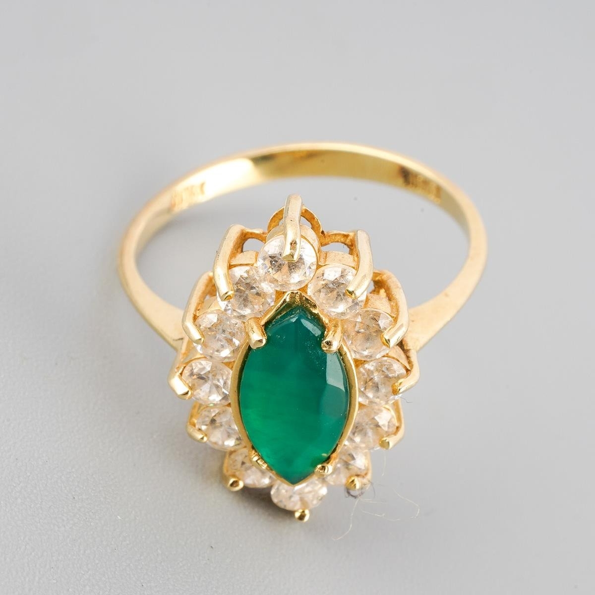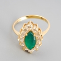 A dyed chalcedony and cubic zirconia cluster ring. Approx ring size N 1/2, stamped 14k Turkey, approx gross weight 3.0 grams.