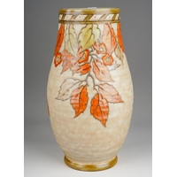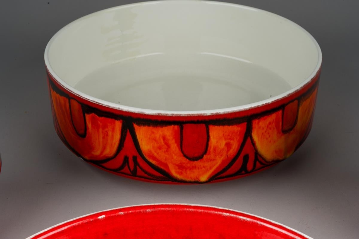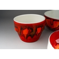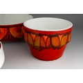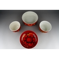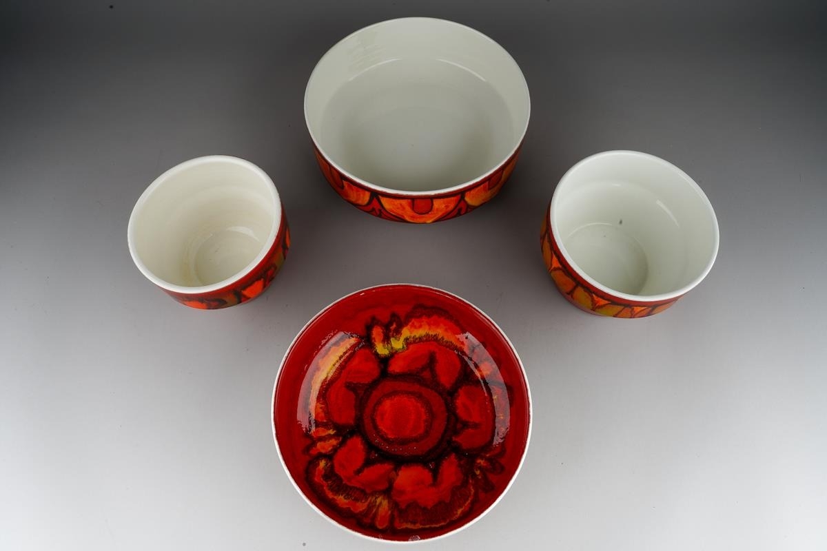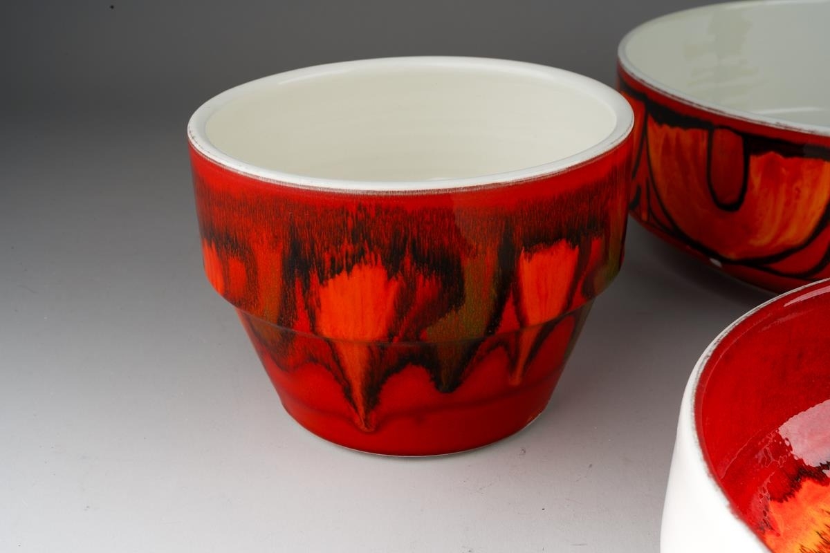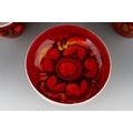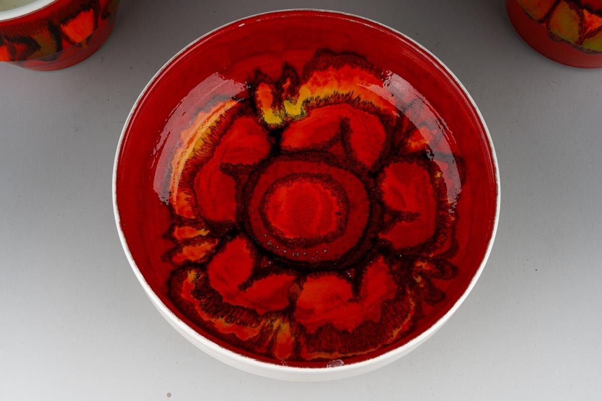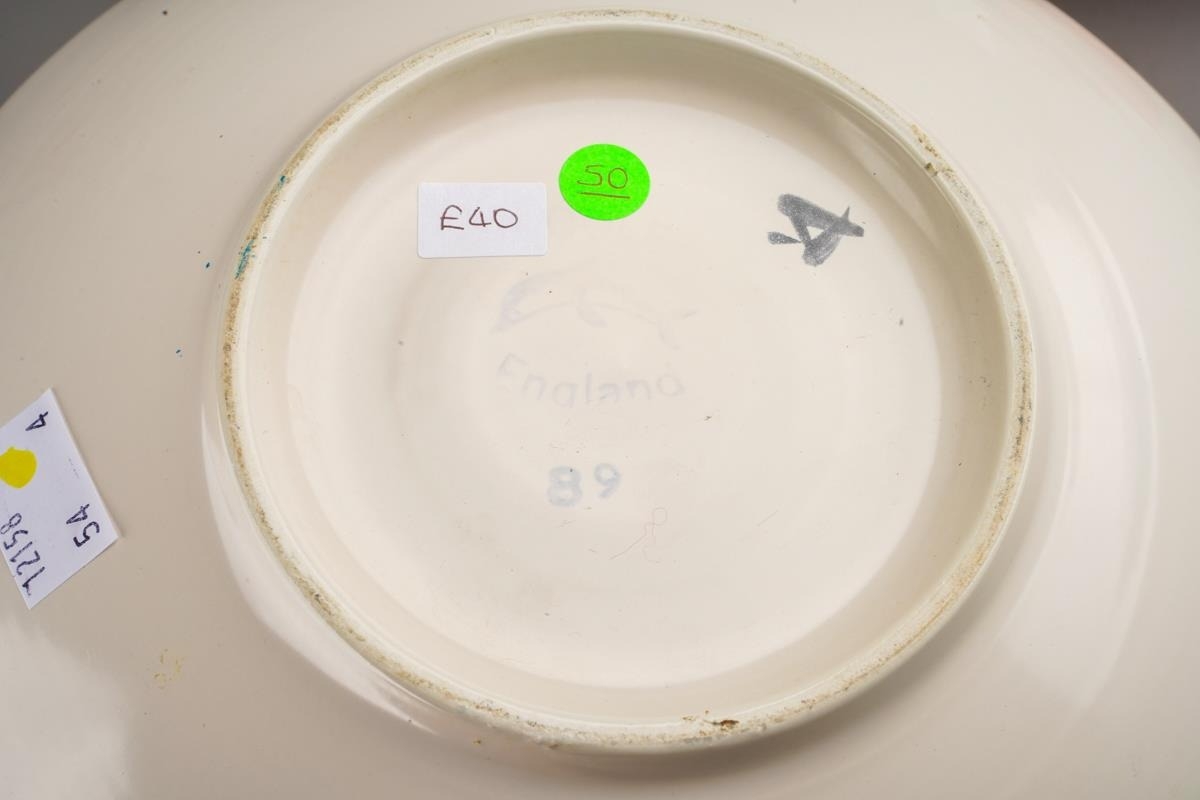 A Poole Pottery Delphis centrepiece bowl, factory stamp and artist's monogram, numbered 96, approx 25cm diam together with another smaller Delphis bowl, numbered 89 and two Delphis jardinières, factory stamps, both numbered 73 [4]