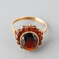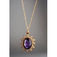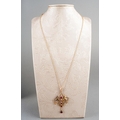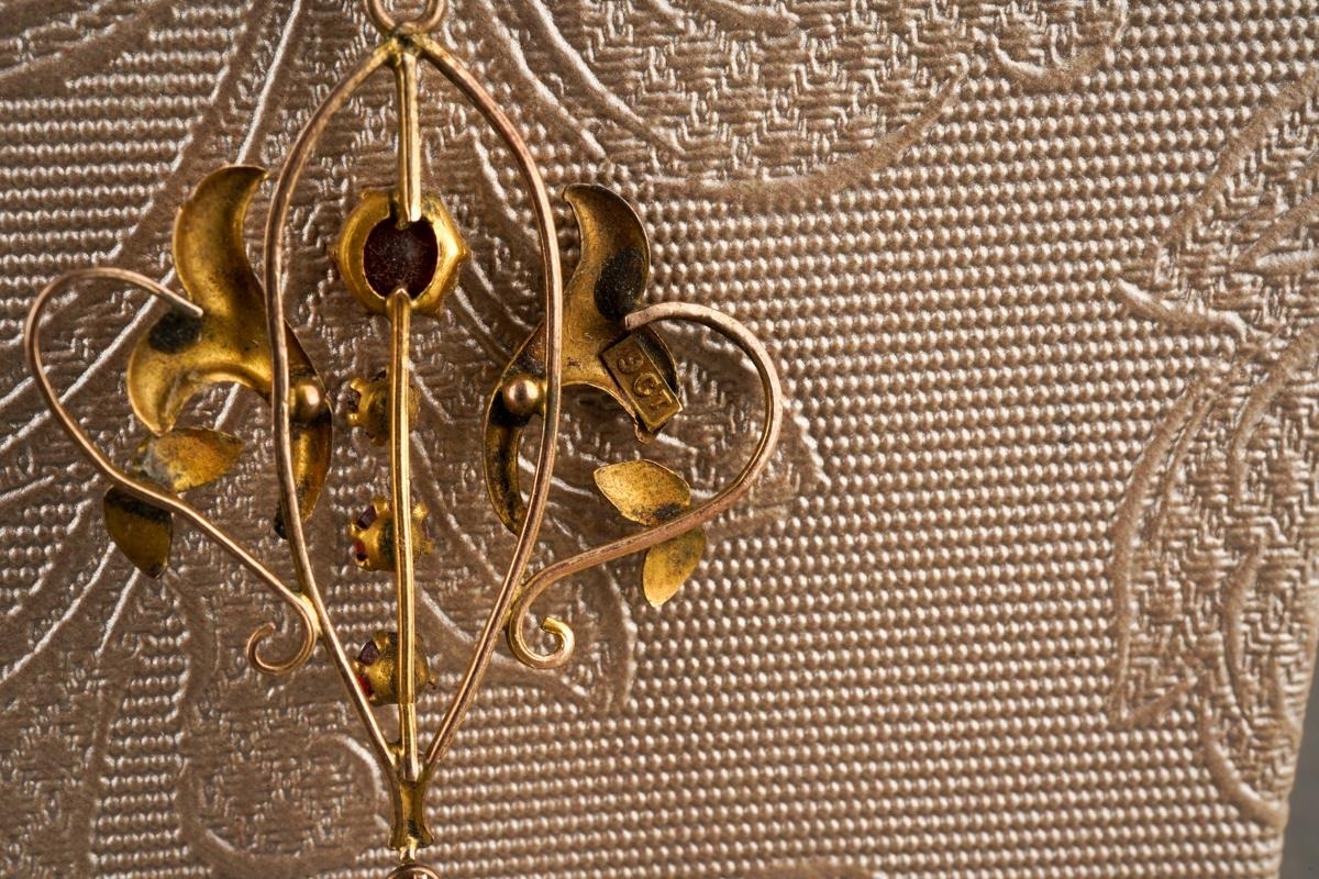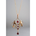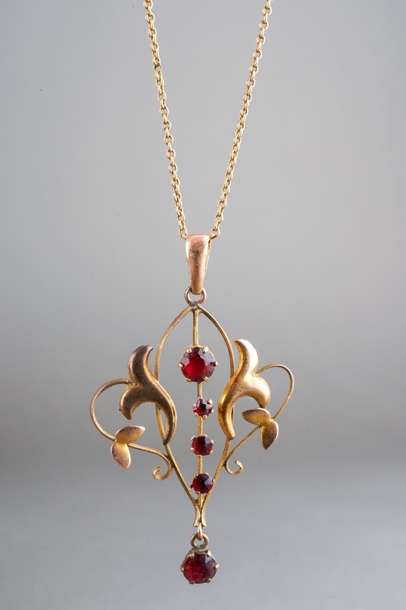 An early 20th century 9ct gold gem set pendant and chain. The scroll design pendant set with garnets, suspended from a trace link chain, chain and pendant stamped 9ct, approx length pendat 44mms, approx length chain 430mm, approx gross weight 3.1 grams.