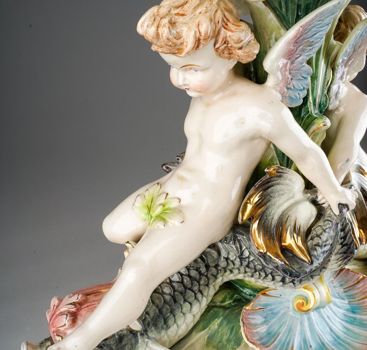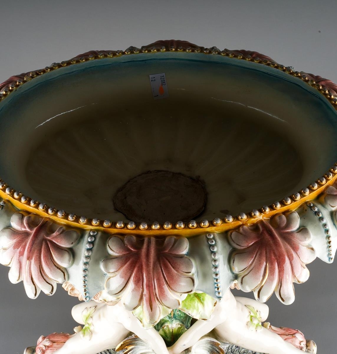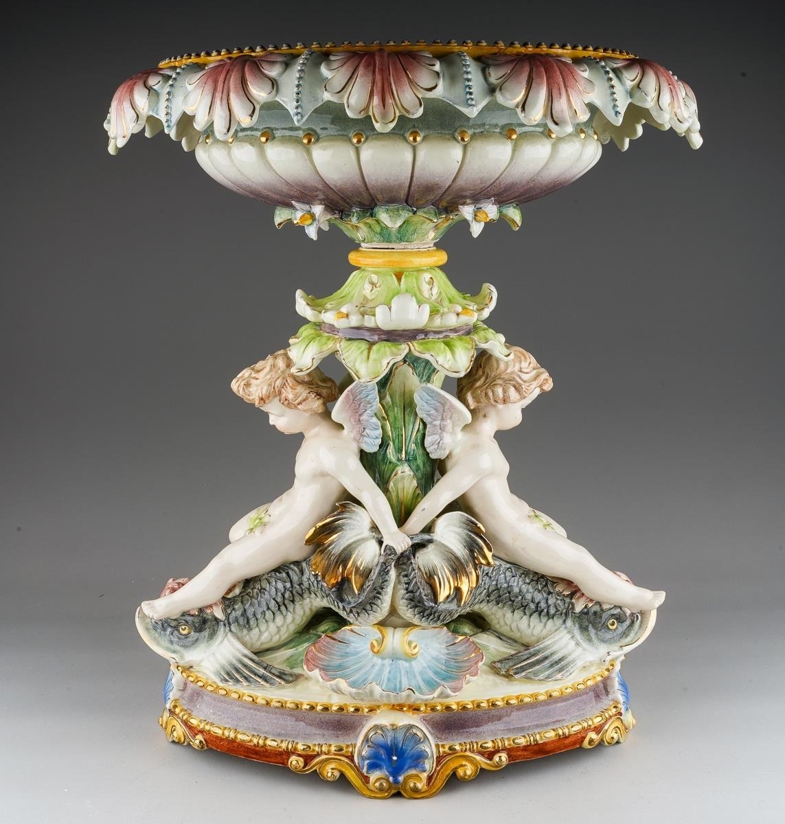 An early 20th Century German Majolica style large table centrepiece, the detachable oval bowl with acanthus leaf border above gadroon section, the base modelled with a pair of winged putti on dolphins with clam shells between, raised on oval plinth with scrolls, egg-and-dart moulding and shells., impressed Made in Germany Neuhaldensleben fish shaped stamp and numbered 535, approx 50.5cm high x 40cm wide