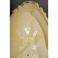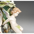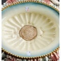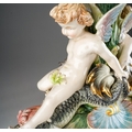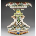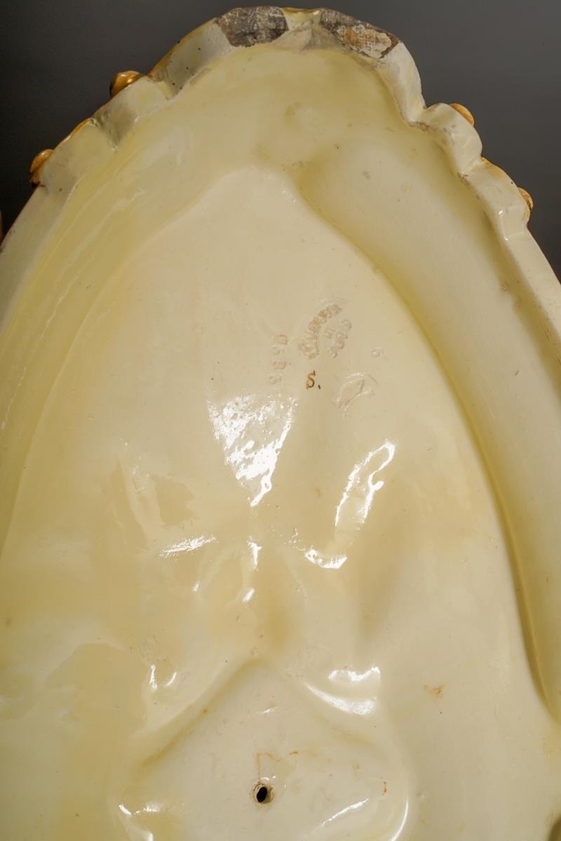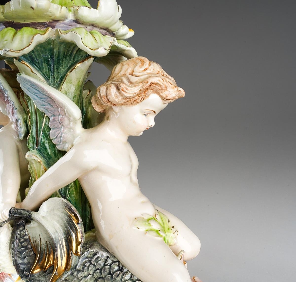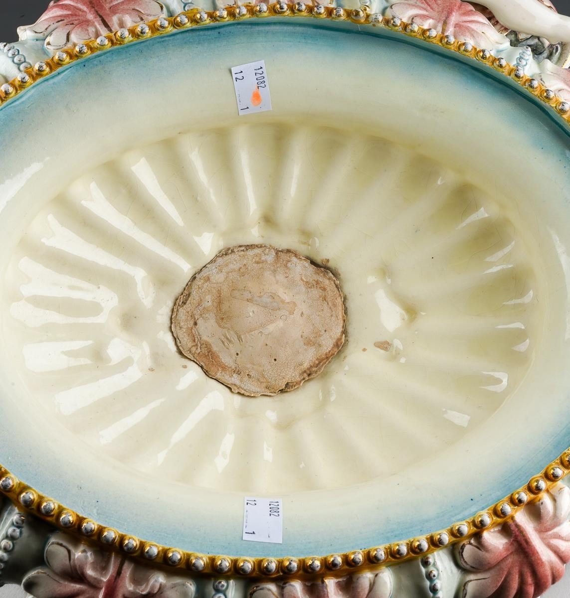 An early 20th Century German Majolica style large table centrepiece, the detachable oval bowl with acanthus leaf border above gadroon section, the base modelled with a pair of winged putti on dolphins with clam shells between, raised on oval plinth with scrolls, egg-and-dart moulding and shells., impressed Made in Germany Neuhaldensleben fish shaped stamp and numbered 535, approx 50.5cm high x 40cm wide