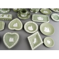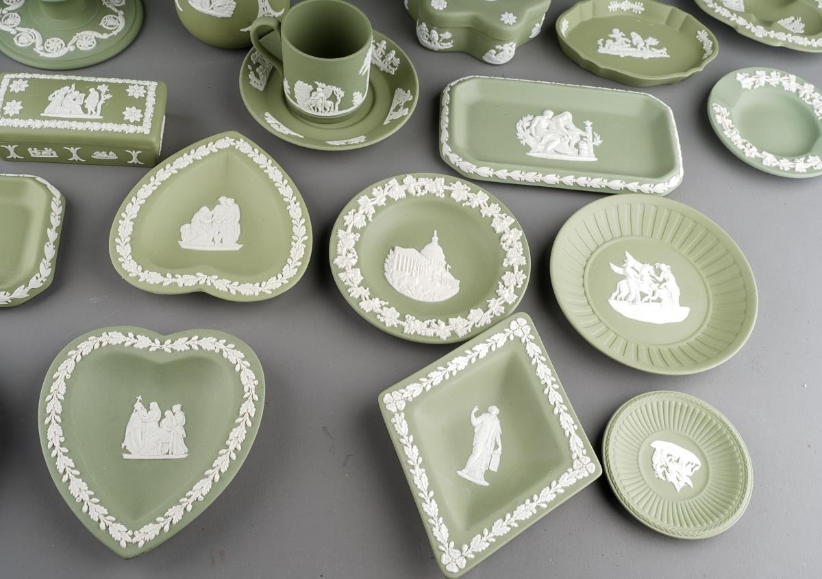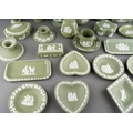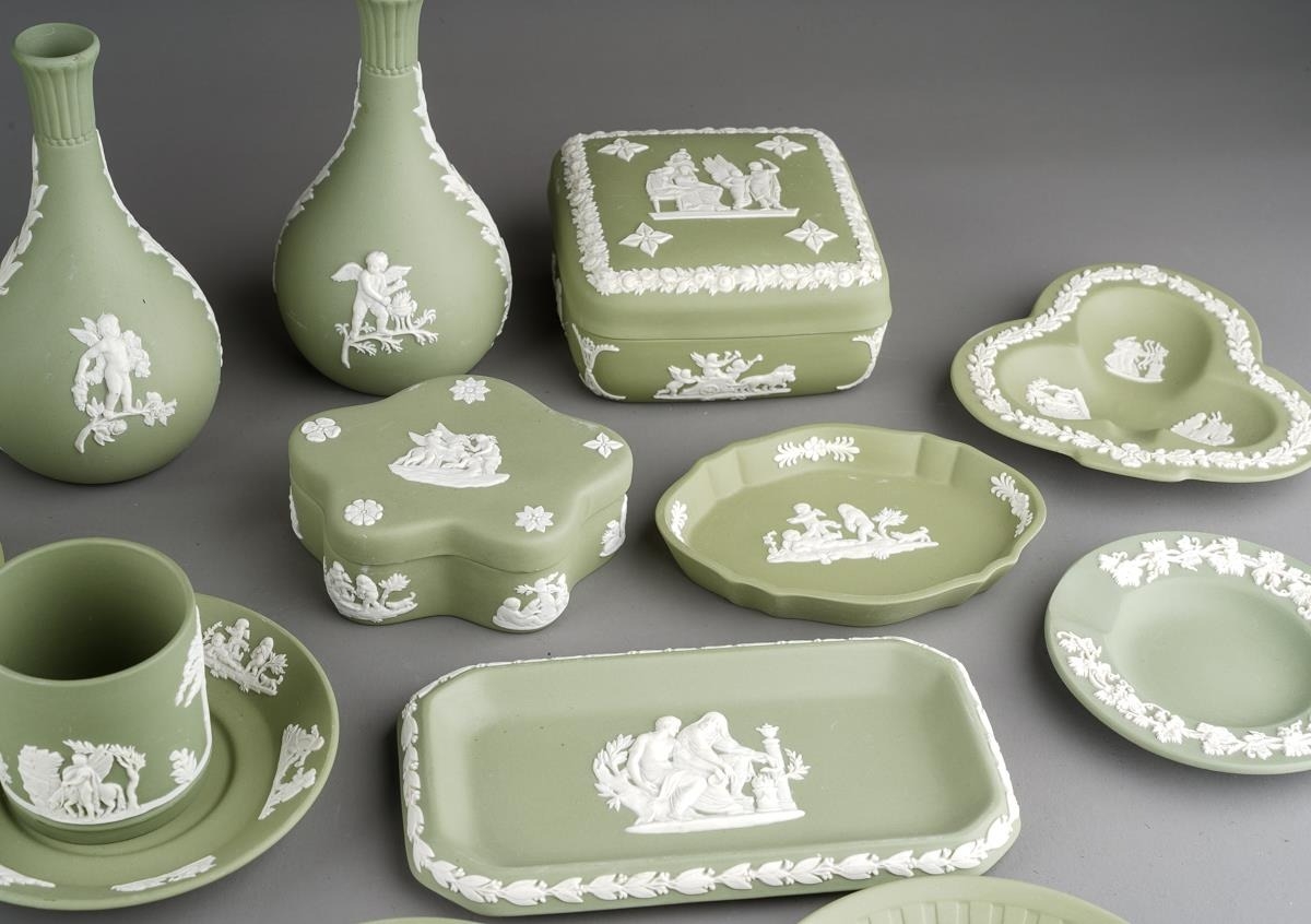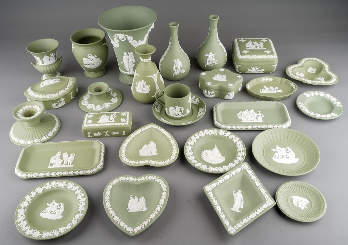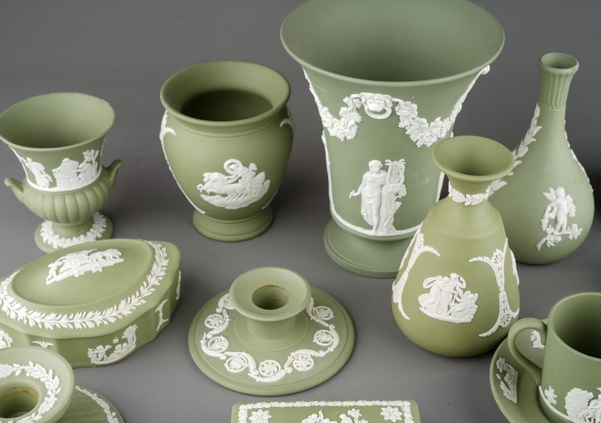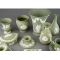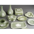 A collection of green Wedgwood jasperware, including dwarf candlesticks, vases, pin dishes, coffee cup and saucer, trinket boxes, etc, approximately 26 pieces (1 box)