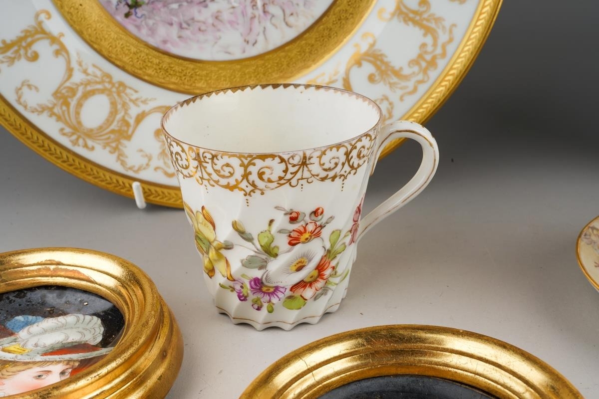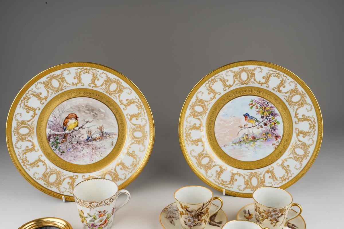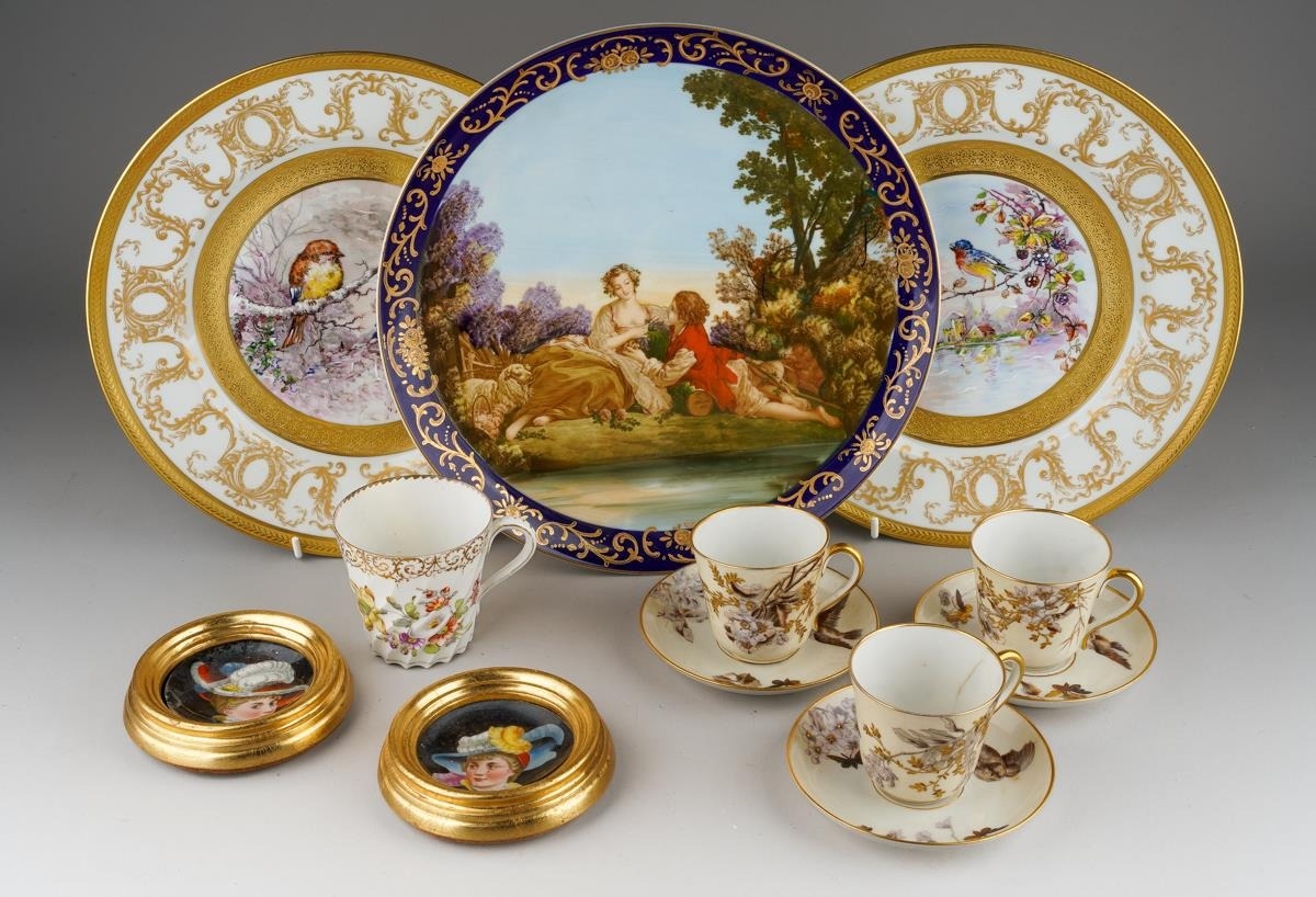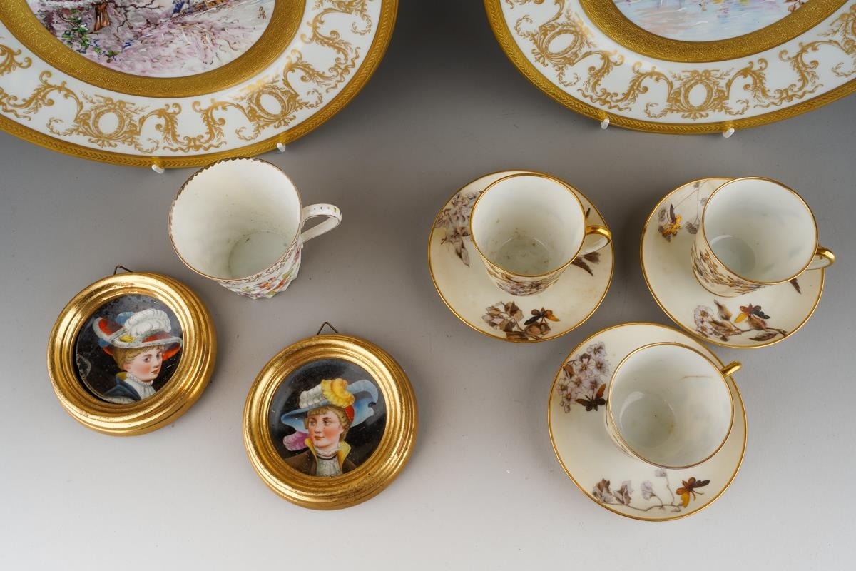 A Continental cabinet plate decorated with 18th Century pastoral scene after Francois Boucher, gilt and cobalt blue border together with a pair of Limoges cabinet plates, each decorated with a bird within winter landscape; a set of three late 19th Century cups and saucers decorated with birds, foliage and insects, mark probably that of Fisher & Meig, Bohemia, a further wyvern fluted cup and a pair of enamelled plaques decorated with portrait of Ladies in hats (1 box)