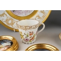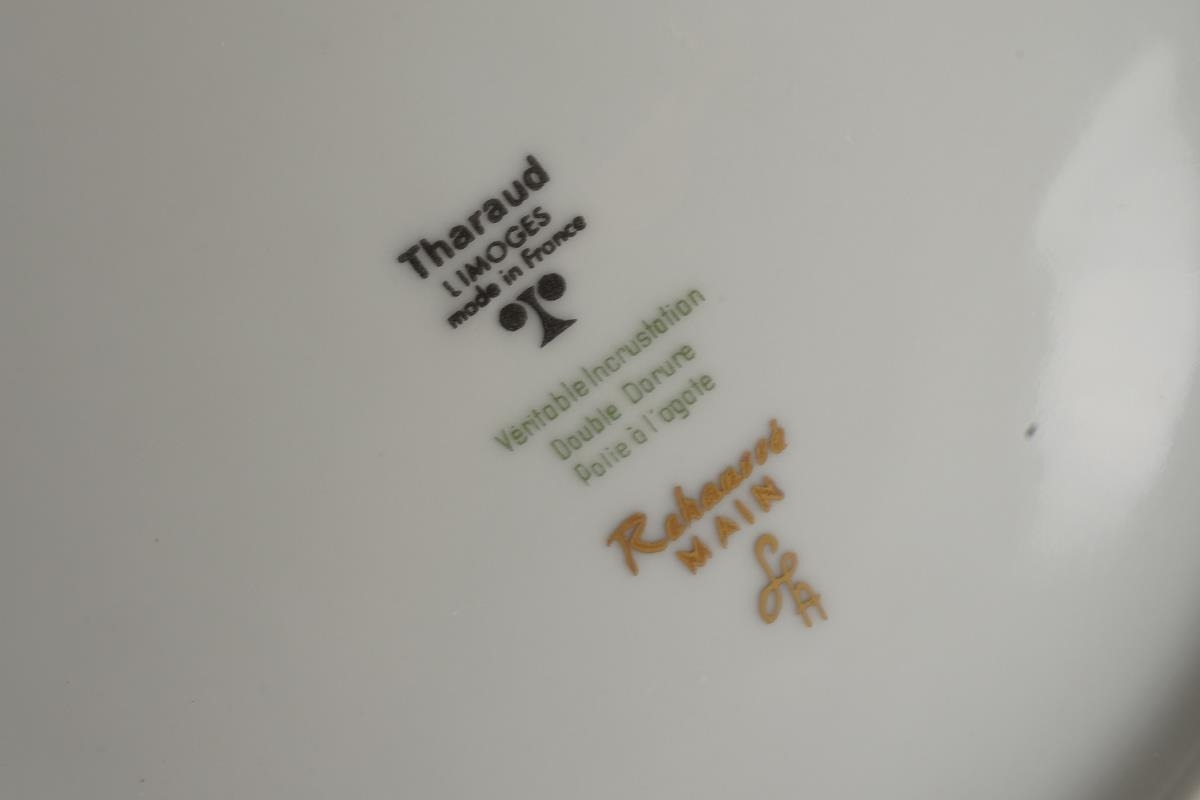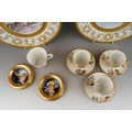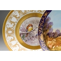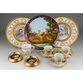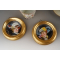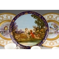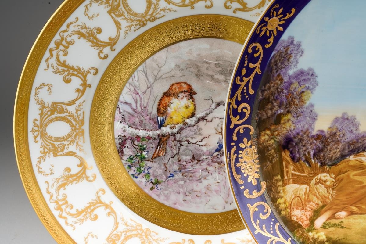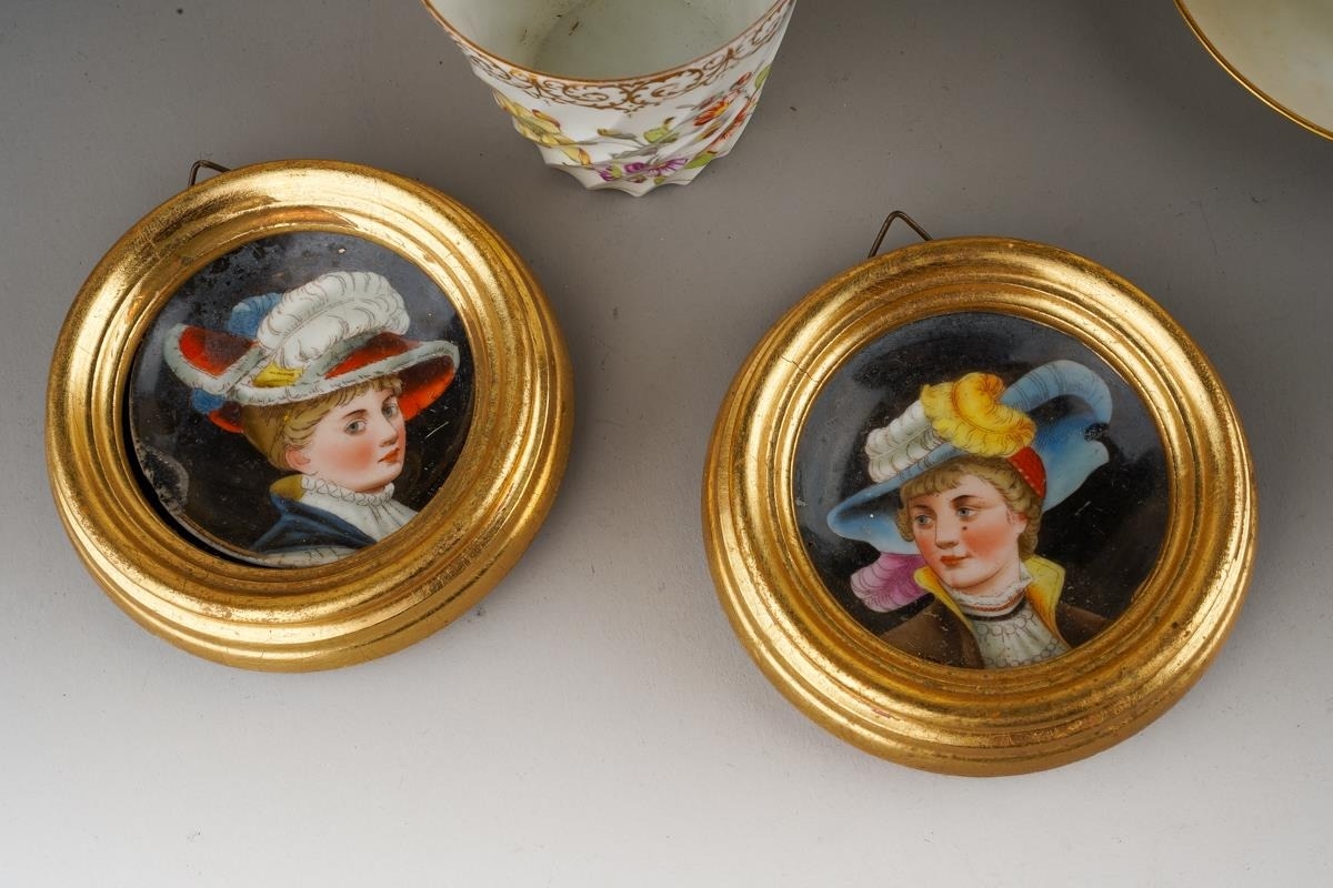A Continental cabinet plate decorated with 18th Century pastoral scene after Francois Boucher, gilt and cobalt blue border together with a pair of Limoges cabinet plates, each decorated with a bird within winter landscape; a set of three late 19th Century cups and saucers decorated with birds, foliage and insects, mark probably that of Fisher & Meig, Bohemia, a further wyvern fluted cup and a pair of enamelled plaques decorated with portrait of Ladies in hats (1 box)