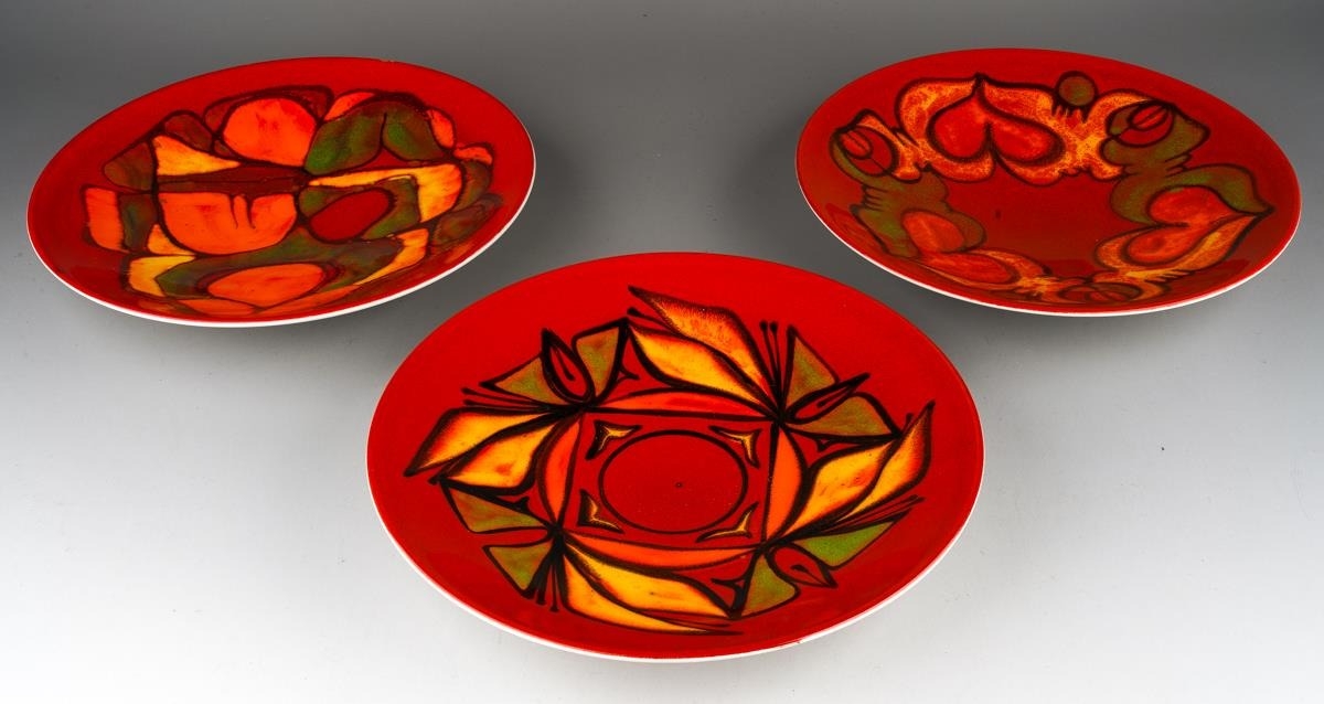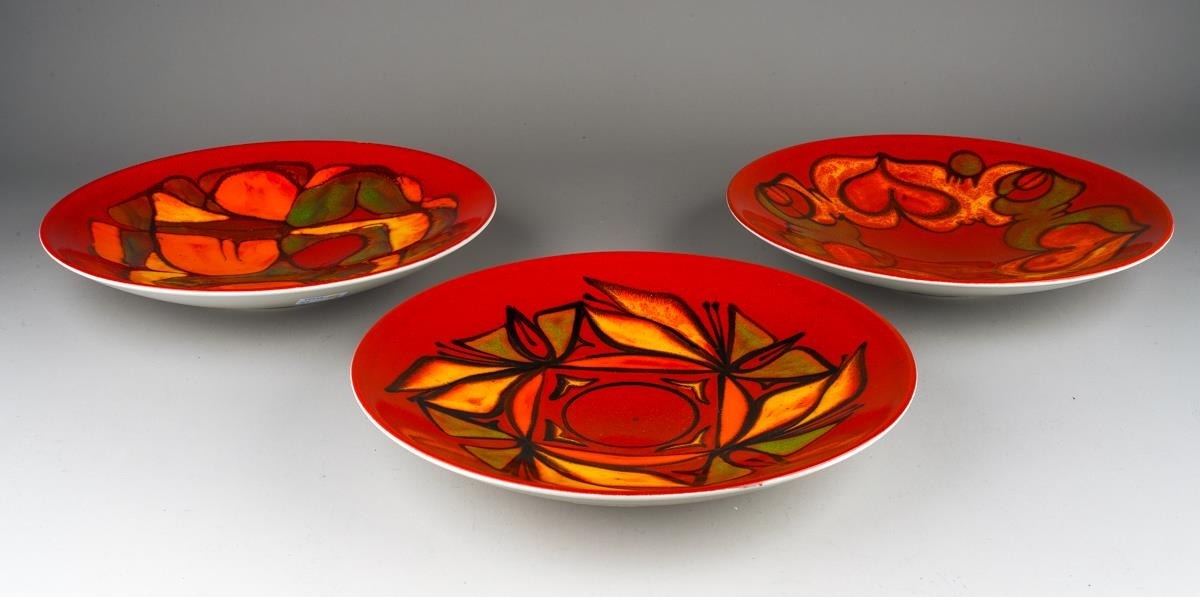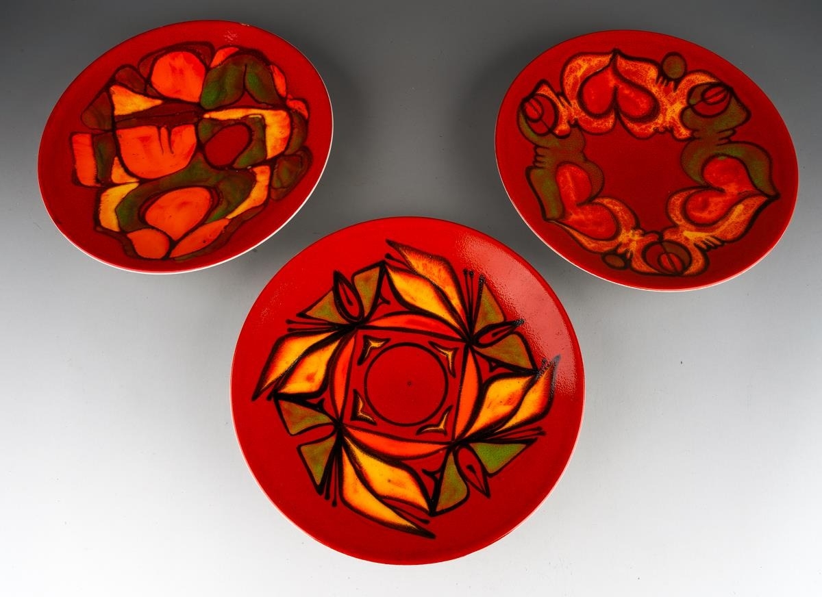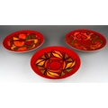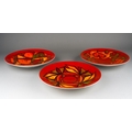Three various Poole Pottery "Delphis" shape no 4 plates, factory stamps, artist's initials and numbered, approx 16.5cm diam [3]