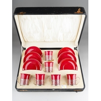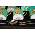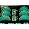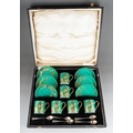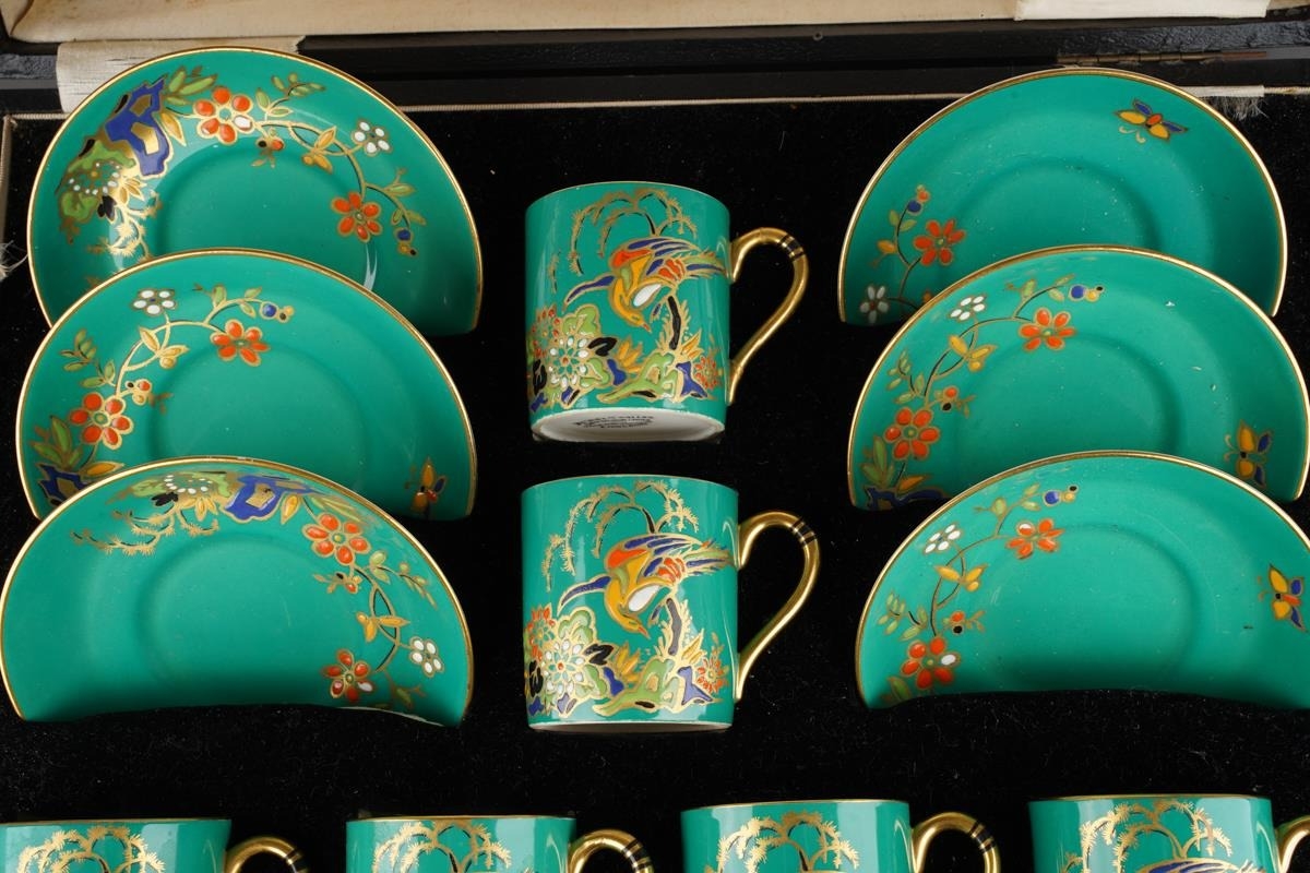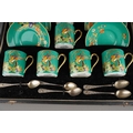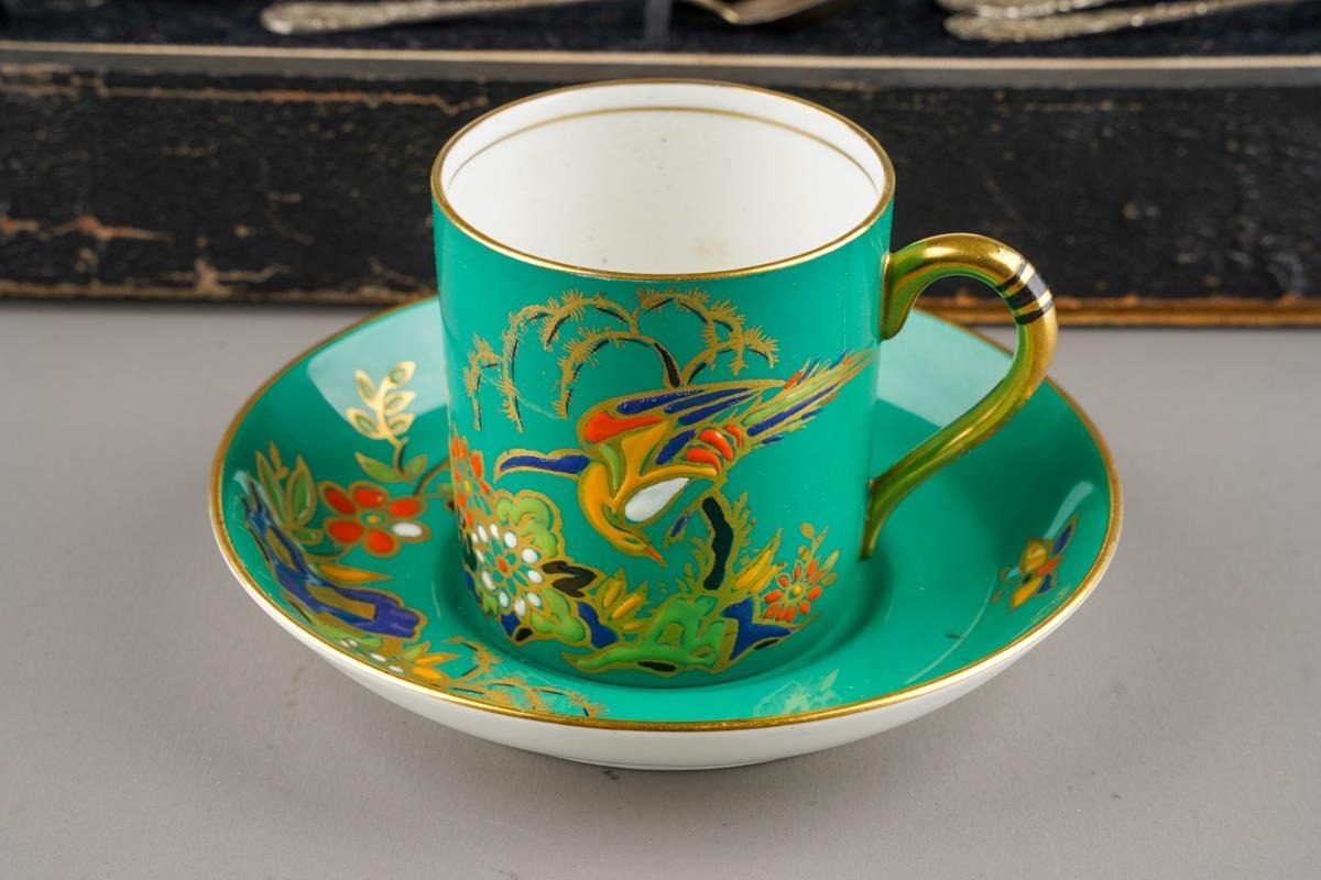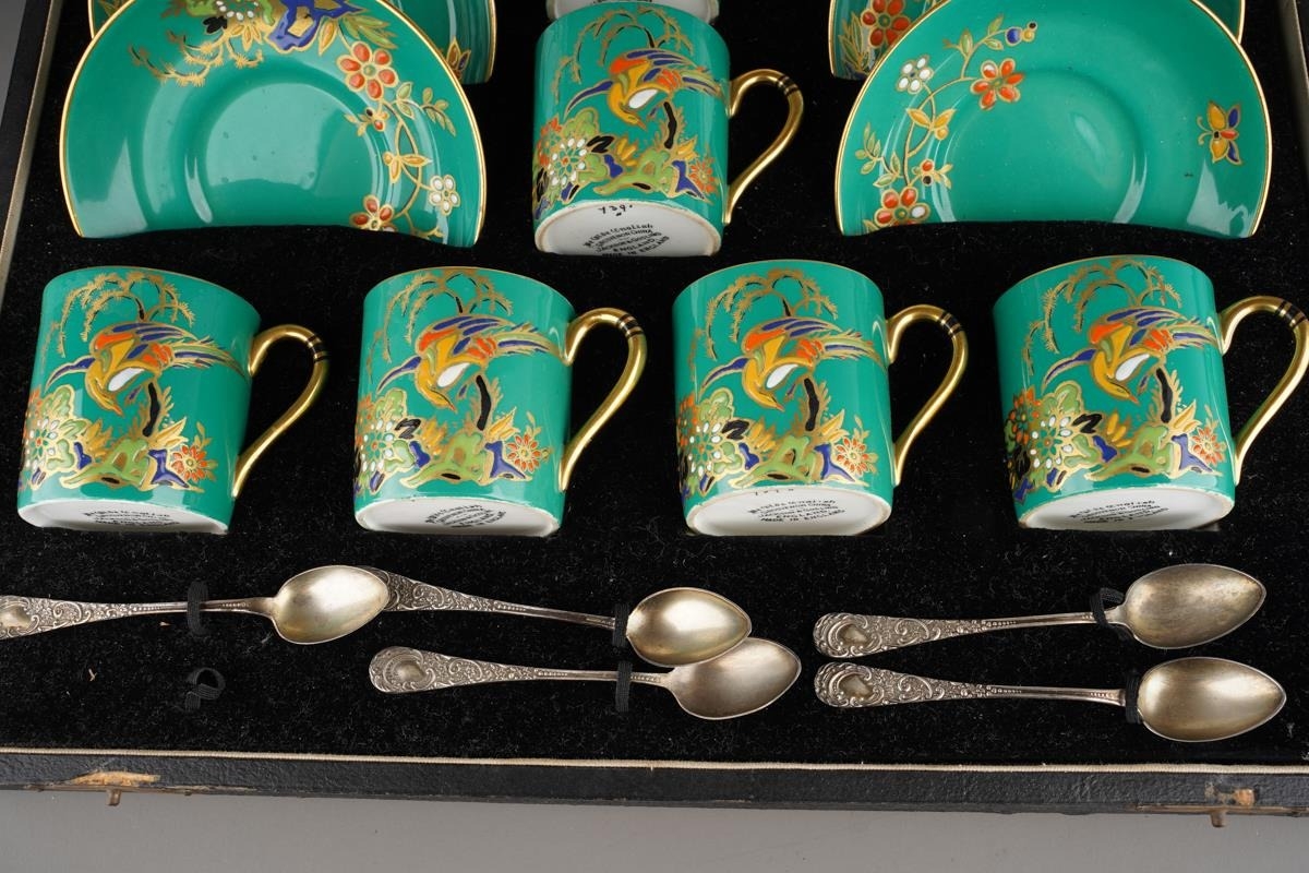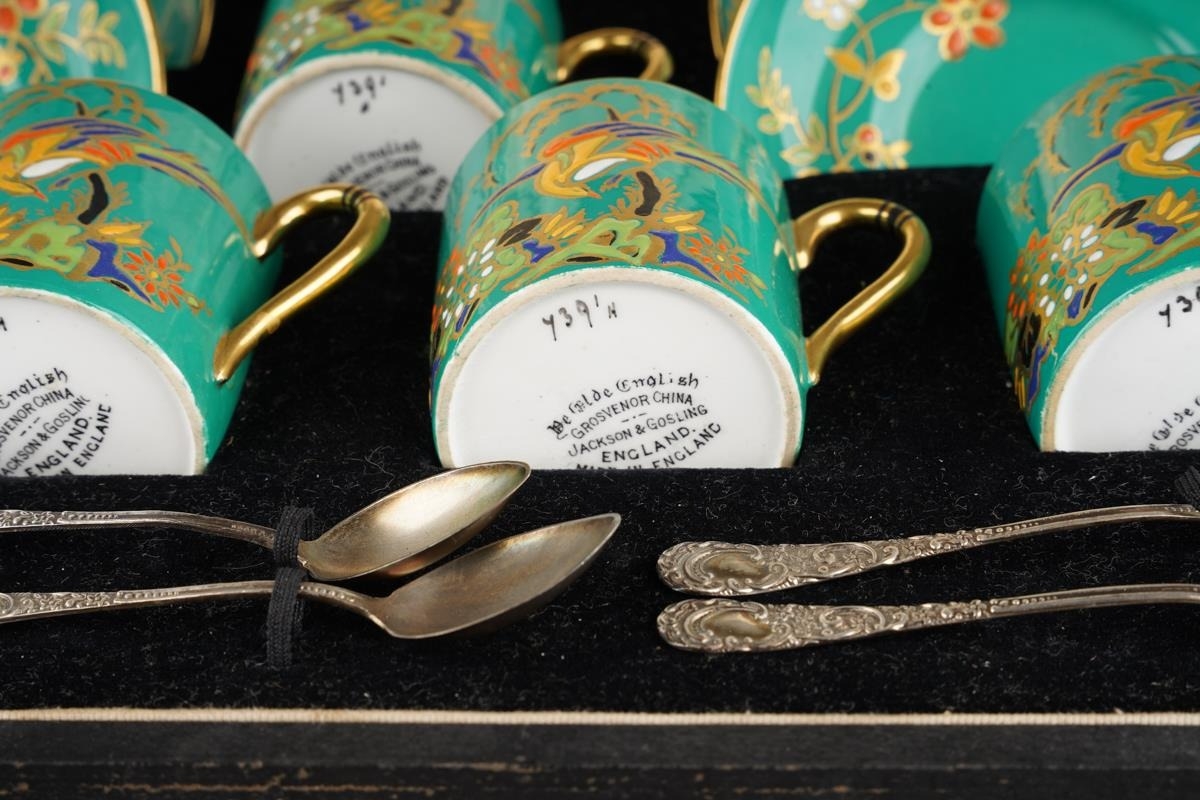 A cased Grosvenor China 'Ye Olde English' coffee set comprising six coffee cans and six saucers with five sterling silver spoons, the bone china in a green ground with gilt and enamel decoration of an exotic bird and foliage, stamped to base including Jackson & Gosling retailers stamp, the five spoons stamped STERLING, gross weight 0.96ozt, 29.8 grams (1 case)