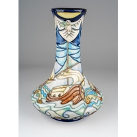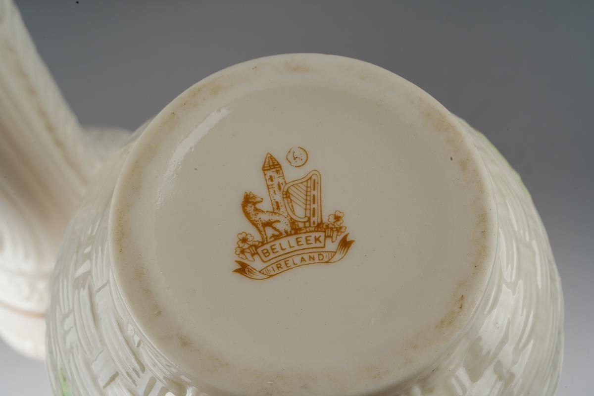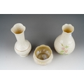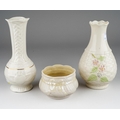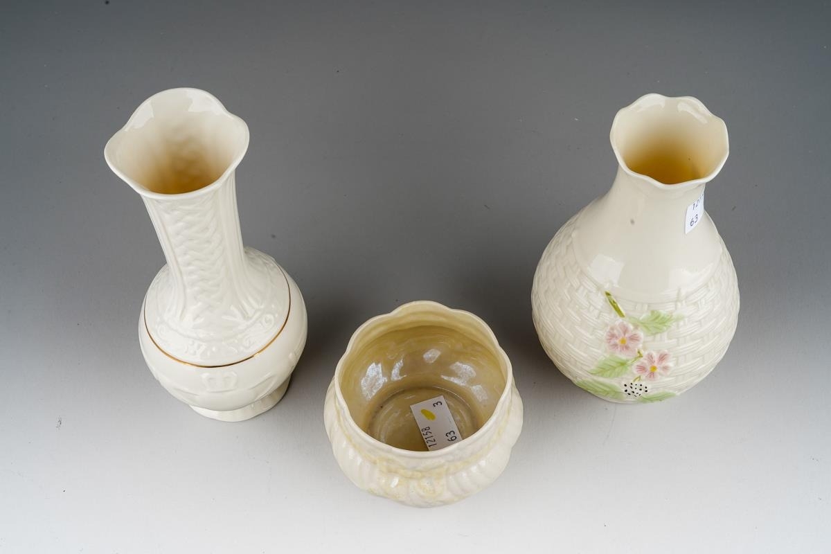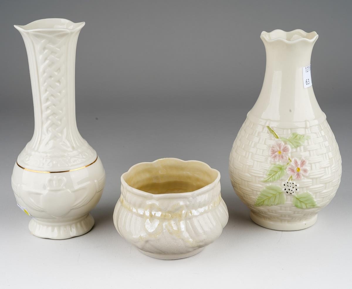 A Belleek 3rd period bowl, 5.5cm high together with a 9th mark Claddagh and Celtic knot posy vase, 16cm high and a 7th gold mark basket weave and strawberry vase, approx 16cm high [3]