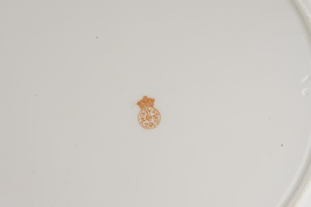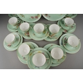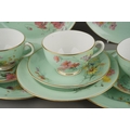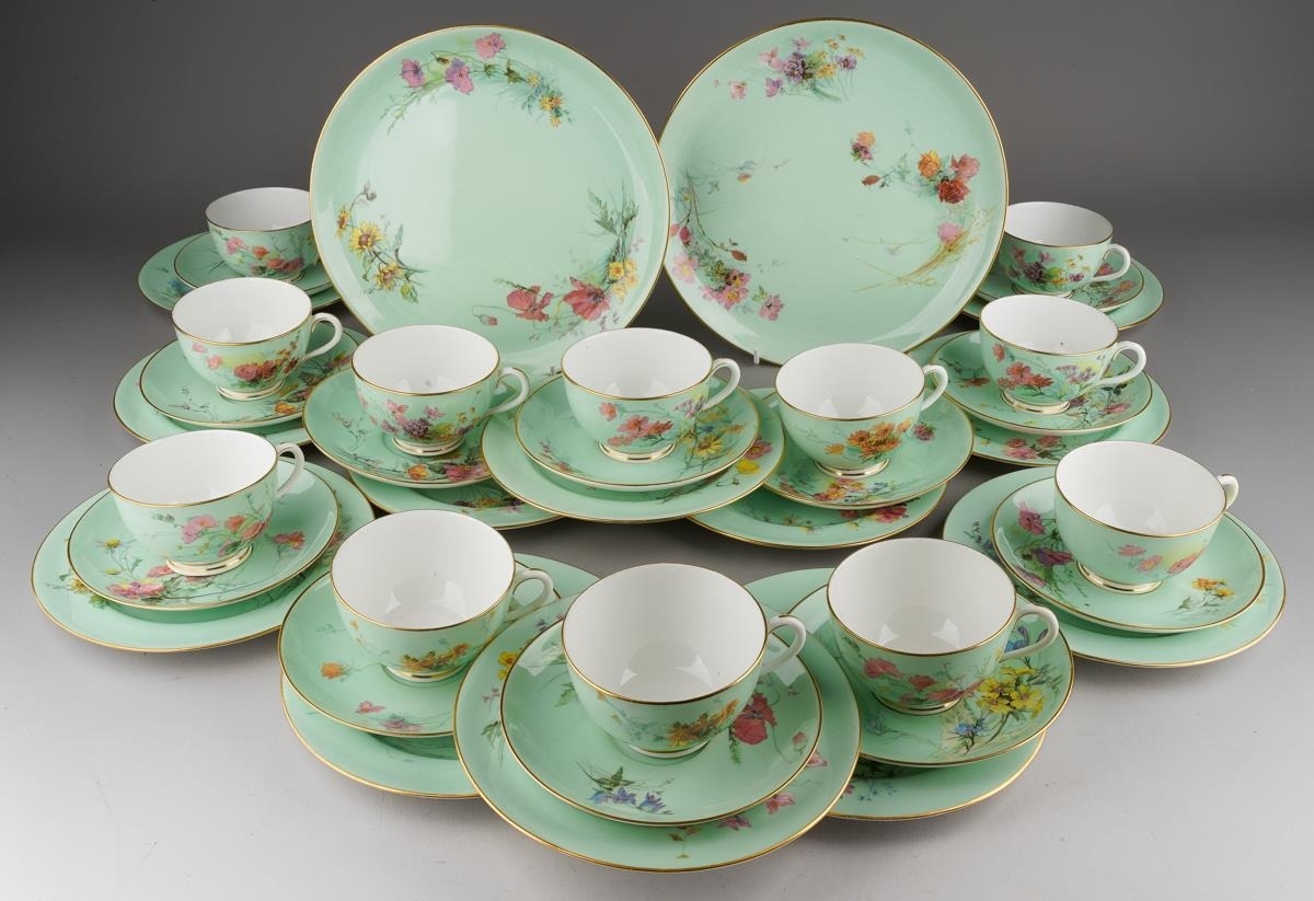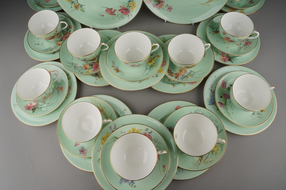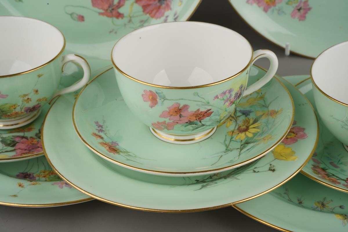 A Royal Worcester twelve place tea set comprising cups, saucer and plates together with two cake plates, the apple green ground decorated with wild flowers (each item differs), gold factory stamp, some with painted with no 5648, impressed marks (1 box)