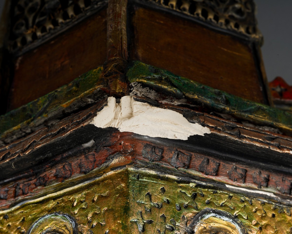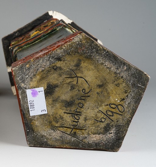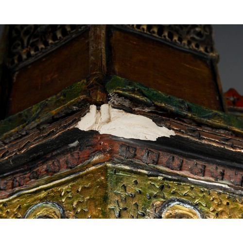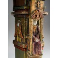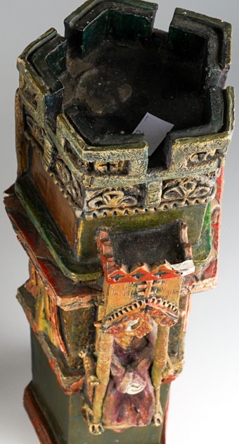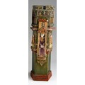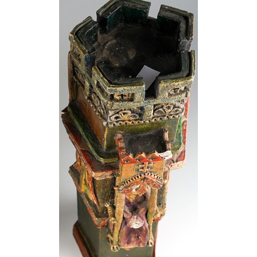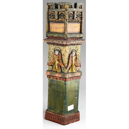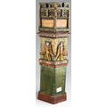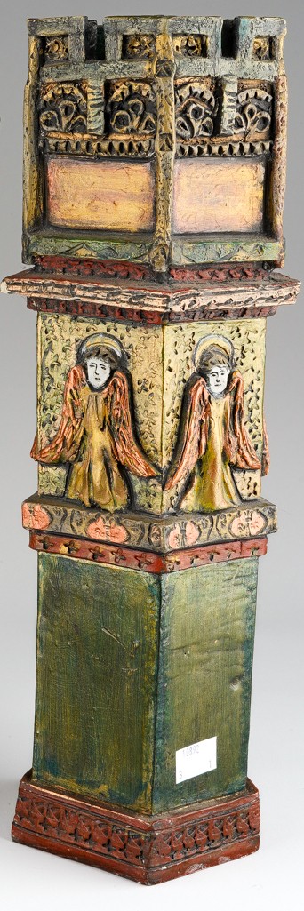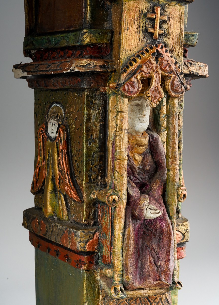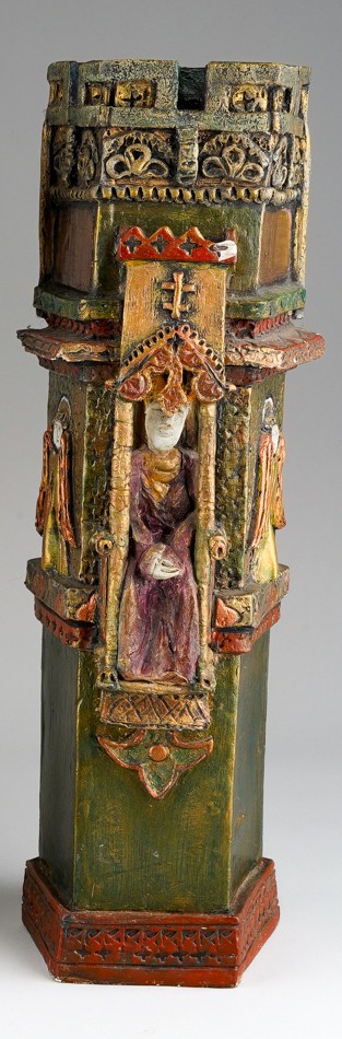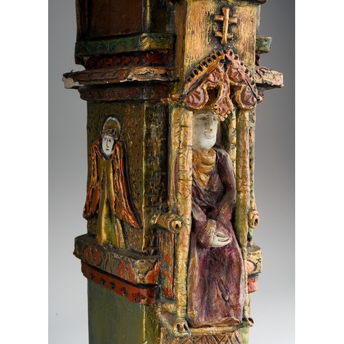 Audrone Berzanskas (Contemporary Lithuanian), a large studio pottery centrepiece modelled as a Church Font, castellated top above seated Bishop and Angels, gilt heightened, signed Audrone 6/98 to underside, approx 39cm high
