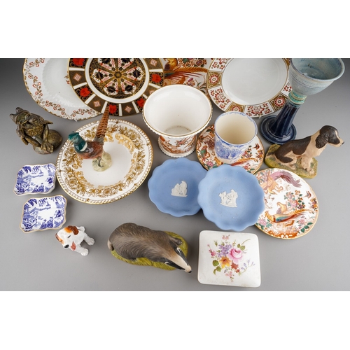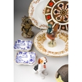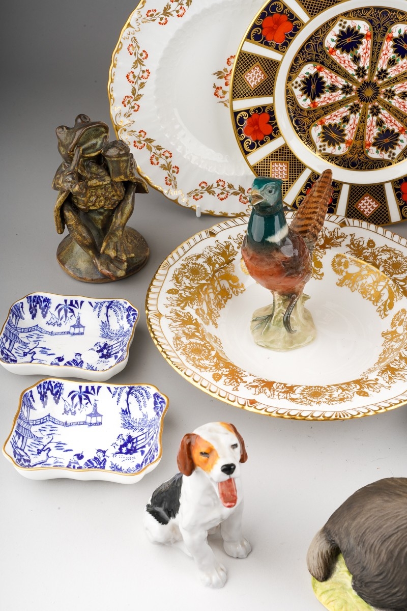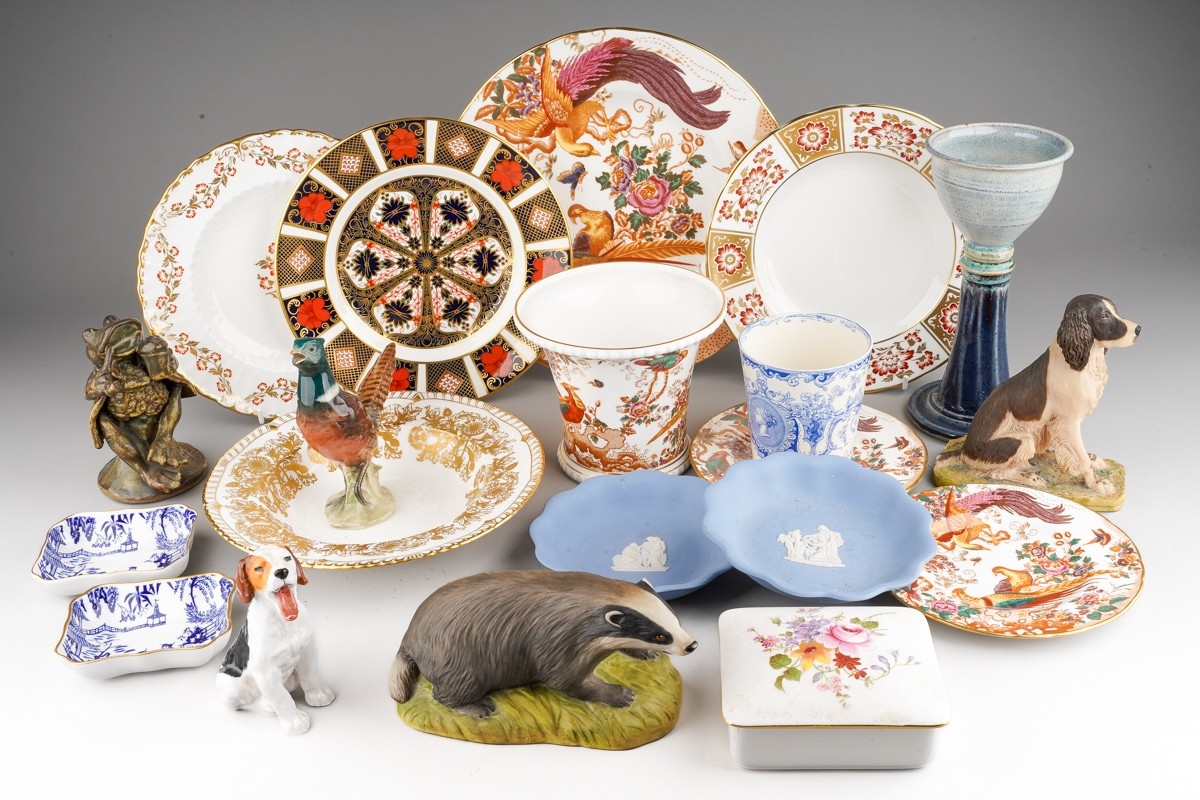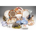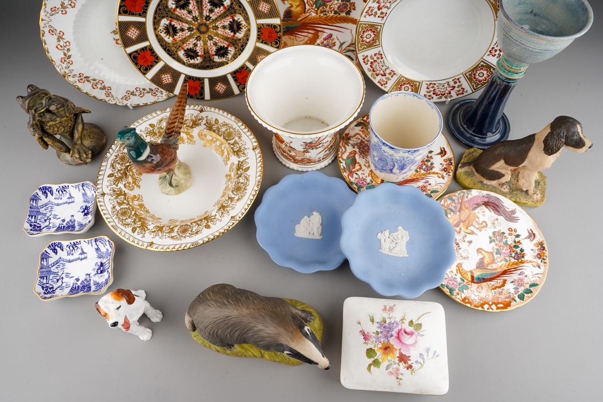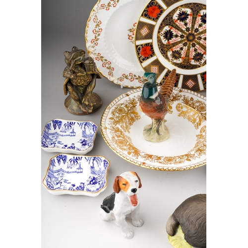 Assorted ceramics to include Victoria R.I Diamond Jubilee Doulton Burslem commemorative beaker (chip to rim) together with Royal Crown Derby 1128 Imari dessert plate, Red Derby Panel A1256 bowl, Brocade soup bowl, Bourbonnais A1238 dessert plate, Olde Avesbury A73 dinner plate, sides plates and vase, Derby Posies box and cover, Mikado bon bon dishes also included various model of animals Badger, Spaniel, Frog etc (1 box -Q)