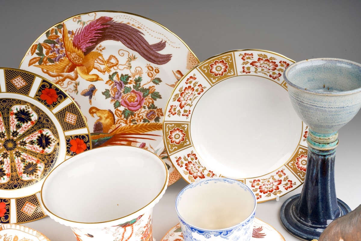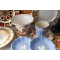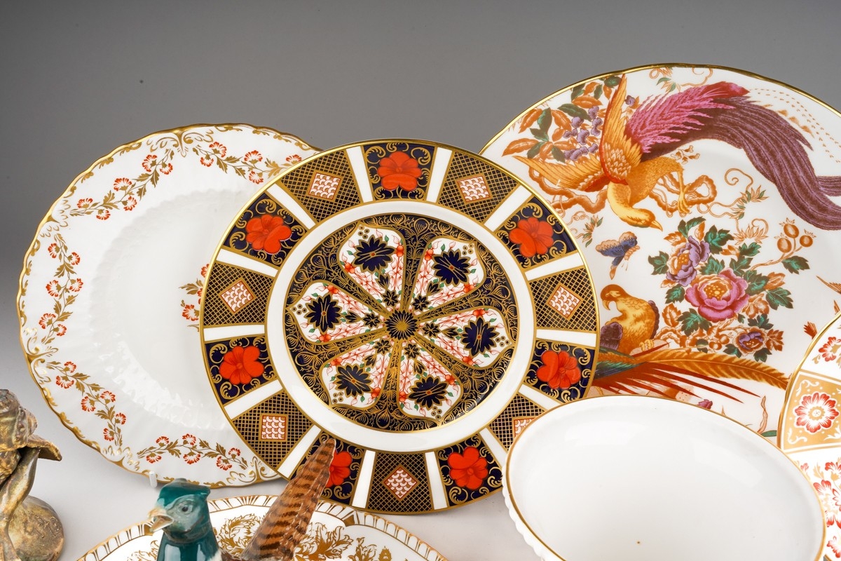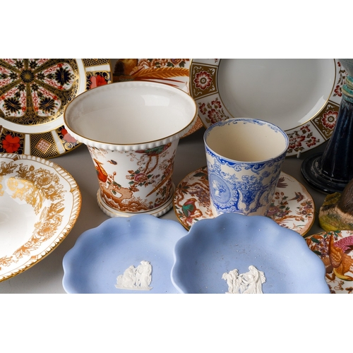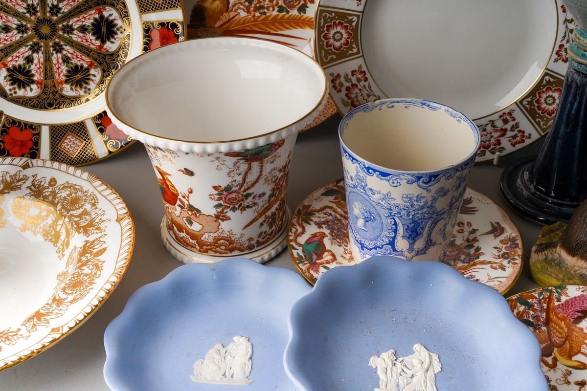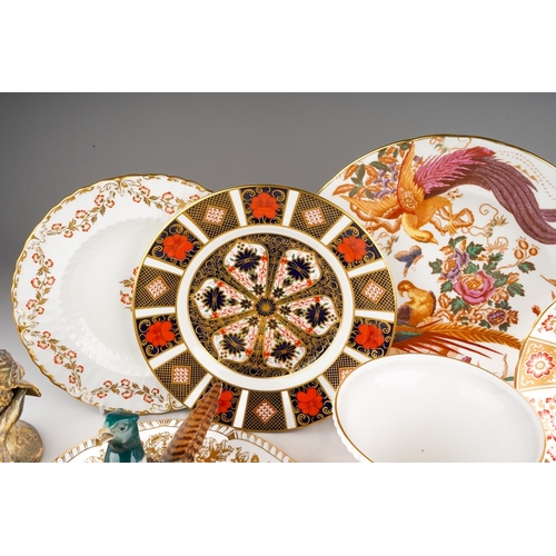 Assorted ceramics to include Victoria R.I Diamond Jubilee Doulton Burslem commemorative beaker (chip to rim) together with Royal Crown Derby 1128 Imari dessert plate, Red Derby Panel A1256 bowl, Brocade soup bowl, Bourbonnais A1238 dessert plate, Olde Avesbury A73 dinner plate, sides plates and vase, Derby Posies box and cover, Mikado bon bon dishes also included various model of animals Badger, Spaniel, Frog etc (1 box -Q)