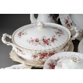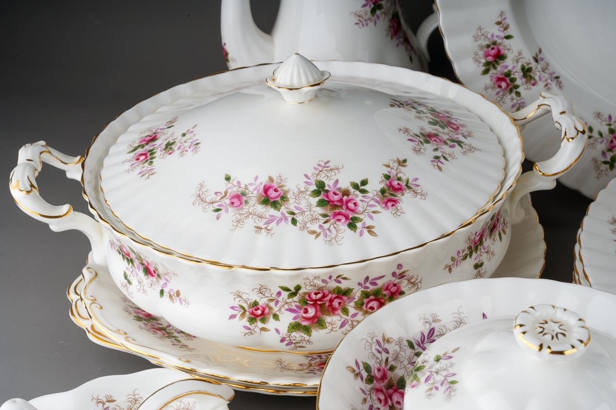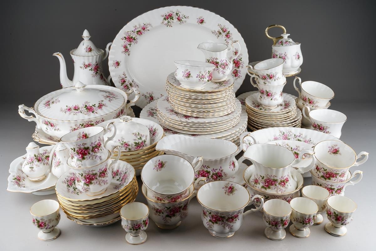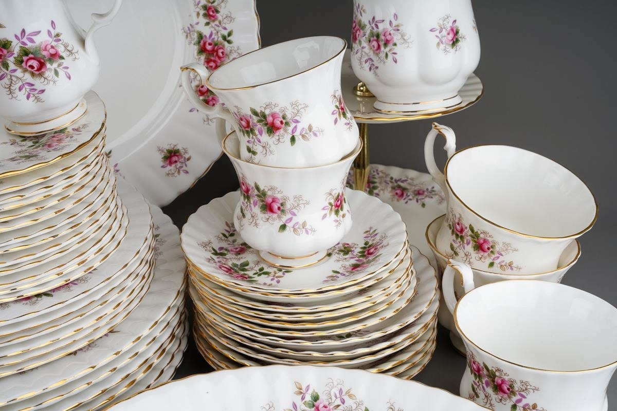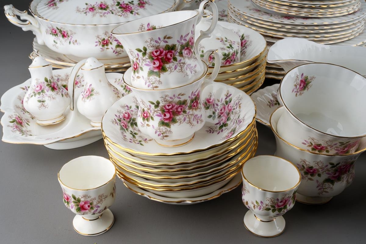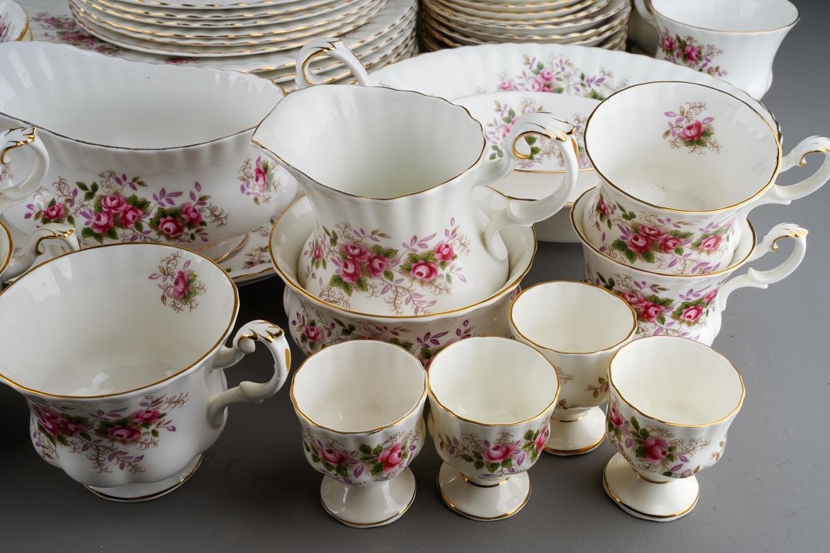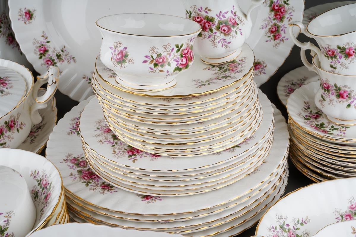 Two boxes of Royal Albert 'Lavender Rose' pattern tea and dinner wares, etc, including six dinner plates, six dessert / starter plates, tureen and cover, two tier cake stand, meat platter, two bread and butter plates, sauce boat and stand, six coffee cups and saucers, six tea cups and saucers, six dessert dishes, thirteen tea plates, six egg cups, etc (2 boxes)