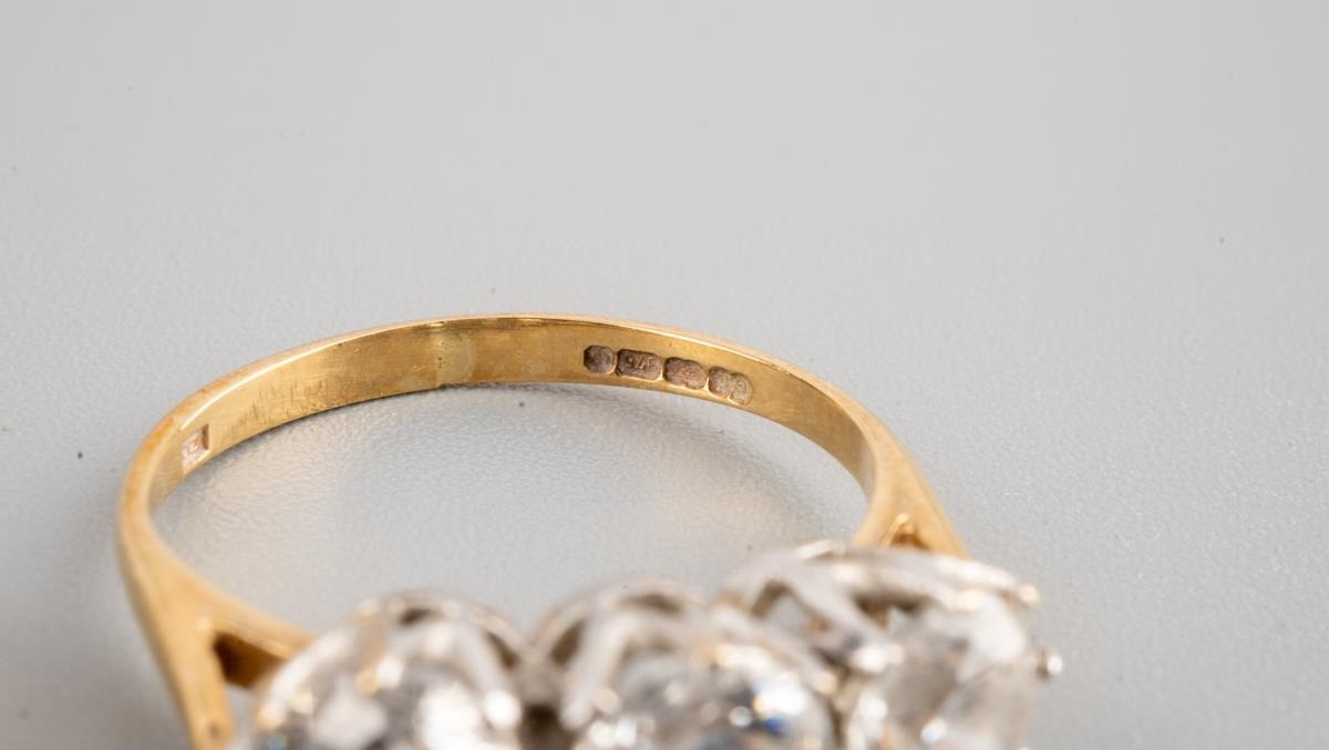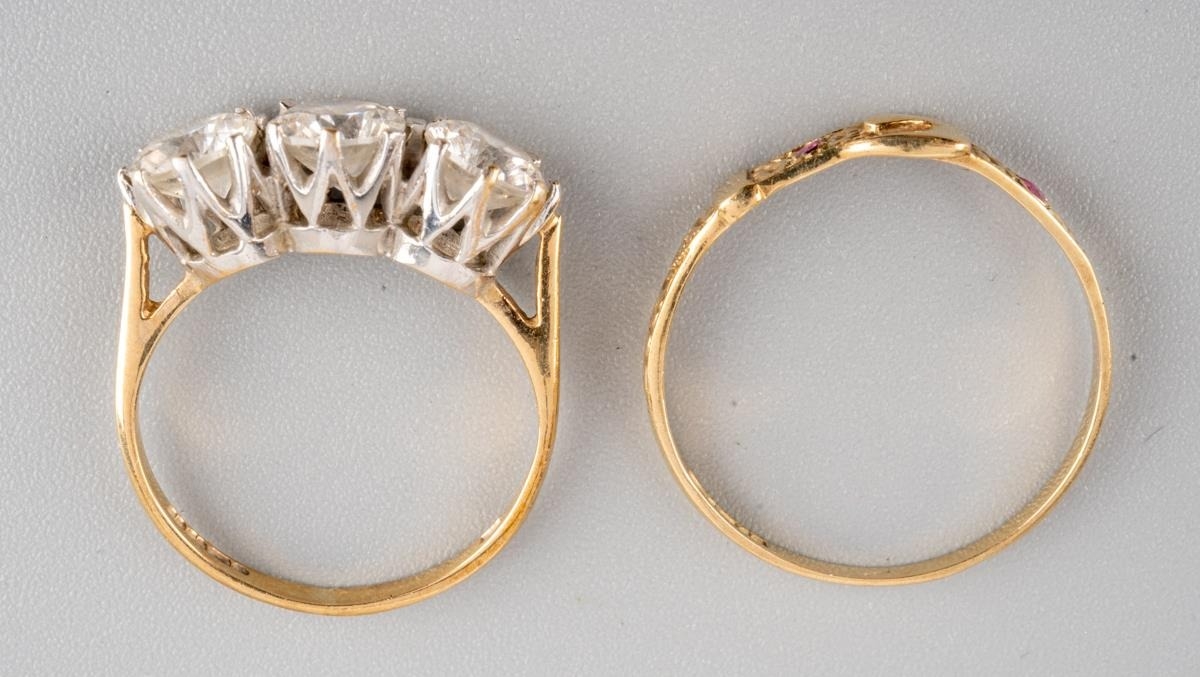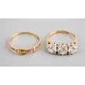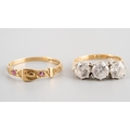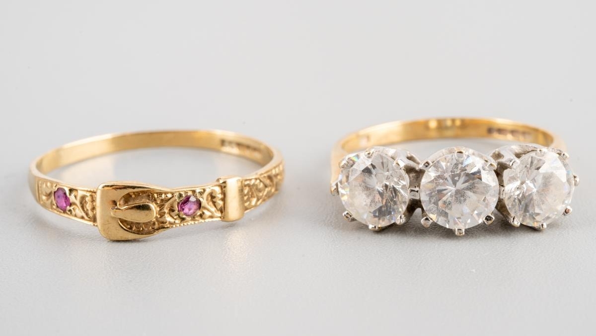 Two 9 ct gold rings, one designed as a buckle, UK size P, other set with 3 CZ UK size J 1/2, gross weight for two approx. 3.3g