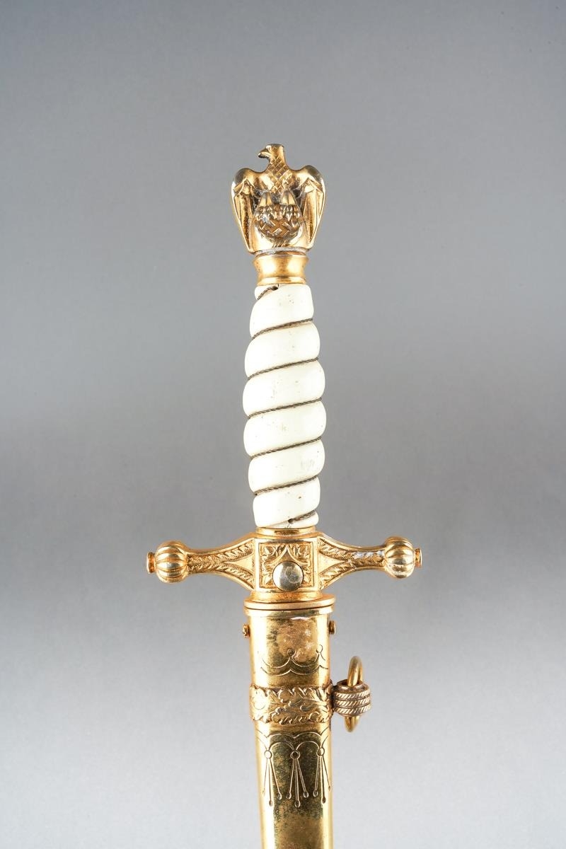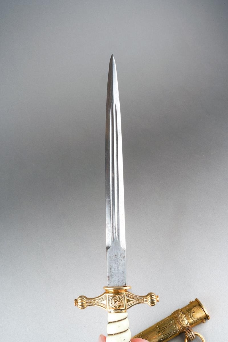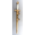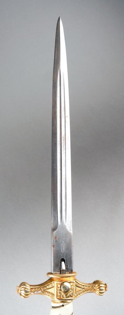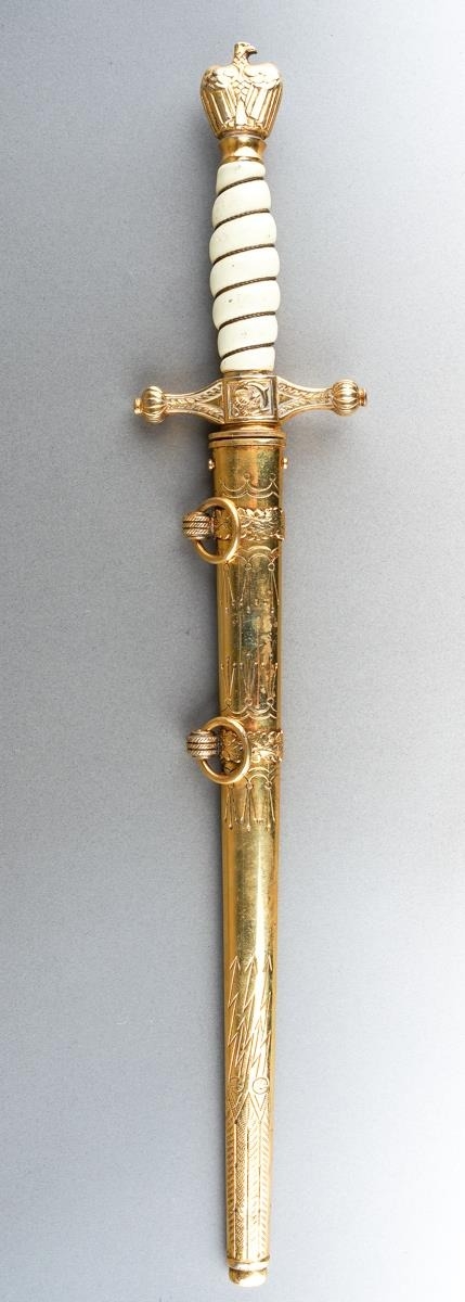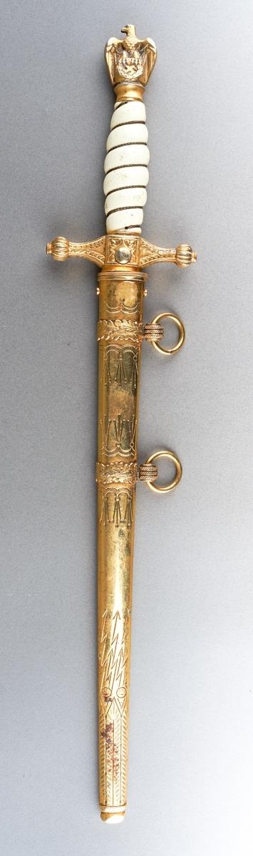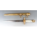 WW2 Third Reich Kreigsmarine Officers Dagger with double fullered plain blade 240mm in length, maker marked "Alcoso, Solingen". White grip with grip wire. Overall length 375mm. Complete with Lightening pattern scabbard.