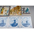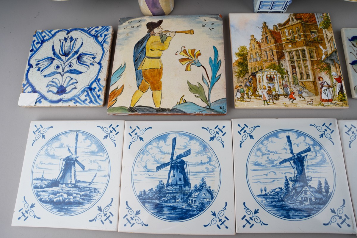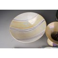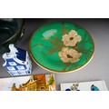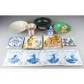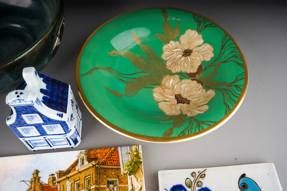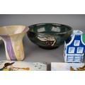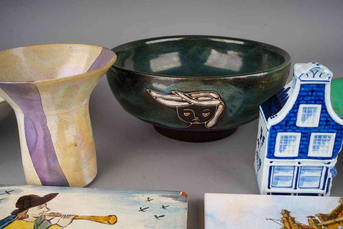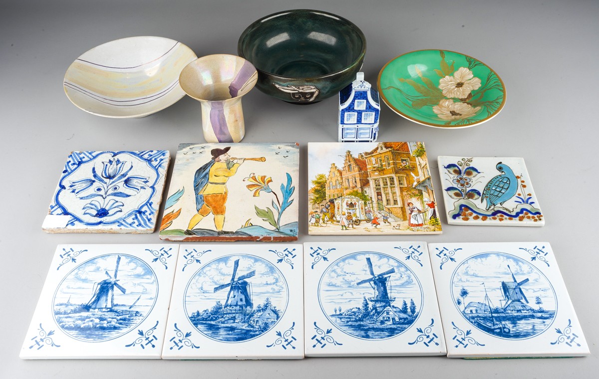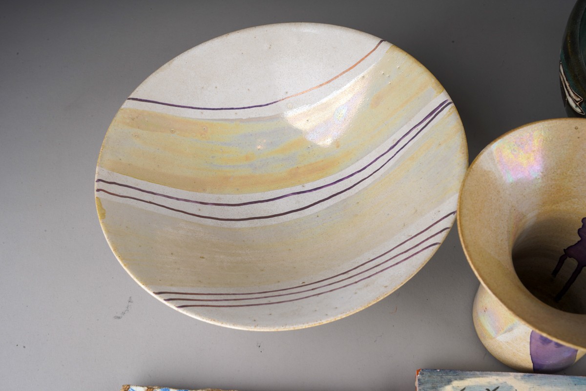 A collection of 20th century ceramics and assorted tiles, two studio pottery iridescent glaze items, a green ground Rosenthal bowl, etc (13)