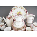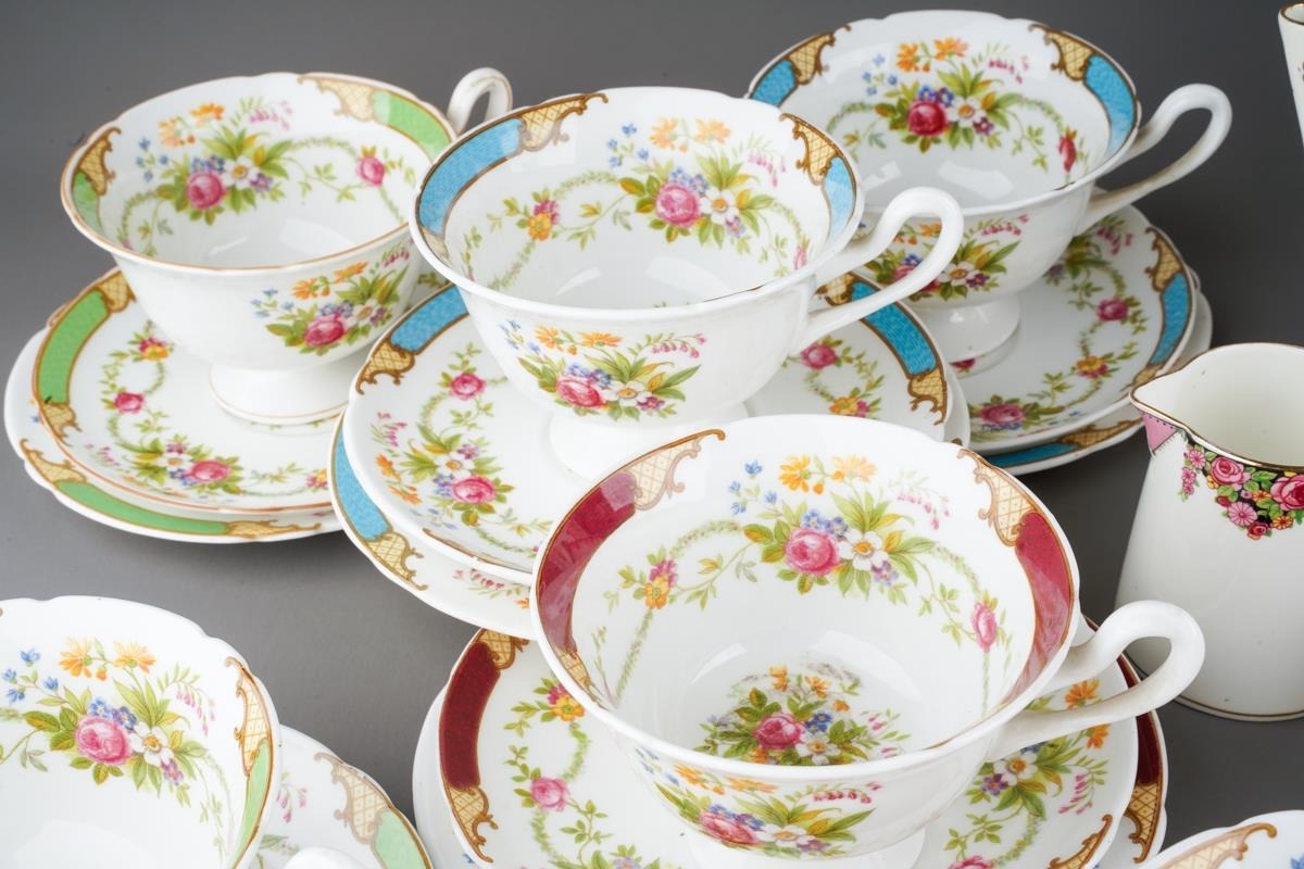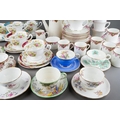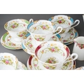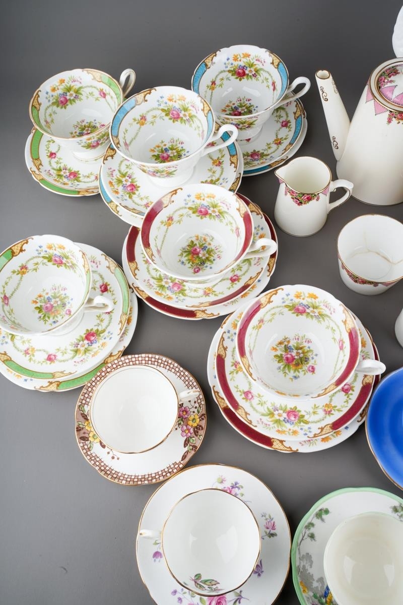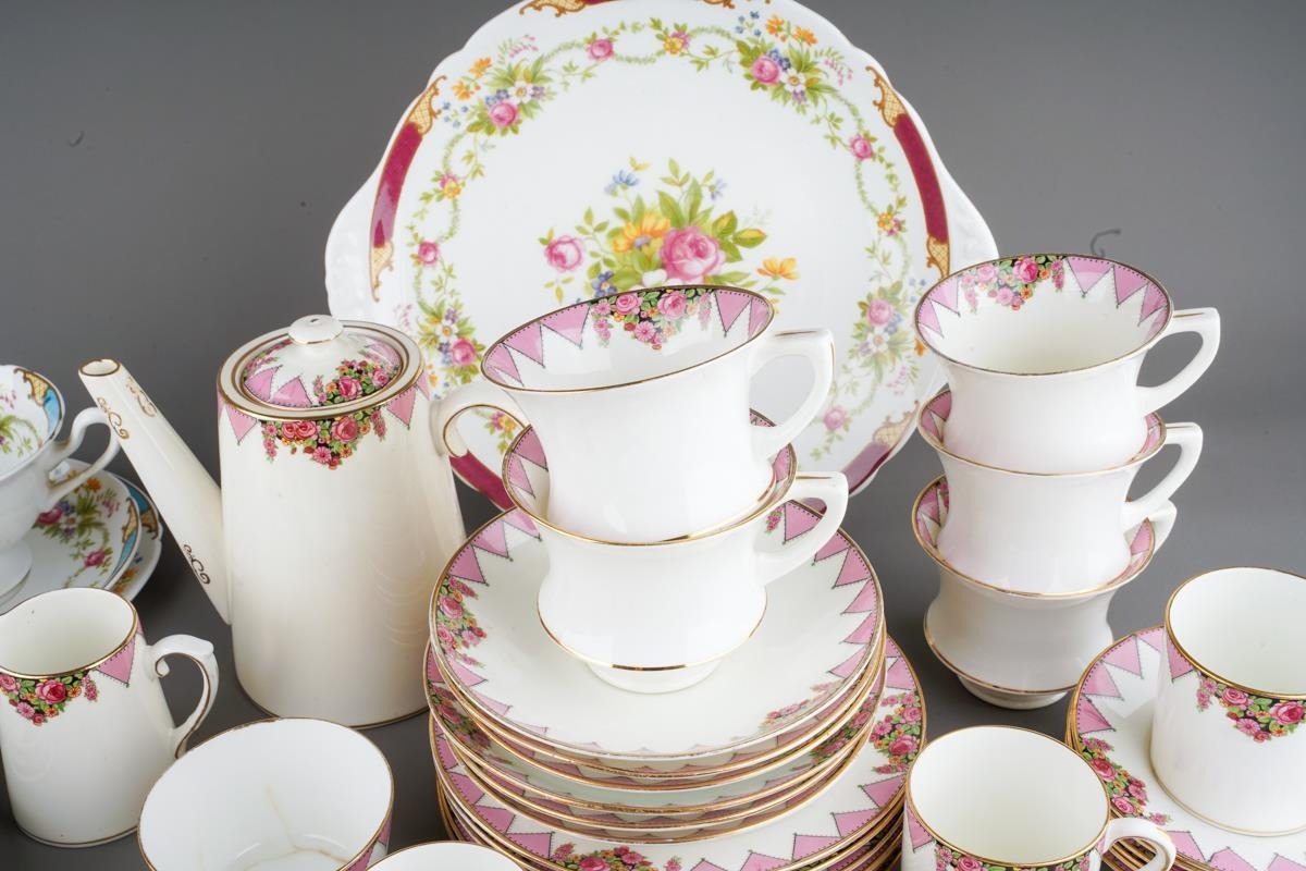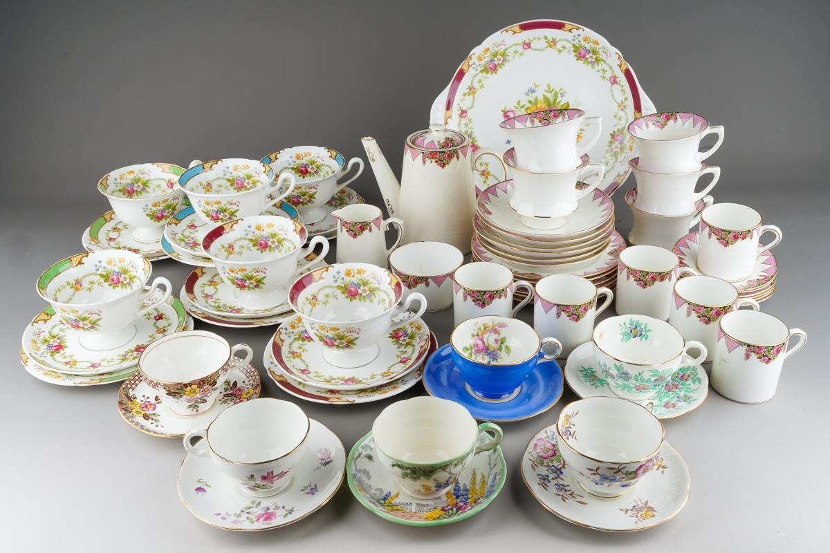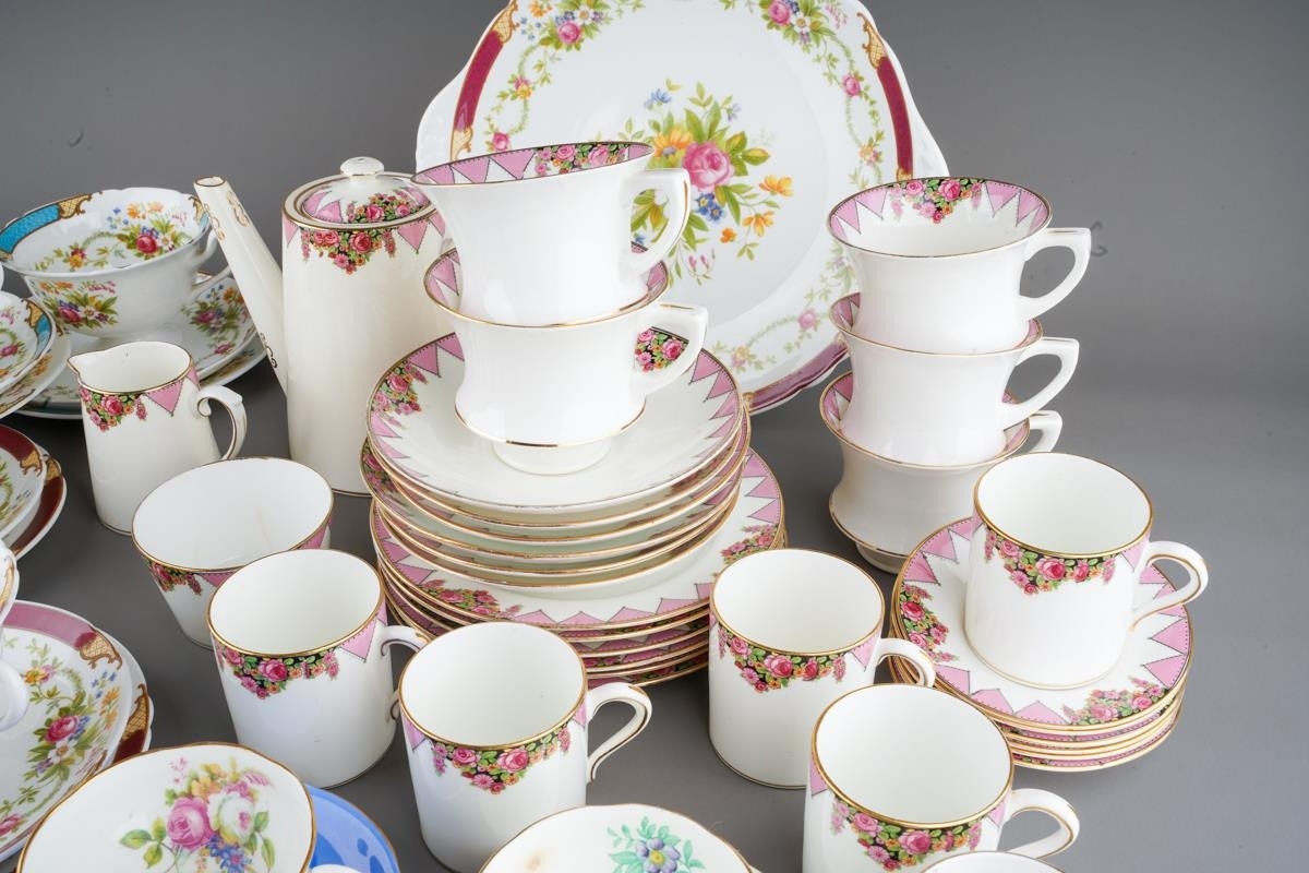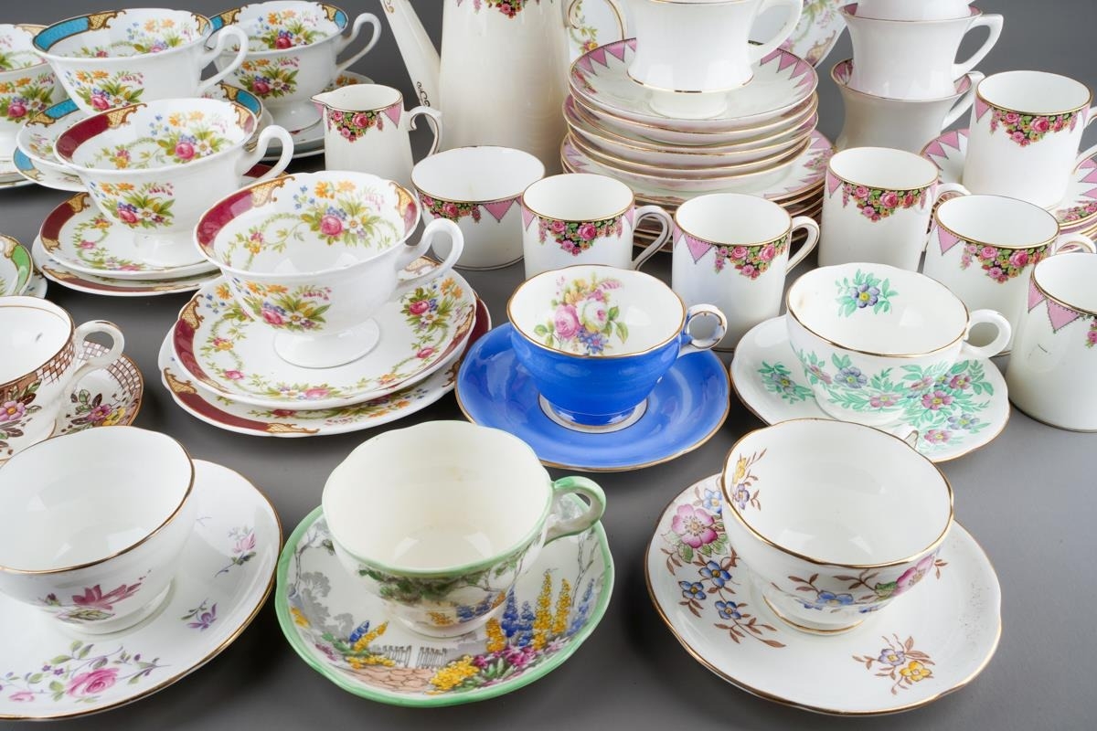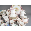 A box of assorted Shelley, Paragon and Adderley tea and coffee wares, comprising a Shelley Dubarry harlequin nineteen piece tea set, a Paragon thirty-two piece part tea and coffee service and six Addertley individual coffee cups and saucers, s.d. to a small number of pieces (1 box)