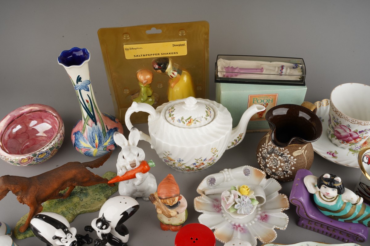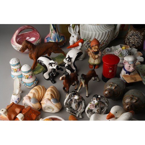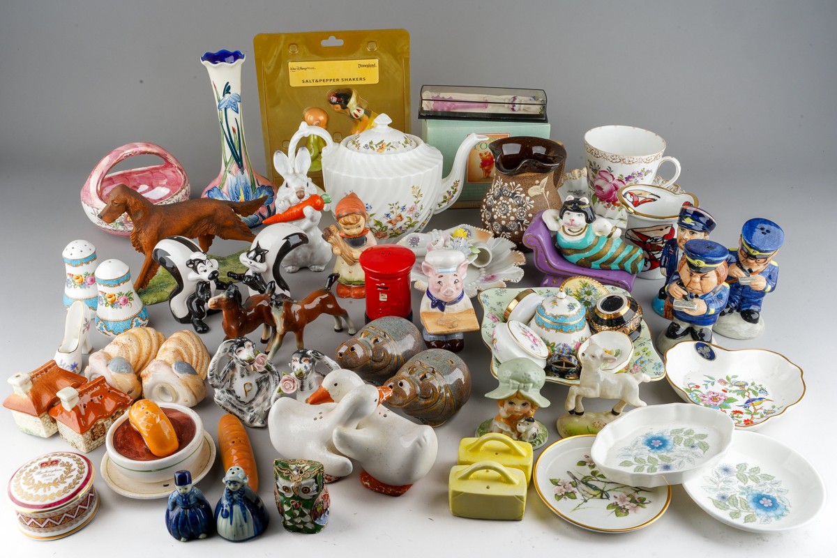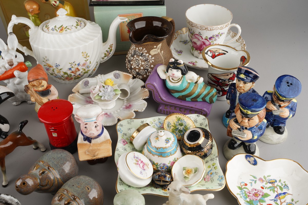 Assorted British and Continental ceramics including teaware, table ornaments, vases, novelty condiments etc,. a Maling Peony Rose 6562 bon bon basket, a Old Tupton ware tube lined Iris vase (2 boxes)