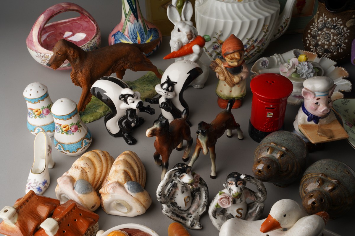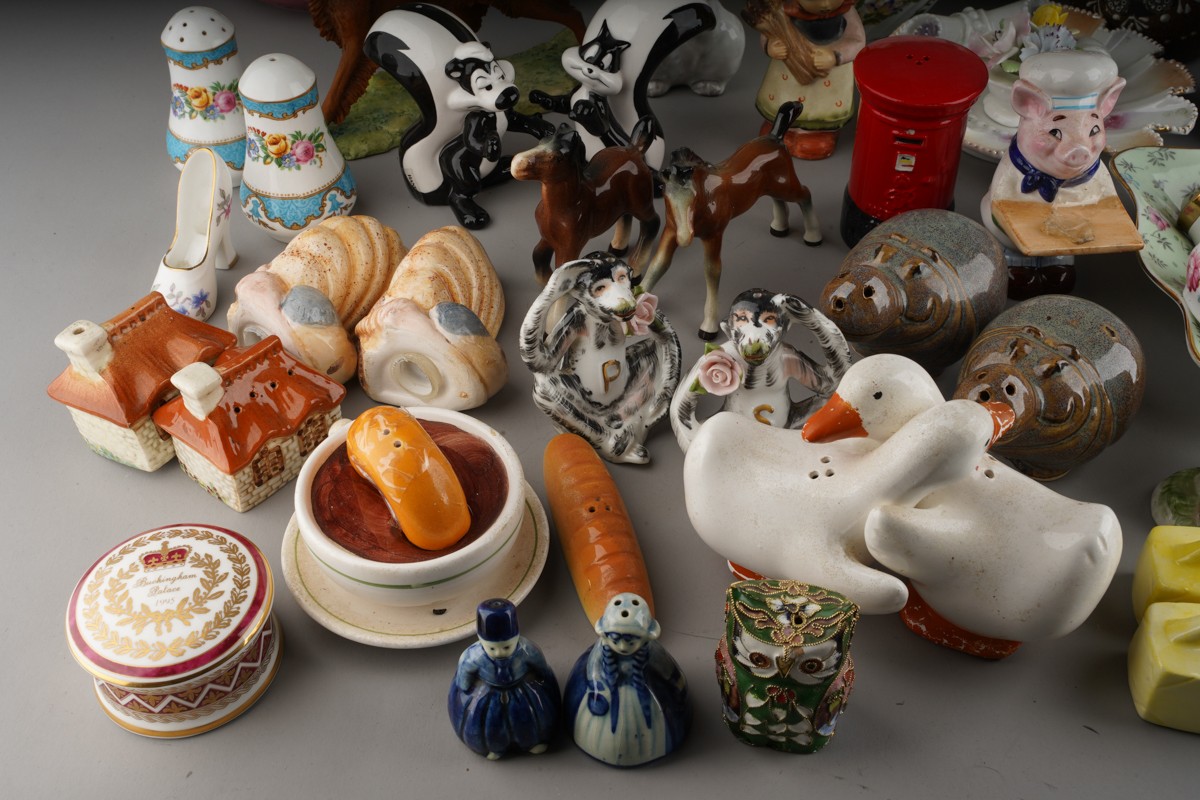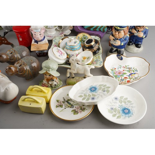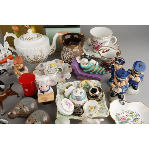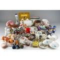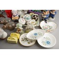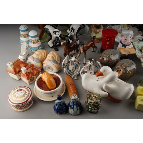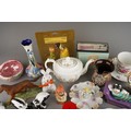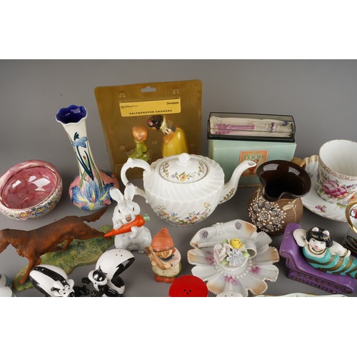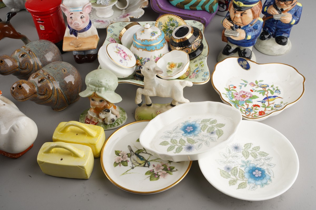 Assorted British and Continental ceramics including teaware, table ornaments, vases, novelty condiments etc,. a Maling Peony Rose 6562 bon bon basket, a Old Tupton ware tube lined Iris vase (2 boxes)