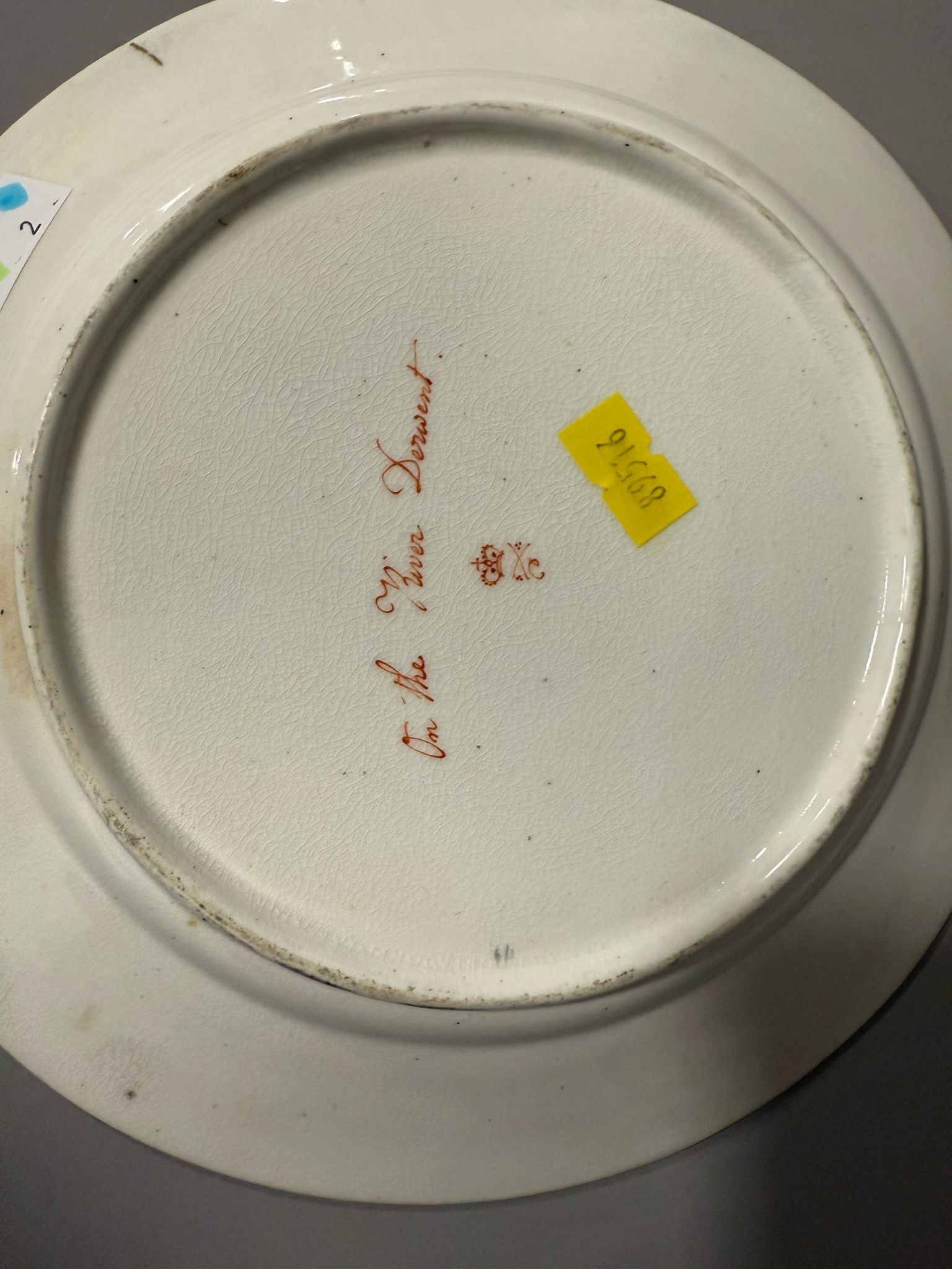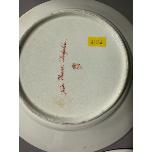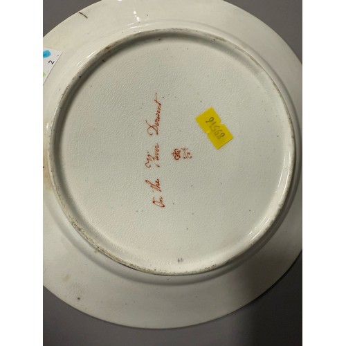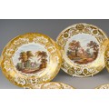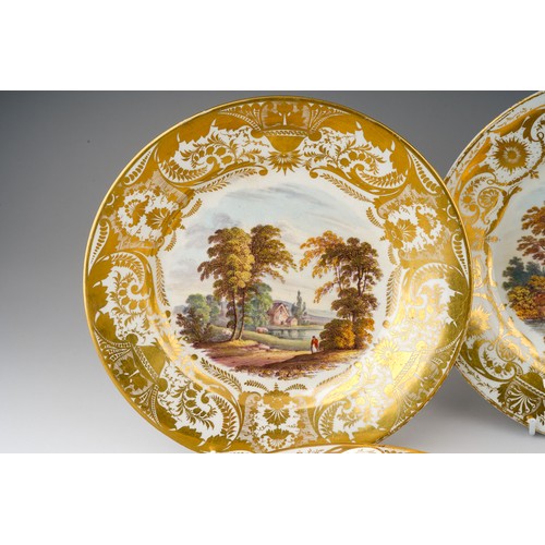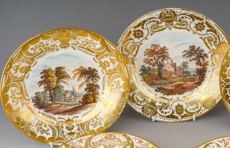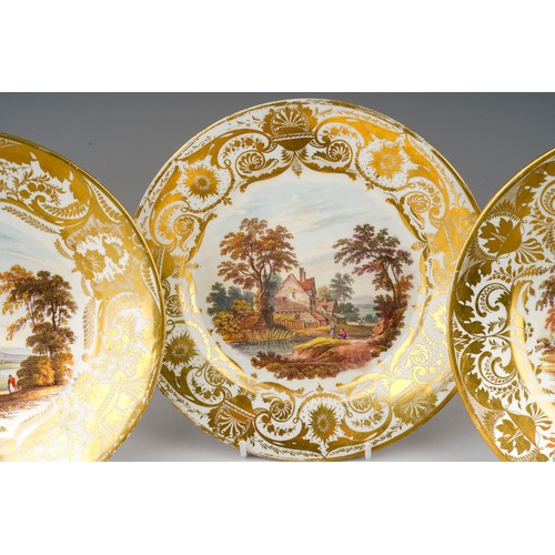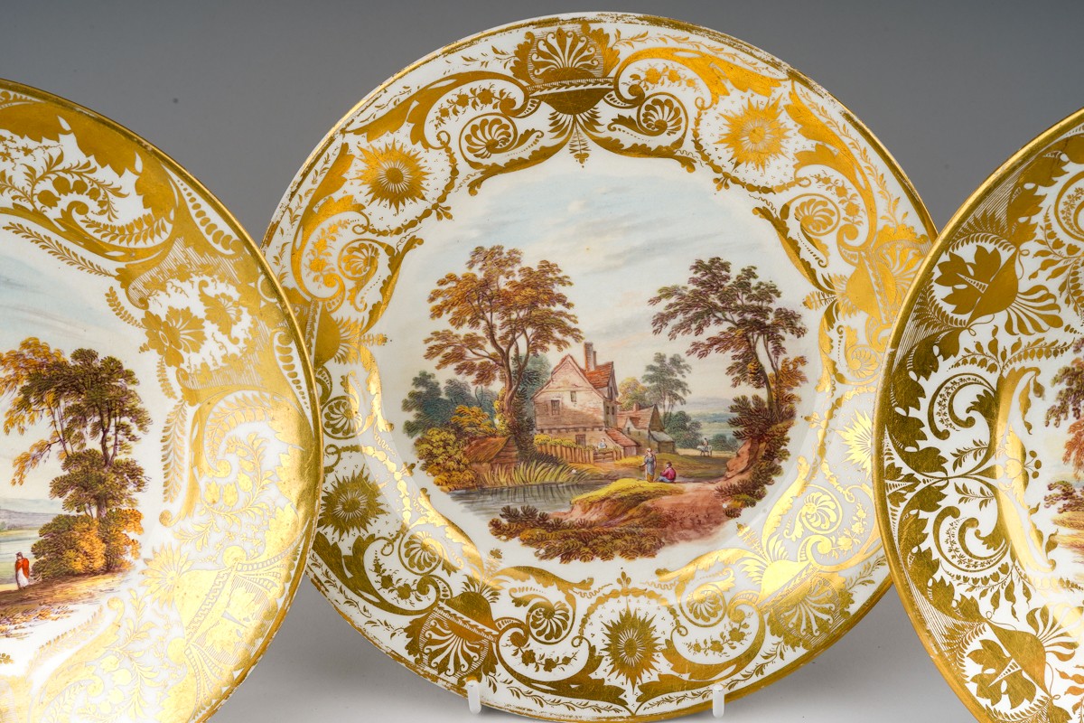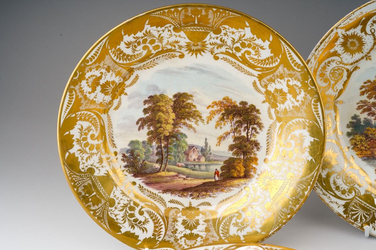 Two early 19th Century Derby plates both with gilt acanthus and urn sweeping borders, one reserve painted with river cottage river and a figure and cattle to foregound titled "On the River Derwent" and numbered 79?; the other plate painted with figures by river with houses and figure on horse beyond titled "Near Barrow Derbyshire" and numbered 76, both with red factory marks, circa 1815., approx 22.5cm diam [2]