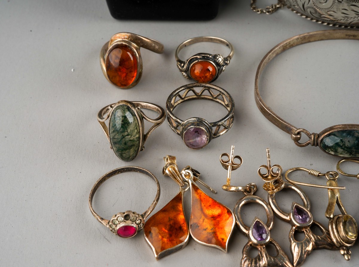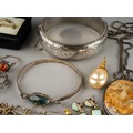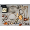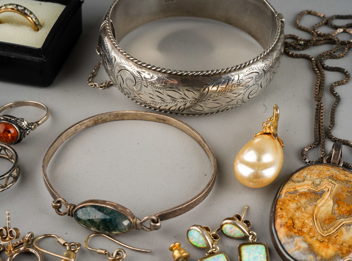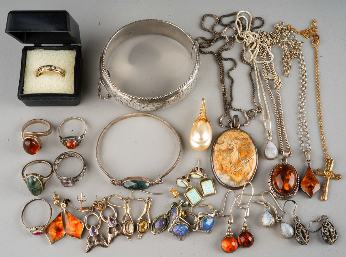 A small quantity of gold and silver jewellery, including a 9ct gold crucifix on a chain stamped 9ct with base metal link at clasp, gross weight 1.6 grams, an eternity ring stamped 9ct, UK ring size K, 2.78 grams, a hallmarked silver bangle and a collection of assorted jewellery stamped 925, gross weight of white metal / silver 4.45ozt, 138.4 grams (parcel)