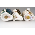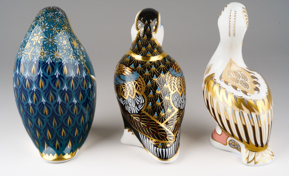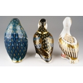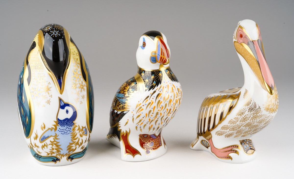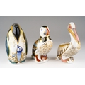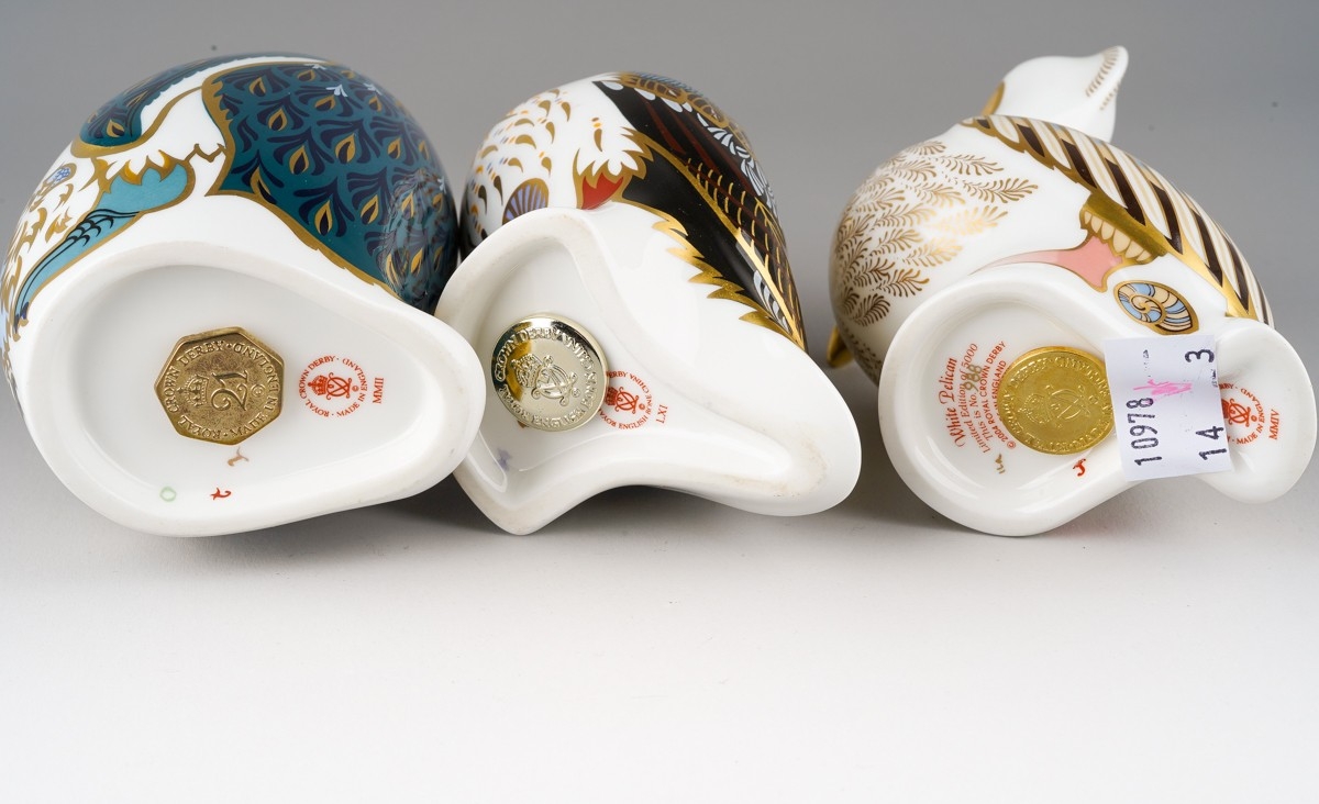 Three Royal Crown Derby paperweights of bird form, comprising limited edition "White Pelican" no.988 of 5000, a Penguin and chick and a Puffin, all first quality with gold stoppers, puffin stopper is pale gold, height of tallest 12cm, all in good condition (3)