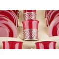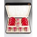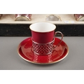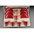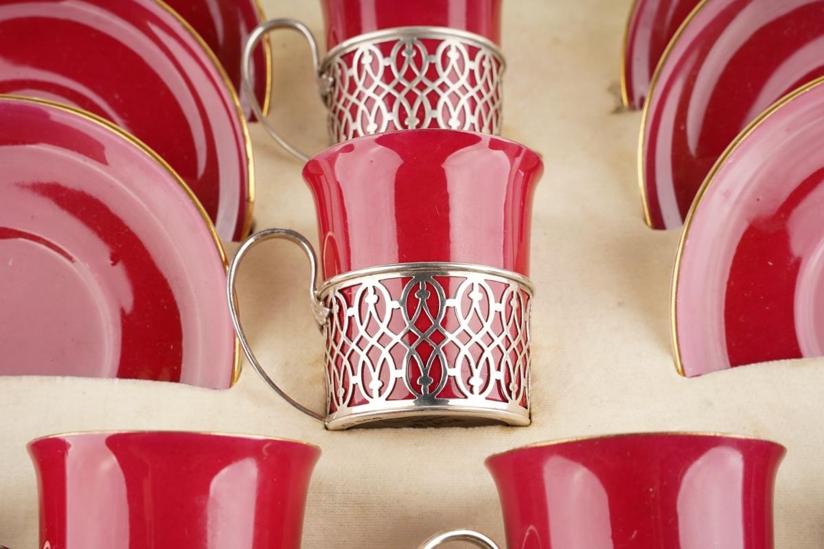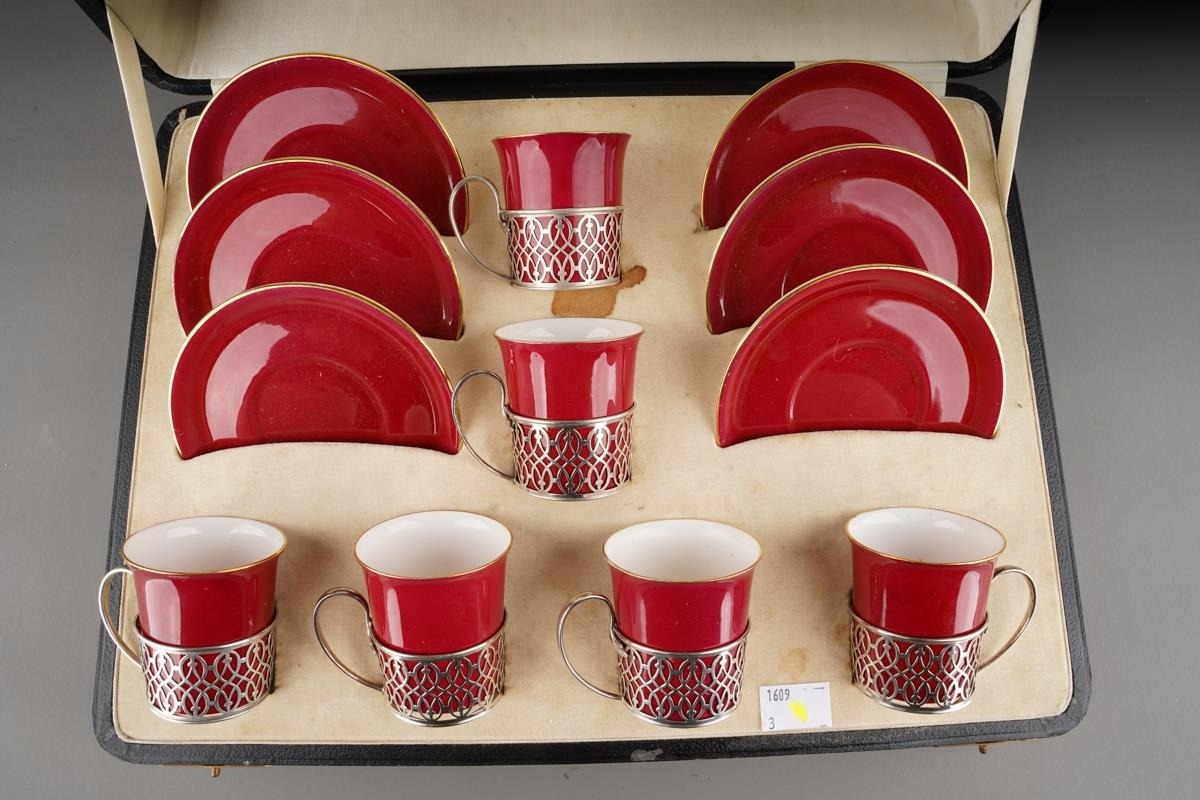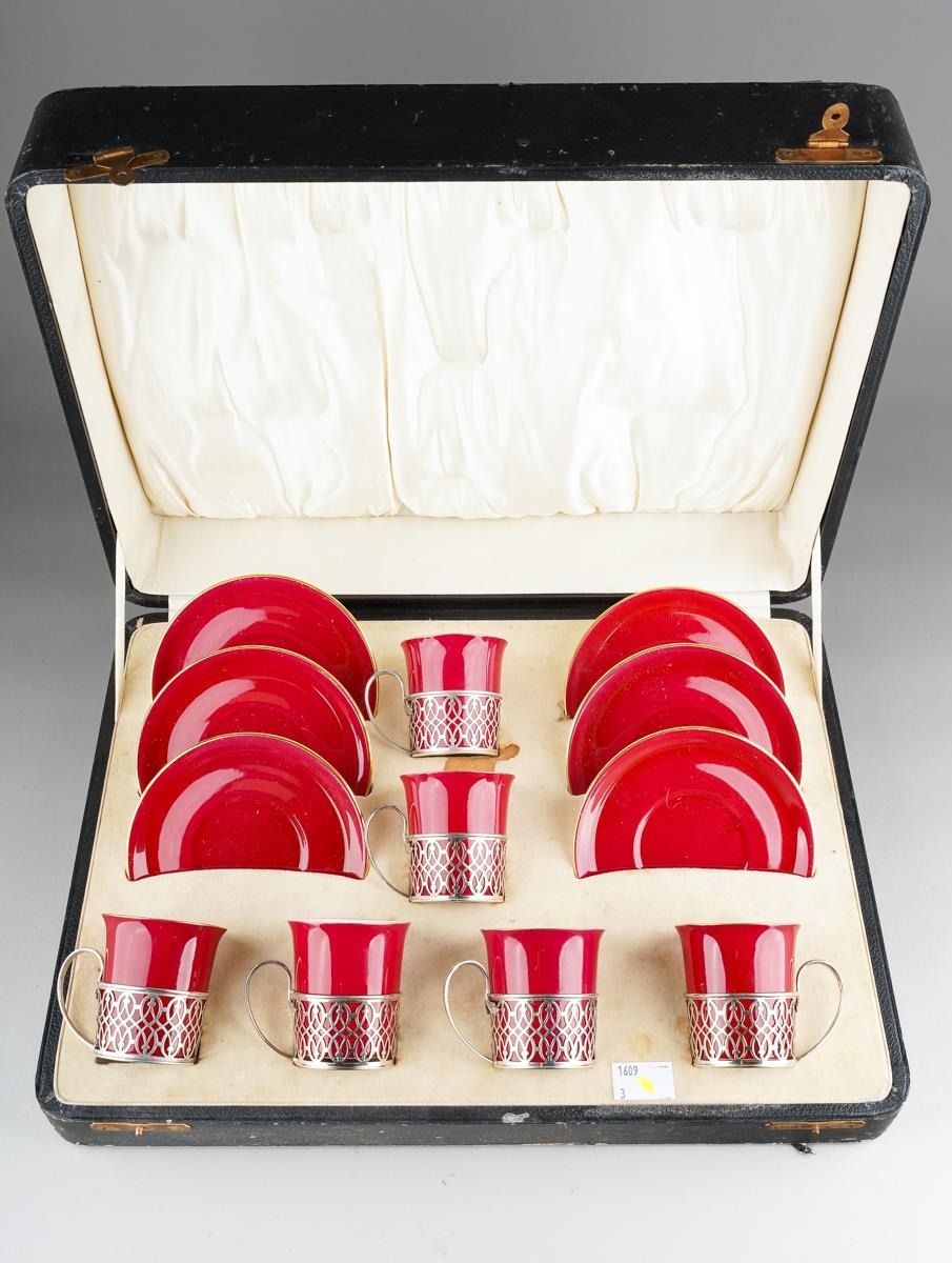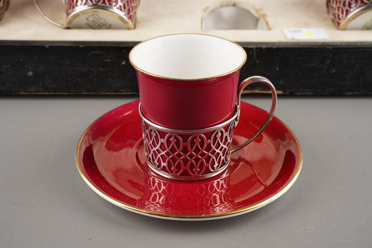 A Cased Set of Six George V Silver-Mounted Coffee-Cups and Saucers, Pierced Silver Mounts ,The Porcelain by Shelley, each dark red/ maroon ground cup with openwork silver frame, the saucers plain circular, in fitted gilt-tooled black covered case, the case 38cm wide