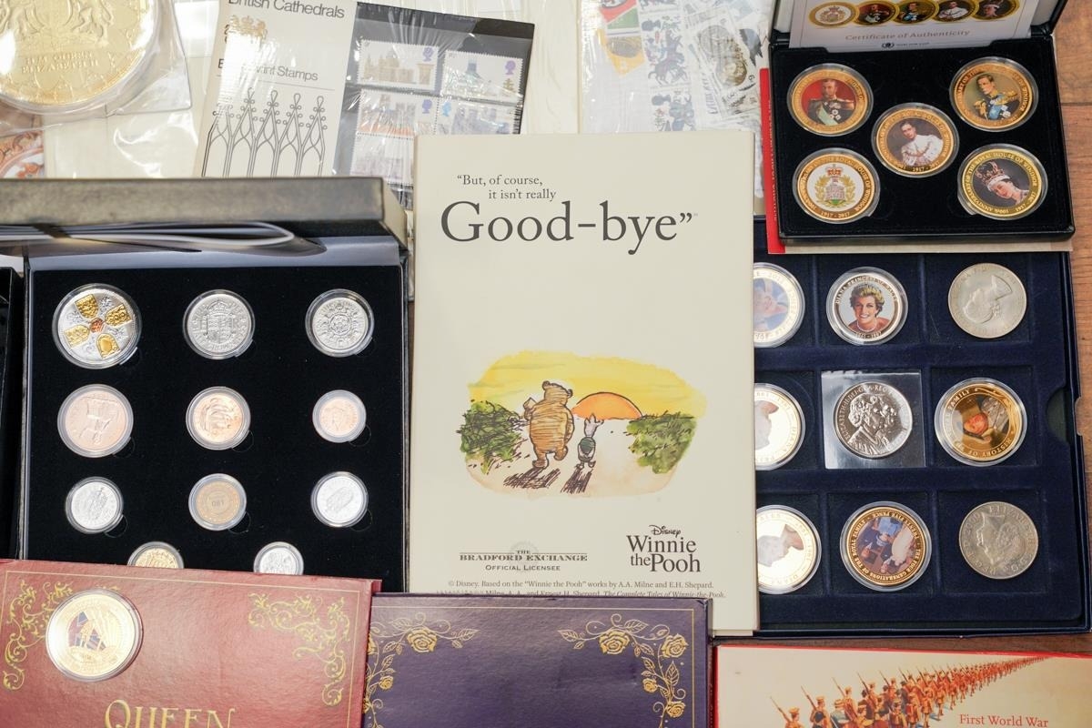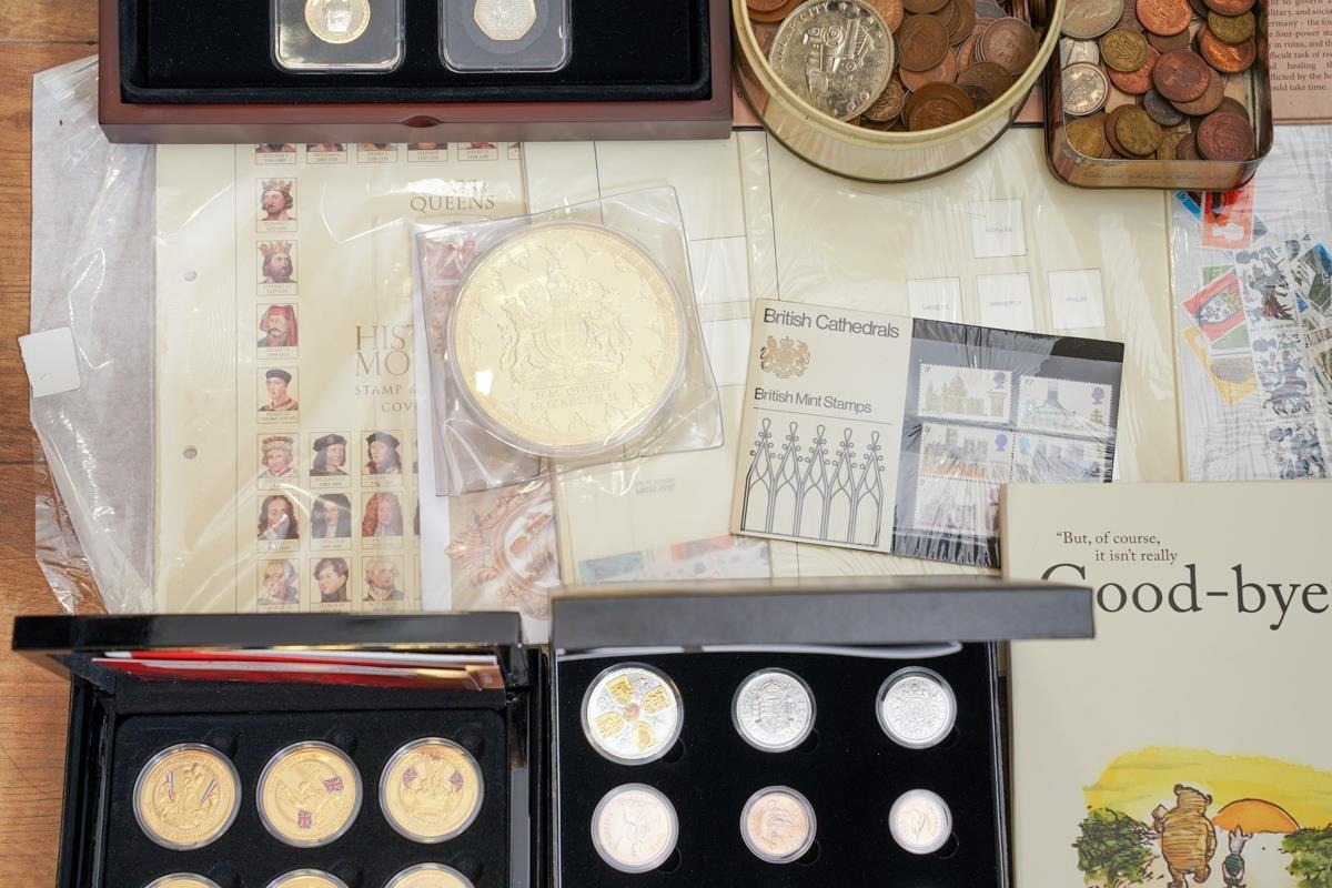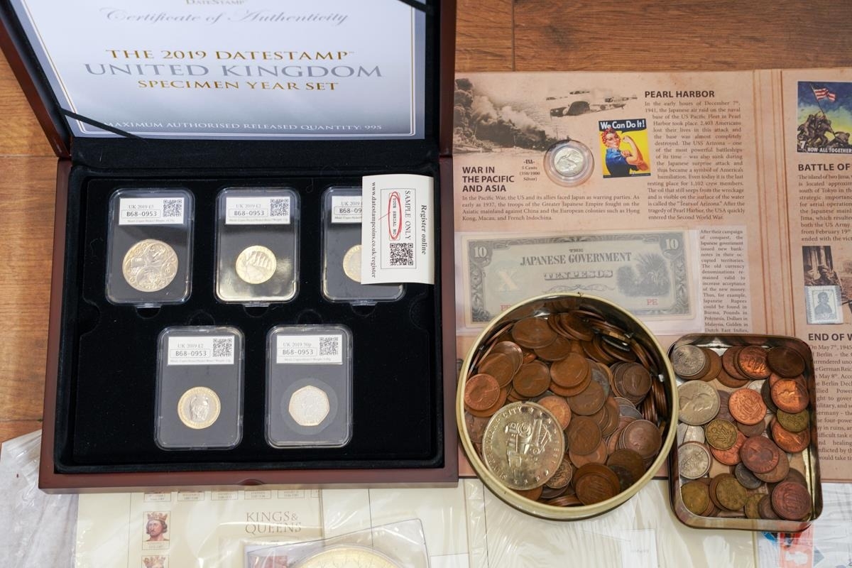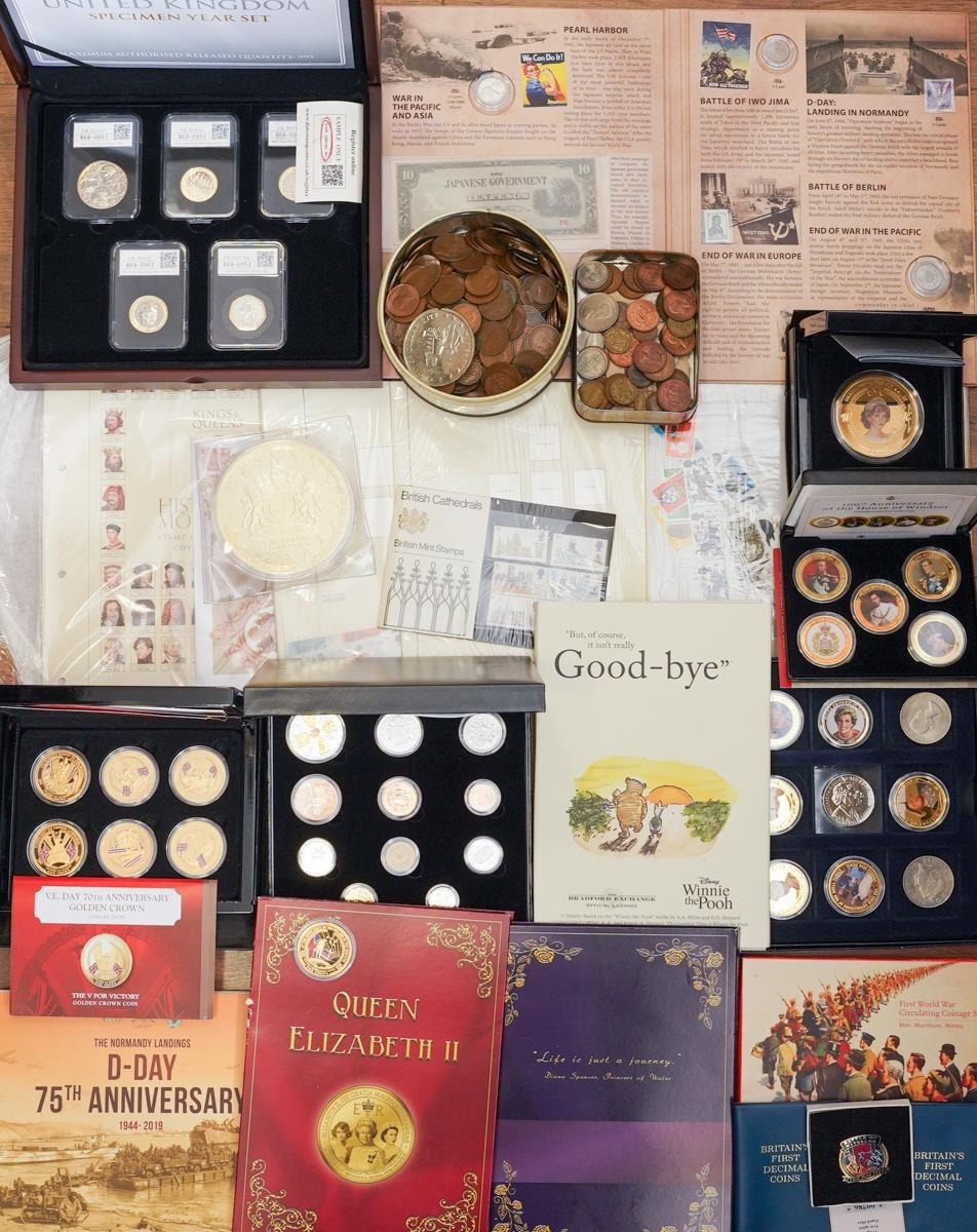 A box of assorted commemorative and circulated coins and stamps, in presentation packs and loose, including a cased 'The 2019 Datestamp United Kingdom Specimen Year Cash', comprising £5, £2 x3 and a 50p, with certificates, six Winnie the Pooh 50p, Royal commemoratives, World War I and World war II commemoratives, loose circulated British and foreign coins, etc (1 box)