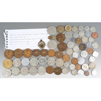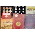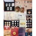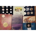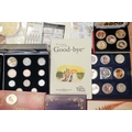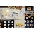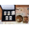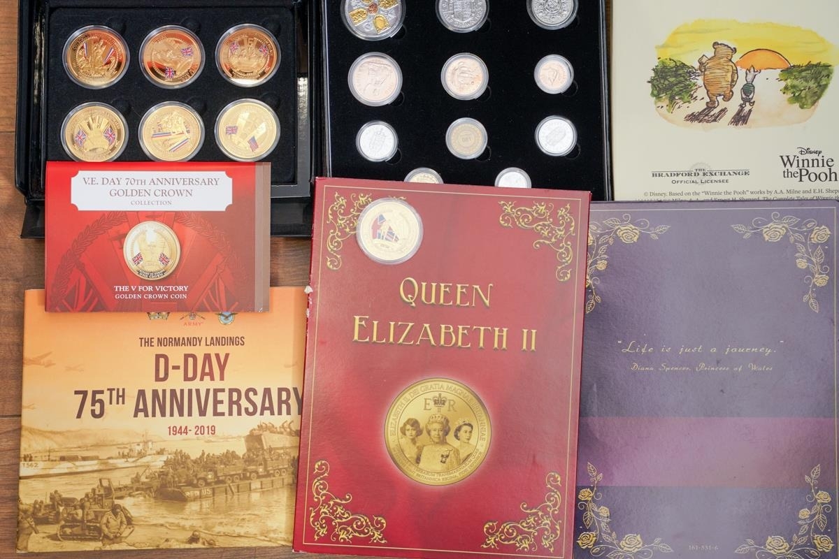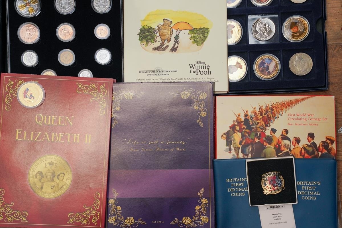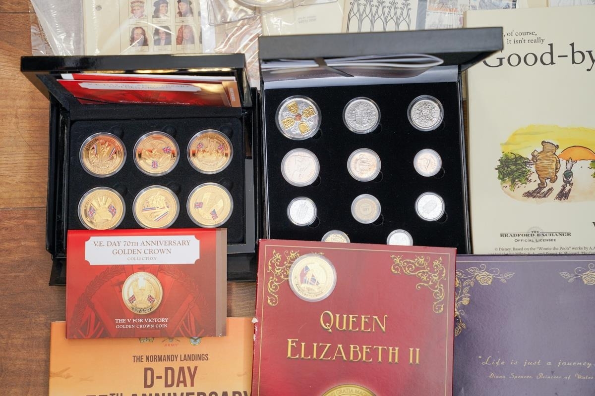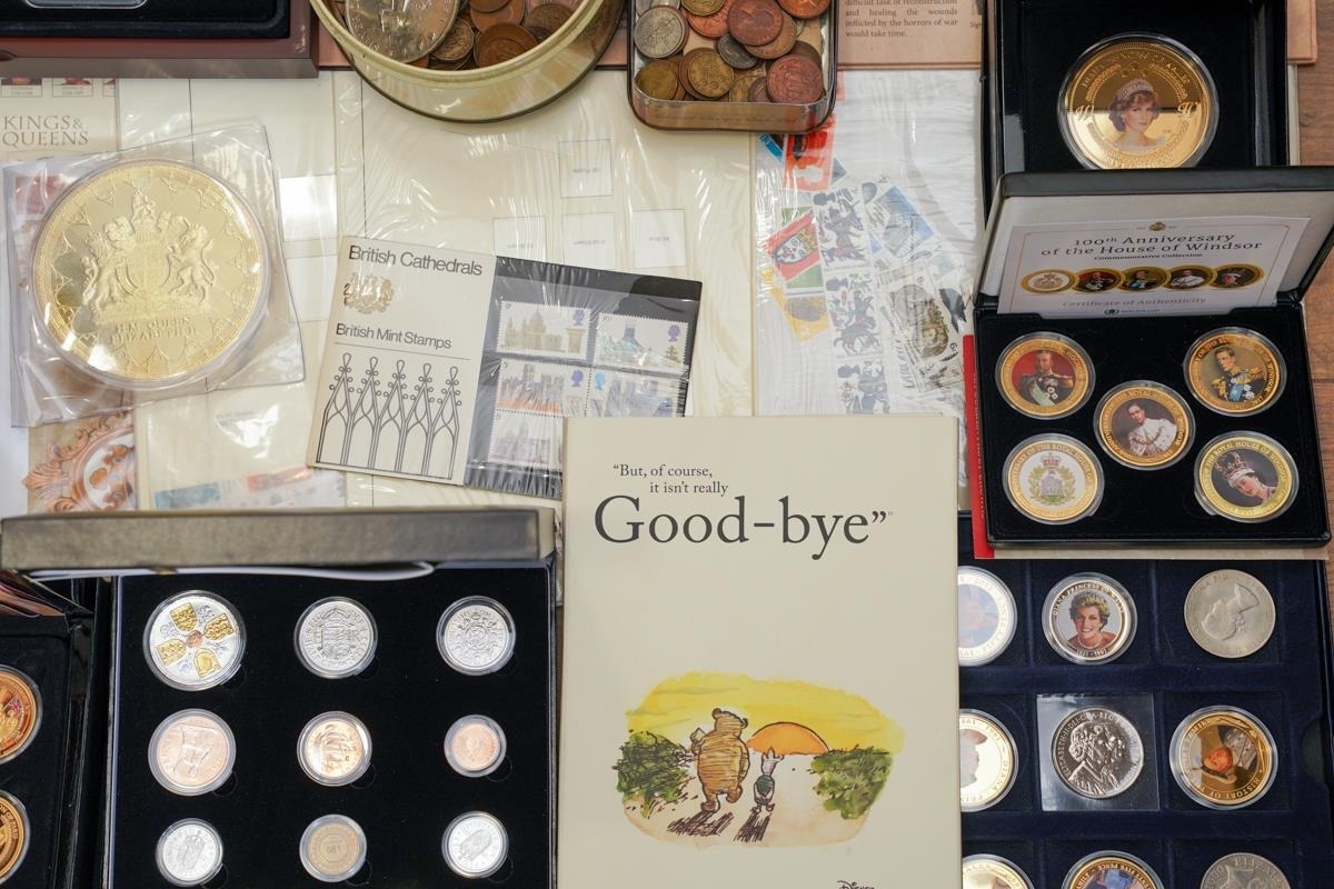 A box of assorted commemorative and circulated coins and stamps, in presentation packs and loose, including a cased 'The 2019 Datestamp United Kingdom Specimen Year Cash', comprising £5, £2 x3 and a 50p, with certificates, six Winnie the Pooh 50p, Royal commemoratives, World War I and World war II commemoratives, loose circulated British and foreign coins, etc (1 box)