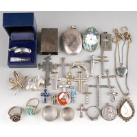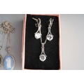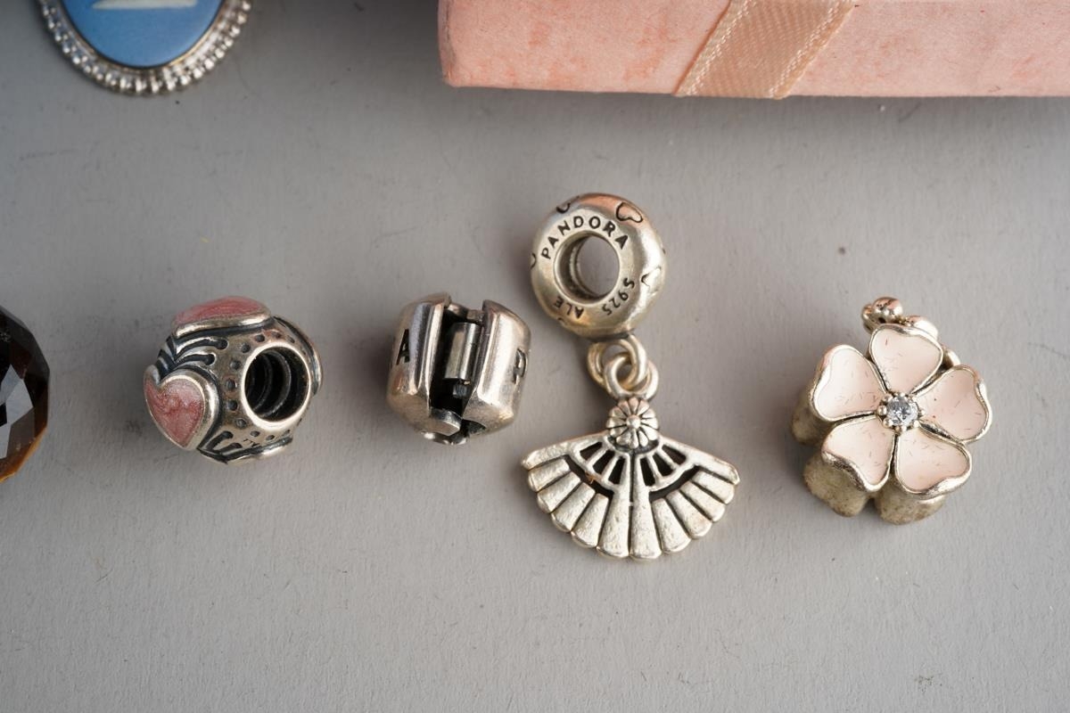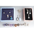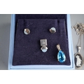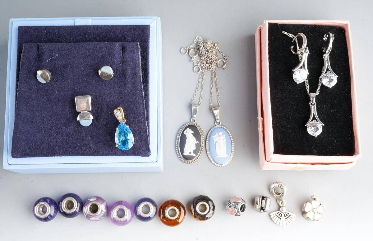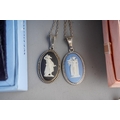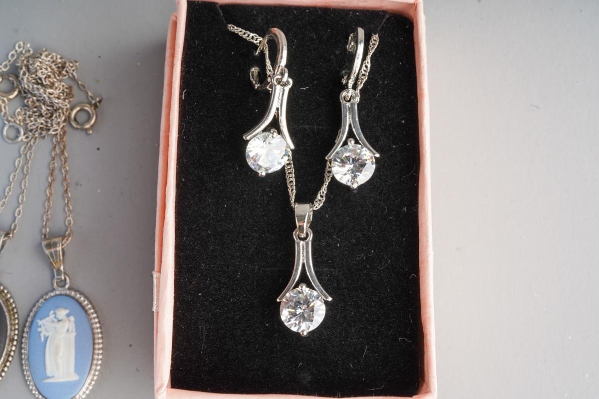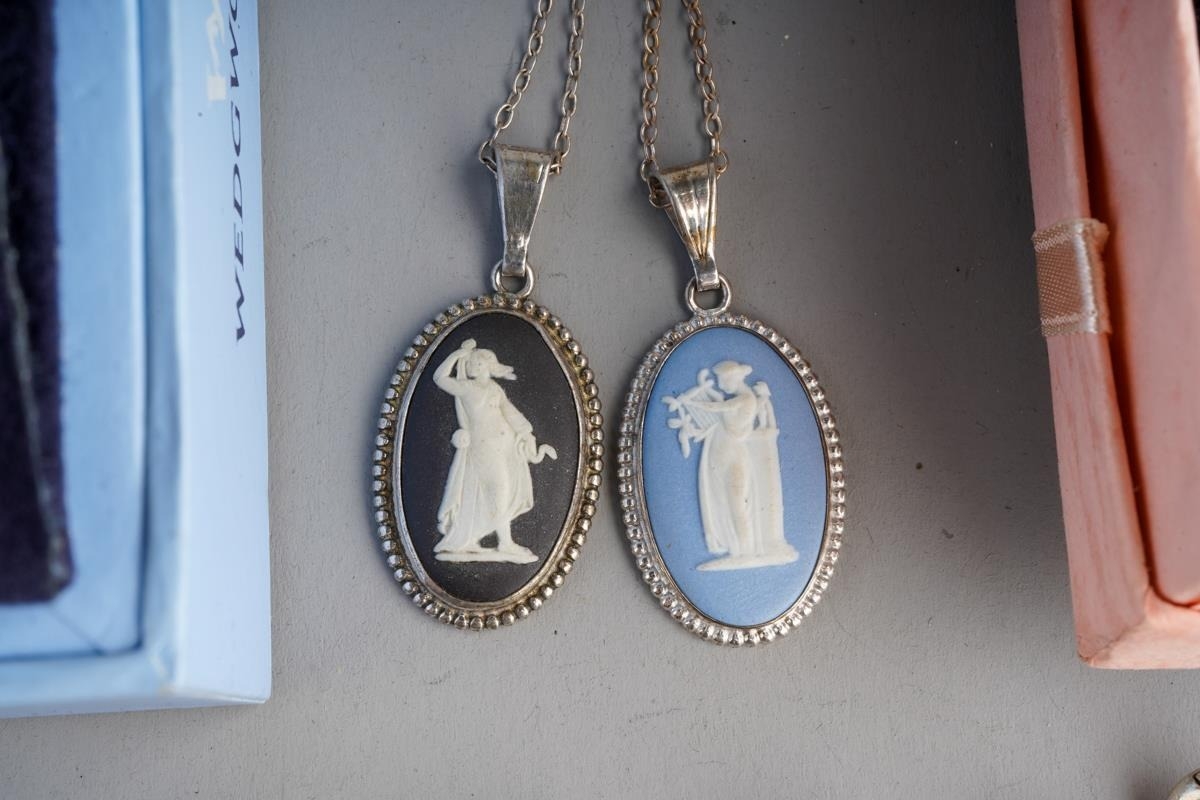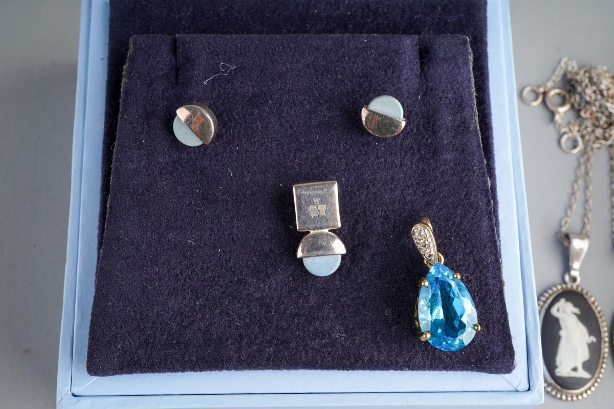 A 9ct gold mounted blue stone (Topaz?) drop pendant, stamped, approx gross weight 2.7 grams together with two Wedgwood jasparware Classical oval plaque necklaces with silver mounts and chains together with a pair of Wedgwood silver mounted earrings and pendant with blue jasperware discs; further jewellery includes pair of diamante drop earrings with matching pendant and miscellaneous glass or plated charms (1 bag)