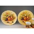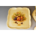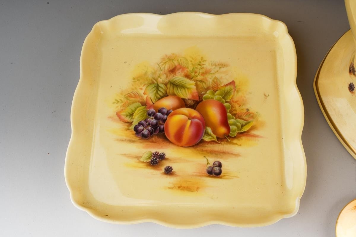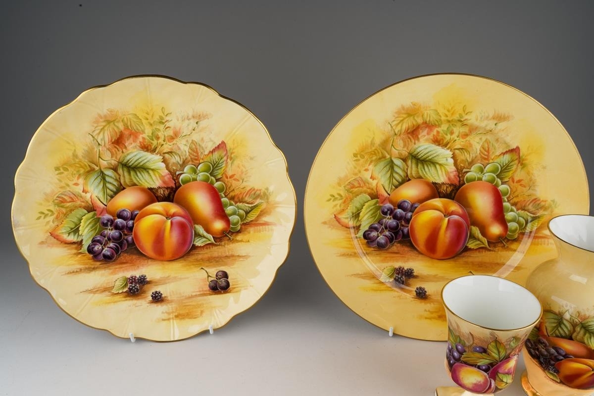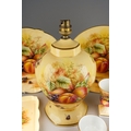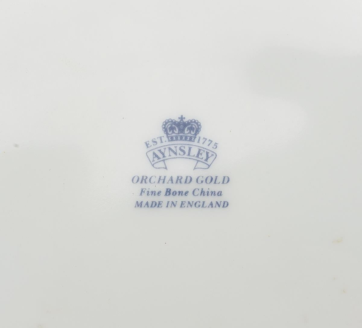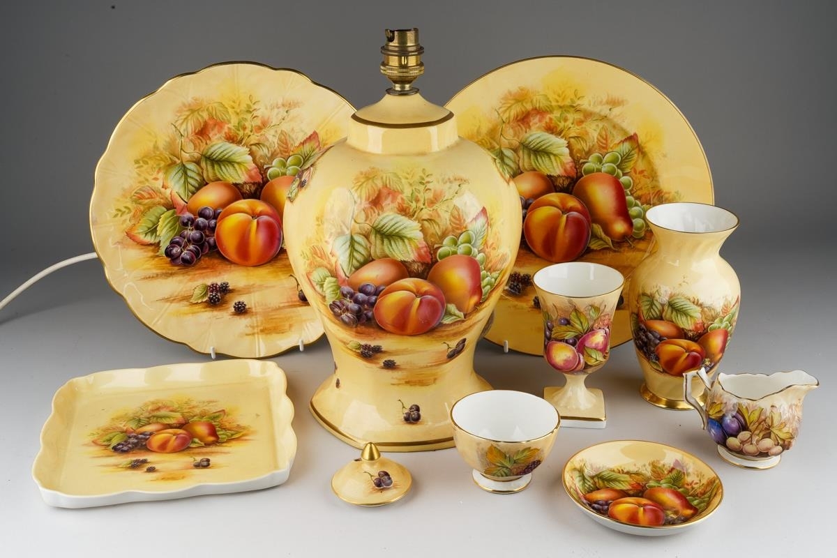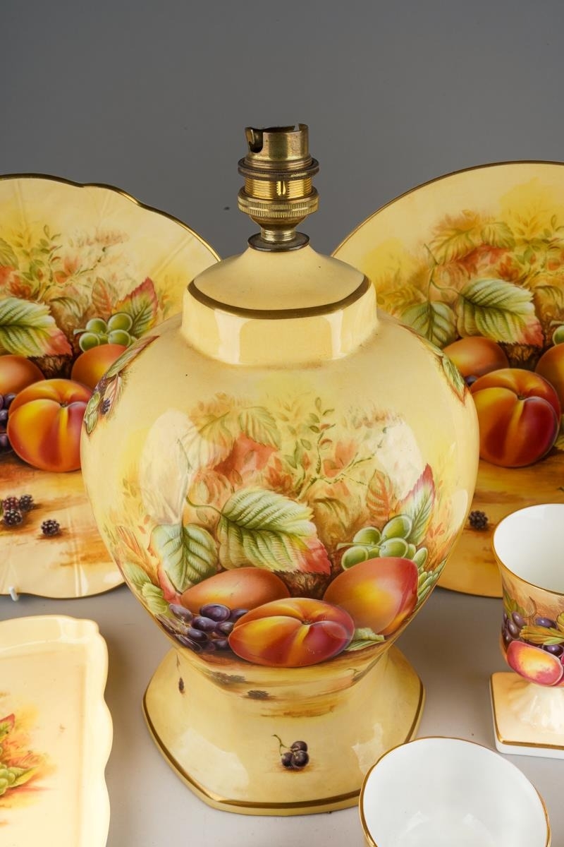A group of Aynsley "Orchard Gold" to include large table lamp, a scalloped cabinet plate, circular cabinet plate, square serving dish, baluster vase and bon bon dish togethe with similar Aynsley posy vase, mik jug and sugar bowl [9]