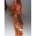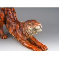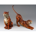 A pair of cold painted bronze tigers, each marked with a B within a vase. After Franz Bergman. Seated tiger stands 21 cm tall, the stretching tiger is approx 32 cm long