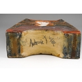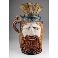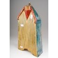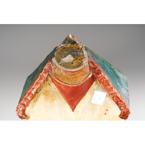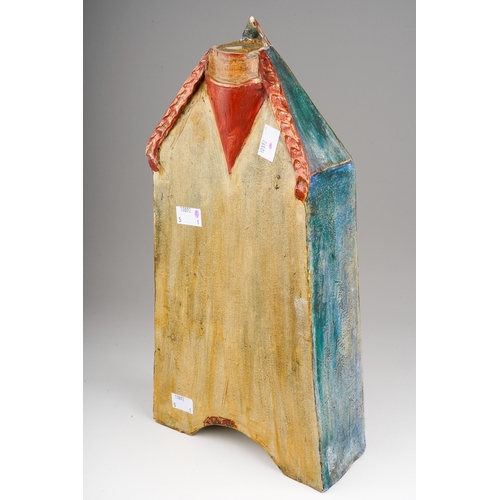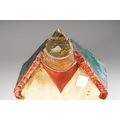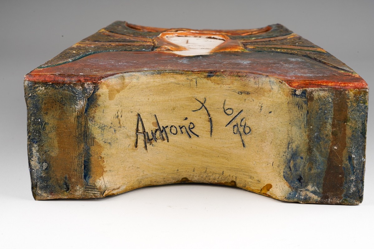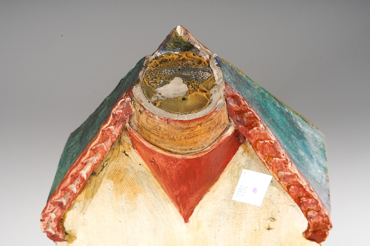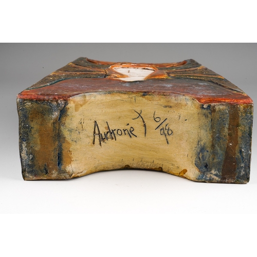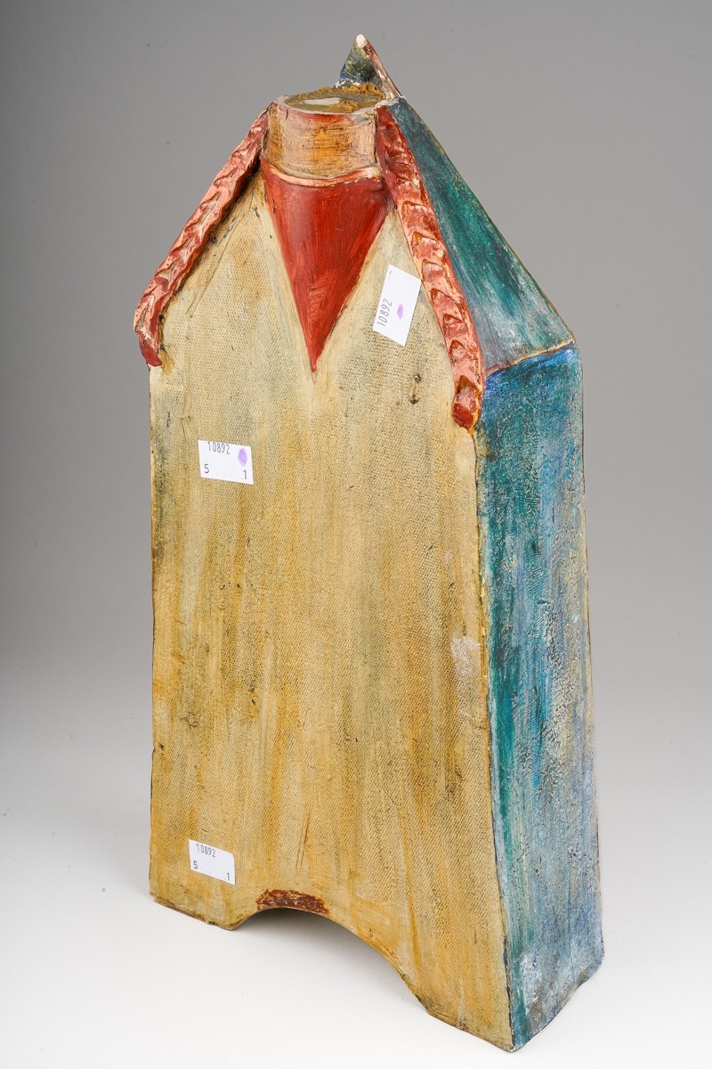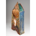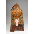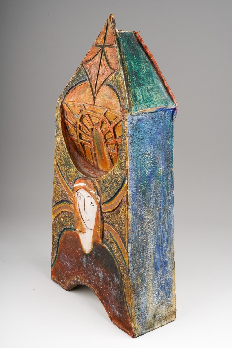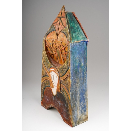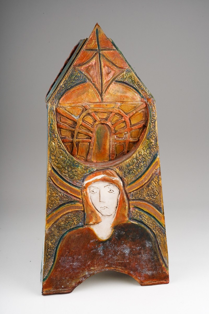 Audrone Berzanskas (Contemporary Lithuanian), studio pottery large centrepiece modelled and incised with Lady below Sun and Cross motif, gilt heightened, signed Audrone 6/98 to underside, approx 40cm high, top section missing
