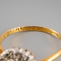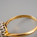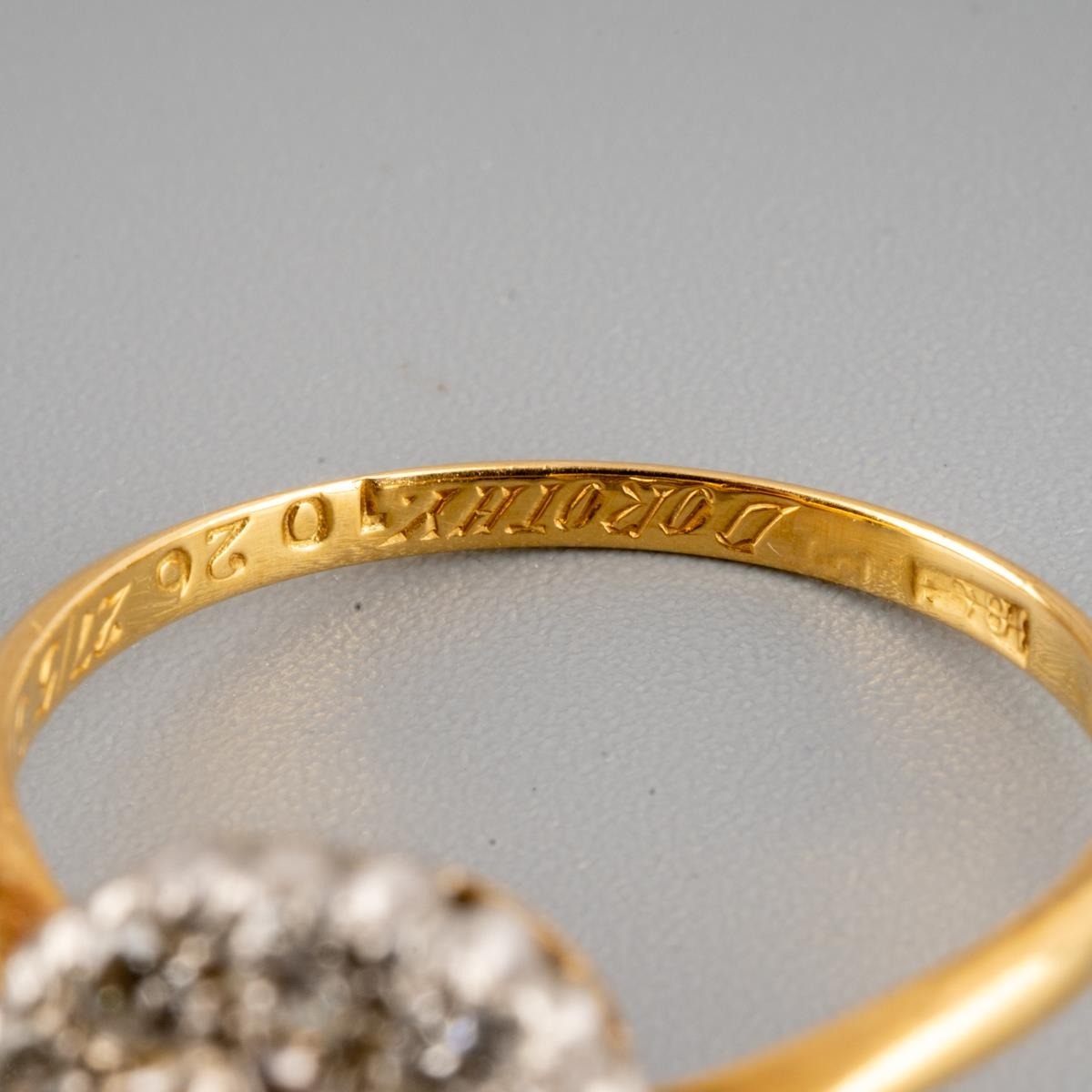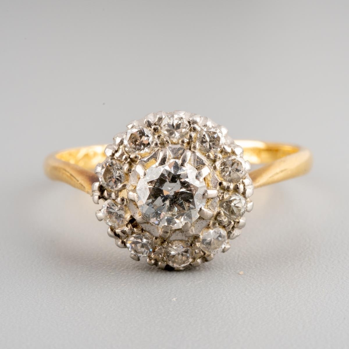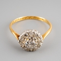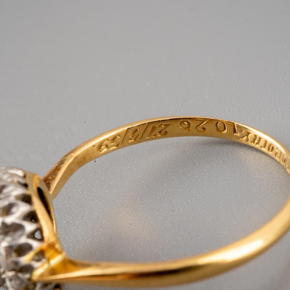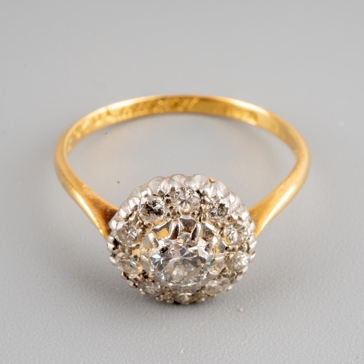 A diamond cluster ring. Set with a transition cut diamond, surrounded by round brilliant cut diamonds, to the plain band, stramped 18ct and personally engraved 'Robert Dorothy 27/5/39, estimated principal diamond weight 0.30ct, estimated total overall diamond weight 0.70ct, approx ring size N, gross weight 2.72 grams.